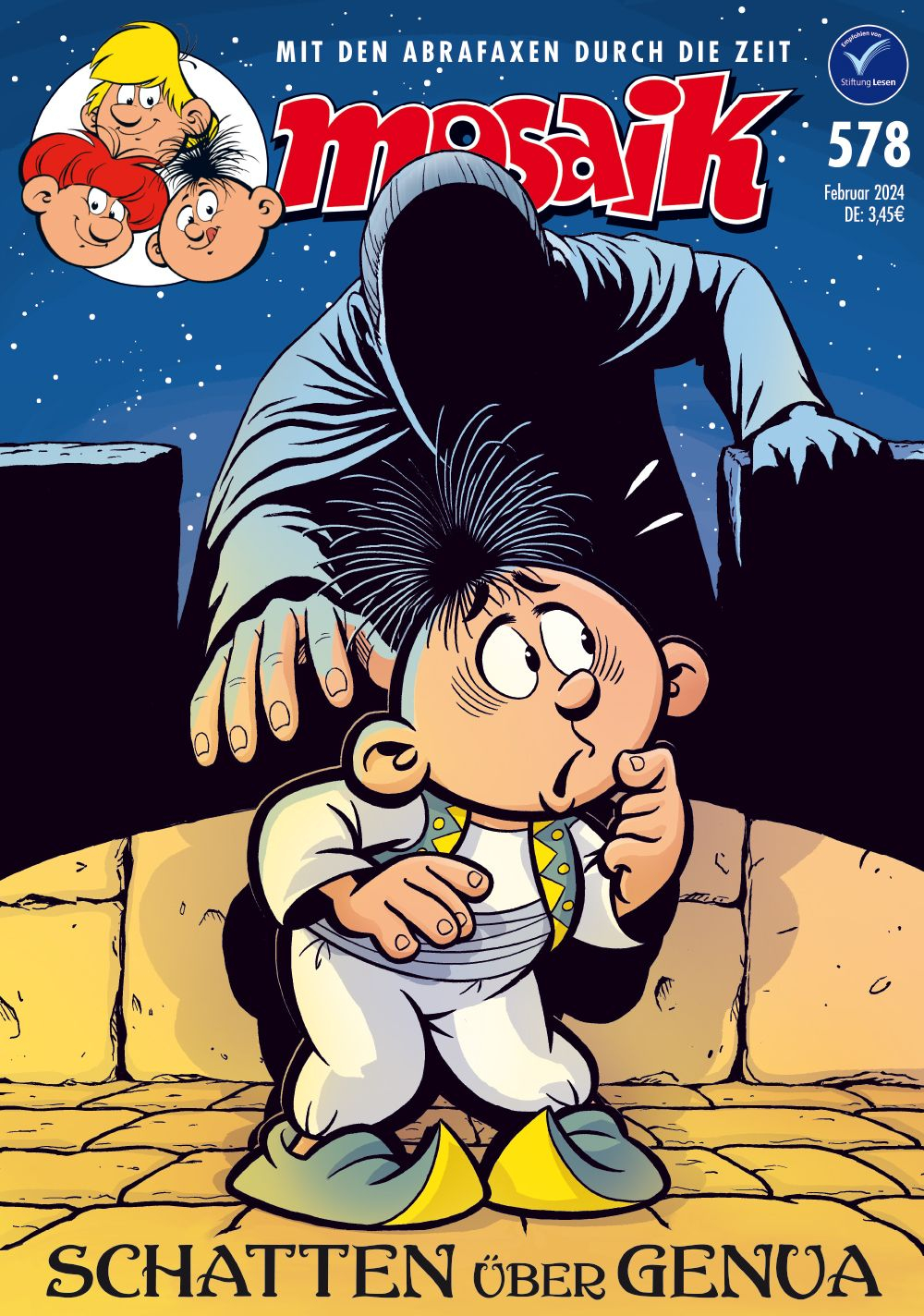 Vor der ligurischen Küste konnte nur eine wundersame Wendung des Schicksals die Abrafaxe vor dem endgültigen Scheitern ihrer Reise bewahren. Und auch im fernen Tripolis hätte es nicht weniger als eines Wunders bedurft, Lela unter den Trümmern des eingestürzten Tores überleben zu lassen. Was die kleine Fatima dort schließlich entdeckt, warum der Conte von Genua an einem ungewöhnlichen Ort heiraten will und welche Rolle die Abrafaxe dabei spielen, das erzählen wir in diesem MOSAIK.