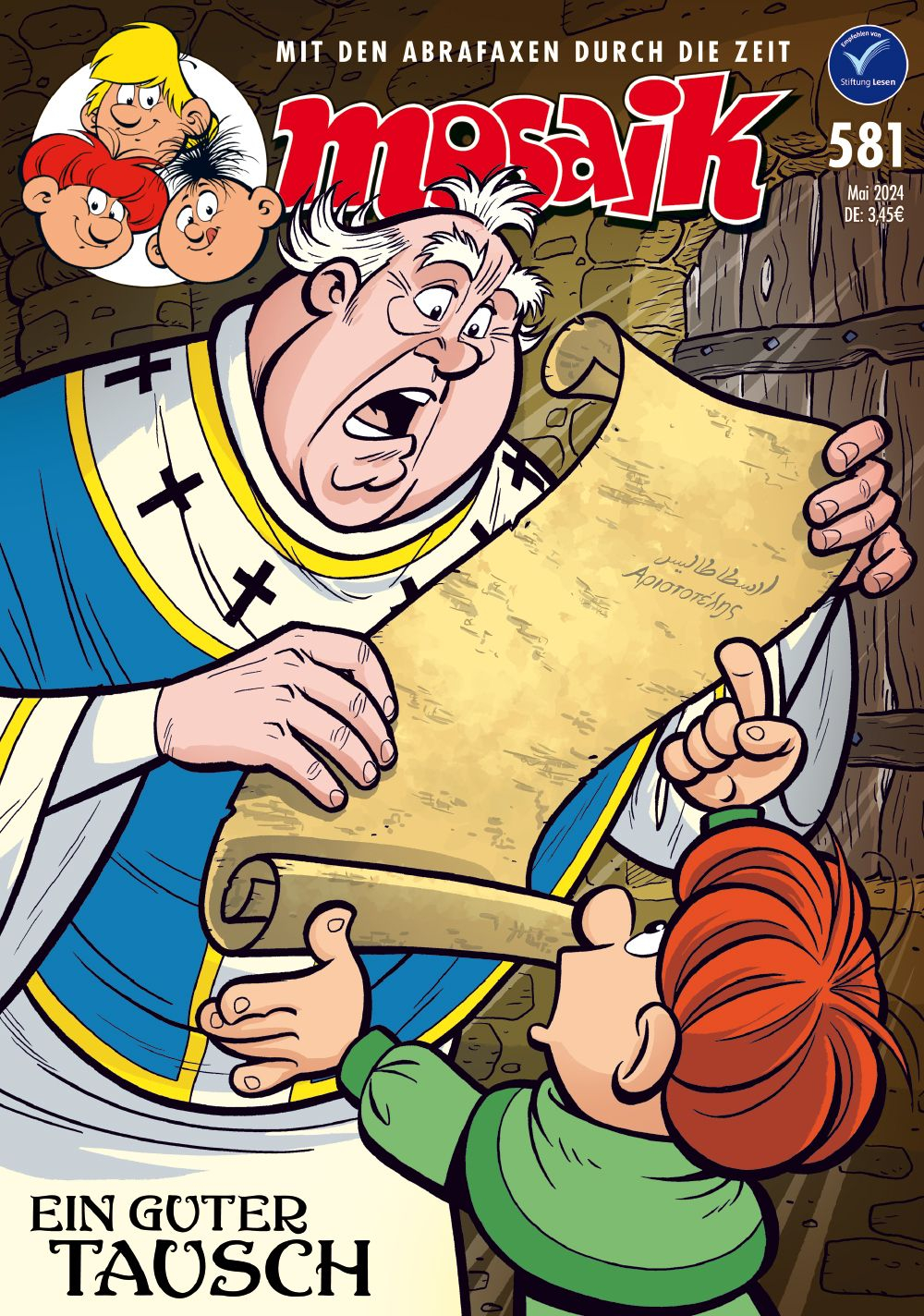 Um es gleich vorweg zu sagen: Califax wurde natürlich aus den Fluten des Landwassers gerettet. Abul Abbas bewegte sich in einer Art Schockzustand durch das eisige Wasser talwärts und schien nichts von der Kälte zu bemerken. Ansprechbar war er allerdings nicht. Wie der Elefant das übersteht, was die Abrafaxe in Chur erleben und welche Folgen ein Besuch in einem Kloster hat, das erzählen wir in diesem MOSAIK.