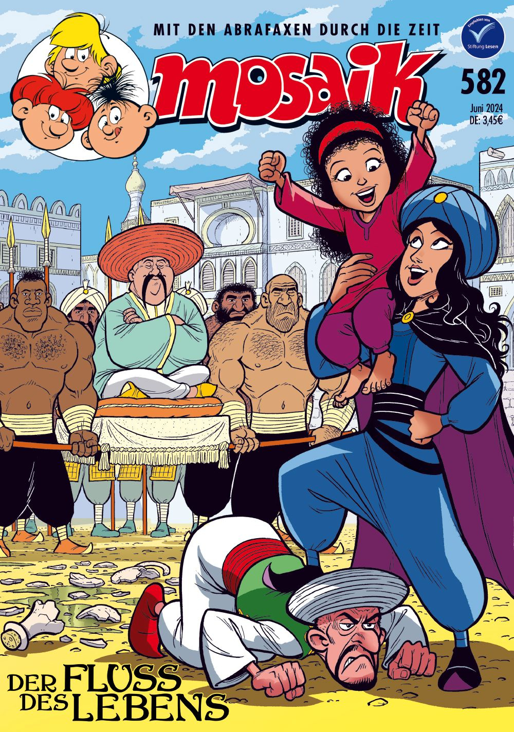 Die Abrafaxe saßen im Kloster Rheinau fest, bis eine neue Brücke gebaut war. Doch woher sollte das Holz dafür kommen? Die Mönche hofften auf ein Wunder, aber darauf wollte sich Brabax eigentlich nicht verlassen. Warum Brabax in diesem Fall eines Besseren belehrt wird, weshalb die Gefährten plötzlich schneller vorankommen als gedacht und was Lela, die einstmalige Königin der Diebe, derweil in Tripolis anstellt, das erzählen wir in diesem MOSAIK.