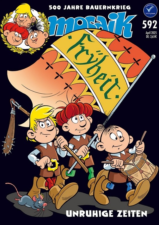 In diesem Heft hat es Abrax, Brabax und Califax ins Schwäbische Allgäu des Jahres 1524 verschlagen. Es waren unruhige Zeiten. Überall im Reich begehrten Bauern gegen die Ungerechtigkeiten auf. Und in Memmingen werden in den 12 Artikeln zum ersten Mal grundlegende Freiheits- und Menschenrechte aufgeschrieben. Welche Rolle die drei Abenteurer dabei spielen, wie man damals eine fröhliche Hochzeit feierte und warum ein außerehelicher Fehltritt ein ganzes Dorf vor dem Ruin rettet, das erfahrt ihr in diesem MOSAIK.
