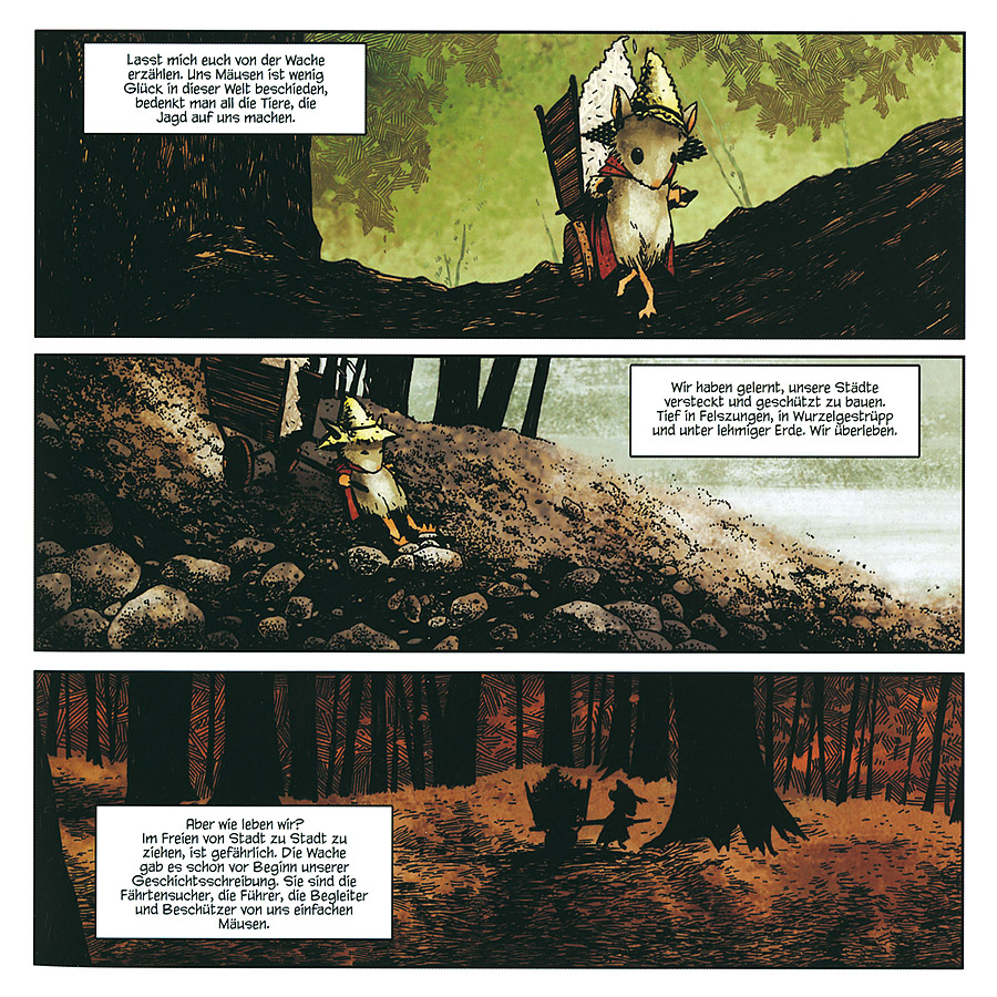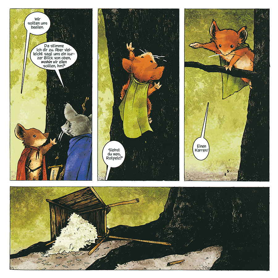 Newcomer David Petersen entwirft in seinem Comic-Erstling ein wundersames Zwischenreich: die Geschichte einer Mäusezivilisation im Mittelalter. Versteckt agieren die Nager in dieser schweren Zeit, in der nicht nur Schlangen, Wölfe und Krabben schier gigantische Feinde sind, sondern auch machtgierige und intrigante Mäuse.