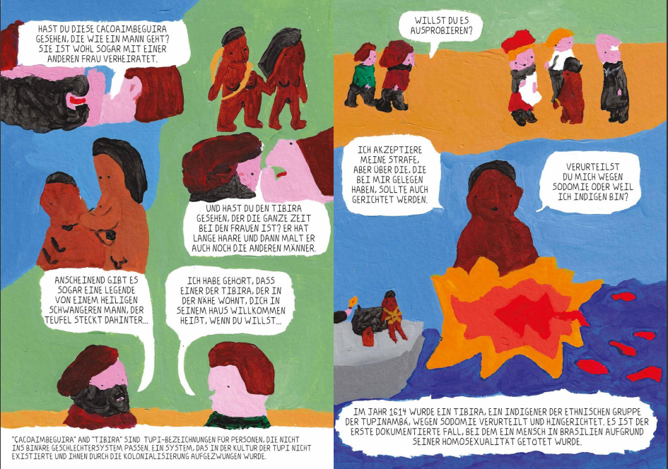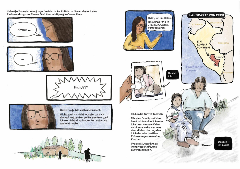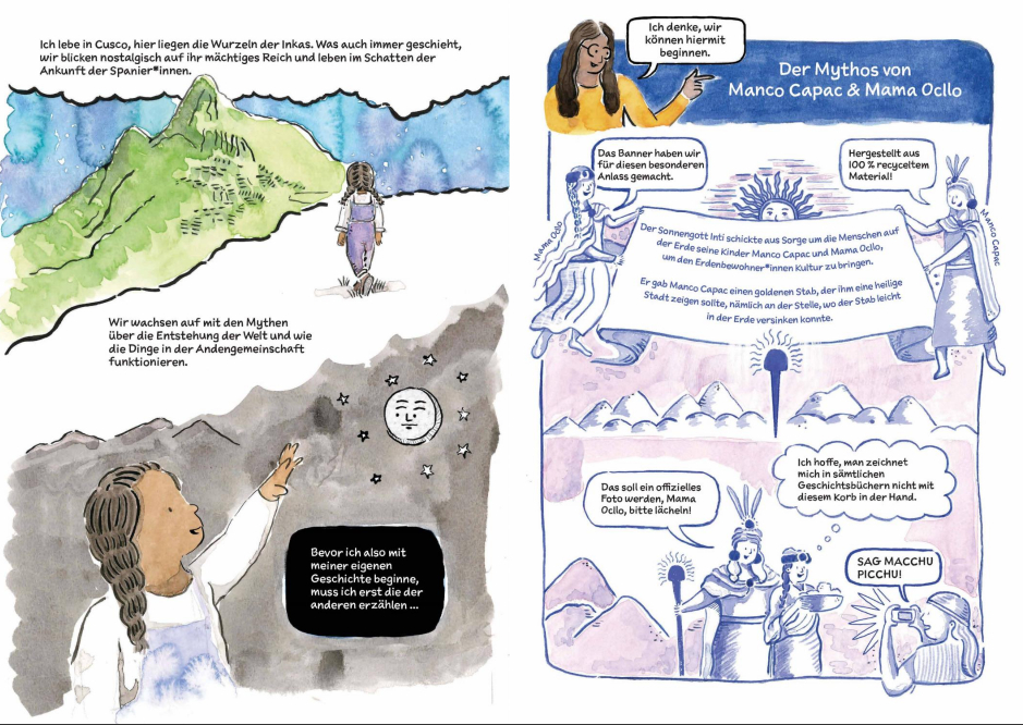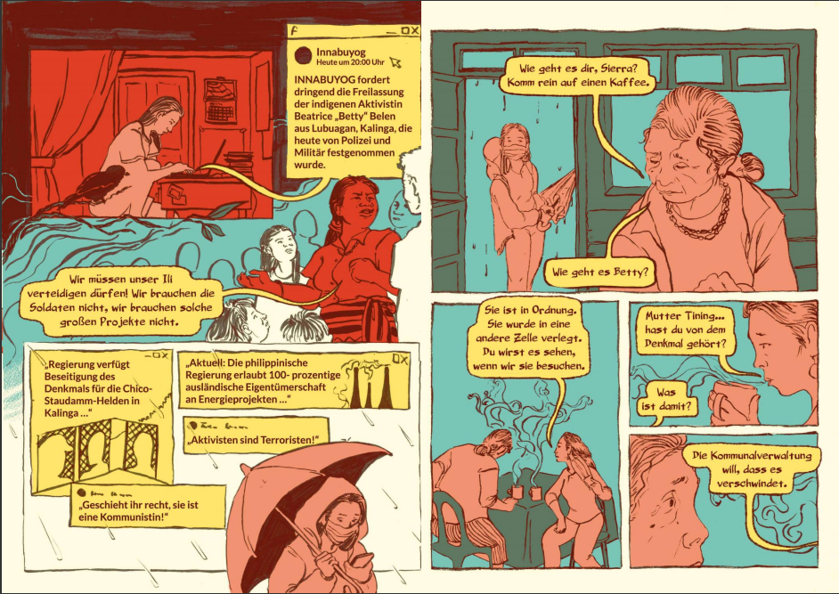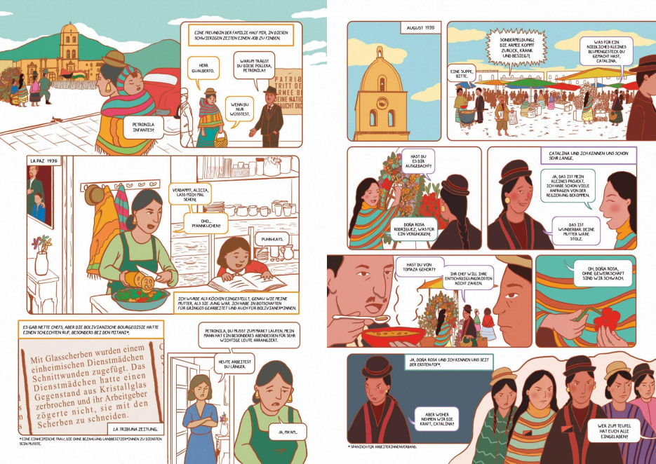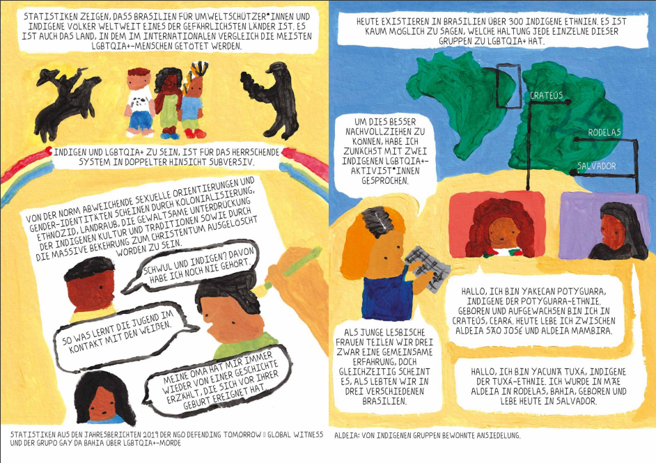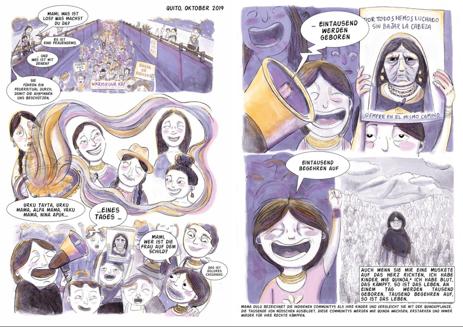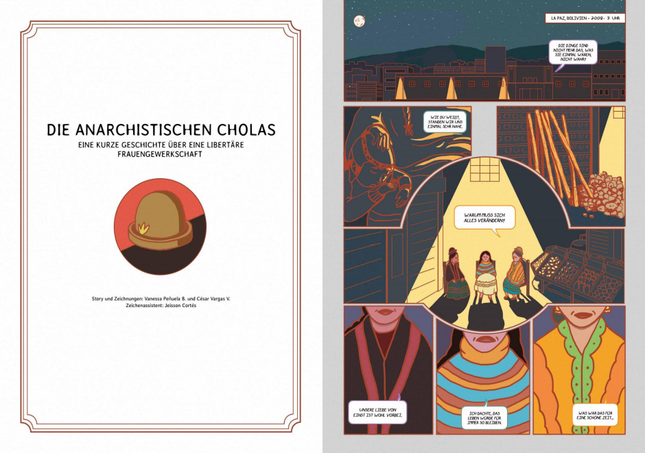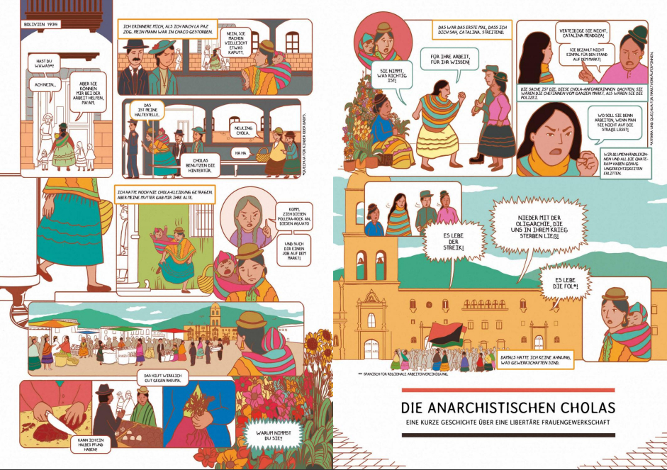 Die Künstler*innen, die großteils in Teams und unter der fachkundigen Anleitung ihrer Mentorinnen Nacha Vollenweider und Amruta Patil gearbeitet haben, stellen dabei so diverse Bewegungen vor wie die der anarchistischen Chola-Gewerkschafterinnen im Peru der 1920er, den brasilianischen Kampf für die Rechte indigener LGBTQIA+-Personen von den Anfängen der Kolonialisierung bis heute oder die Pflege bedrohter musikalischer Traditionen im vietnamesischen Hochland.