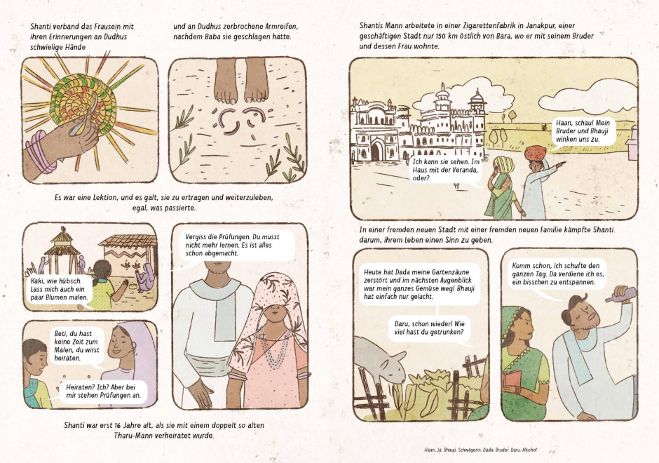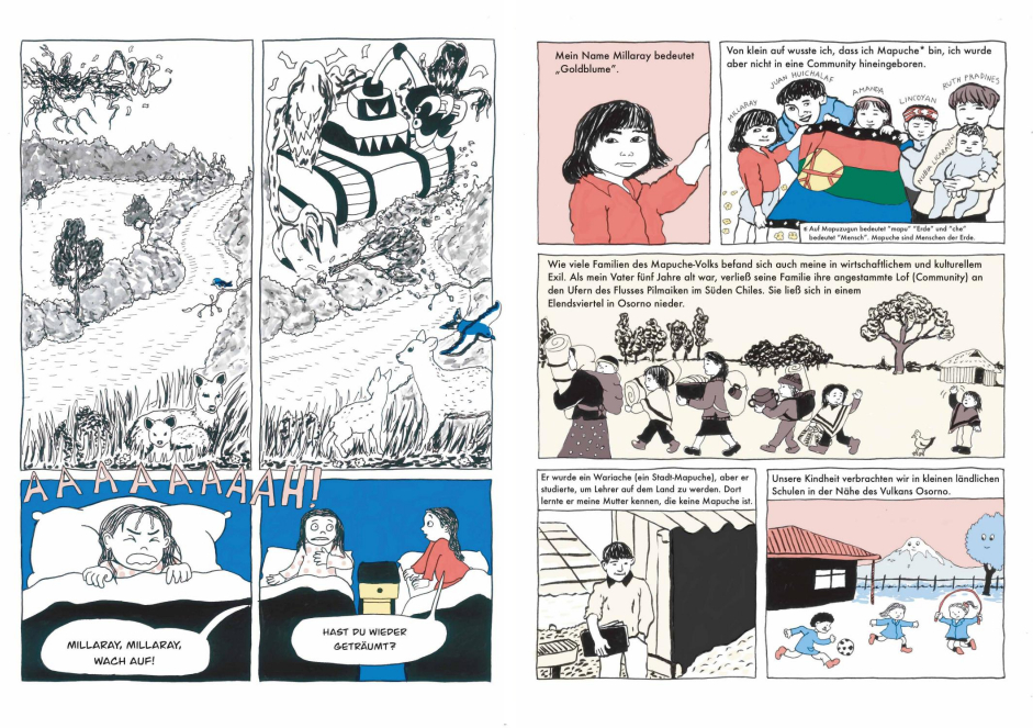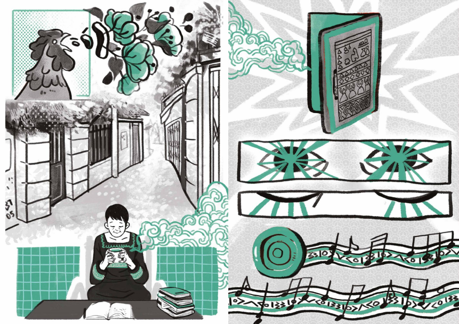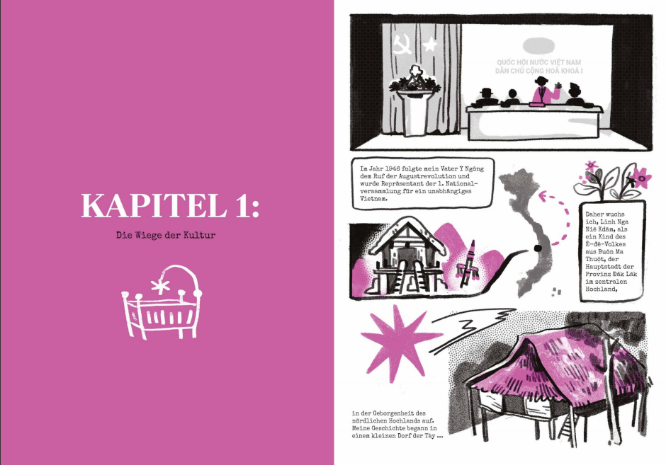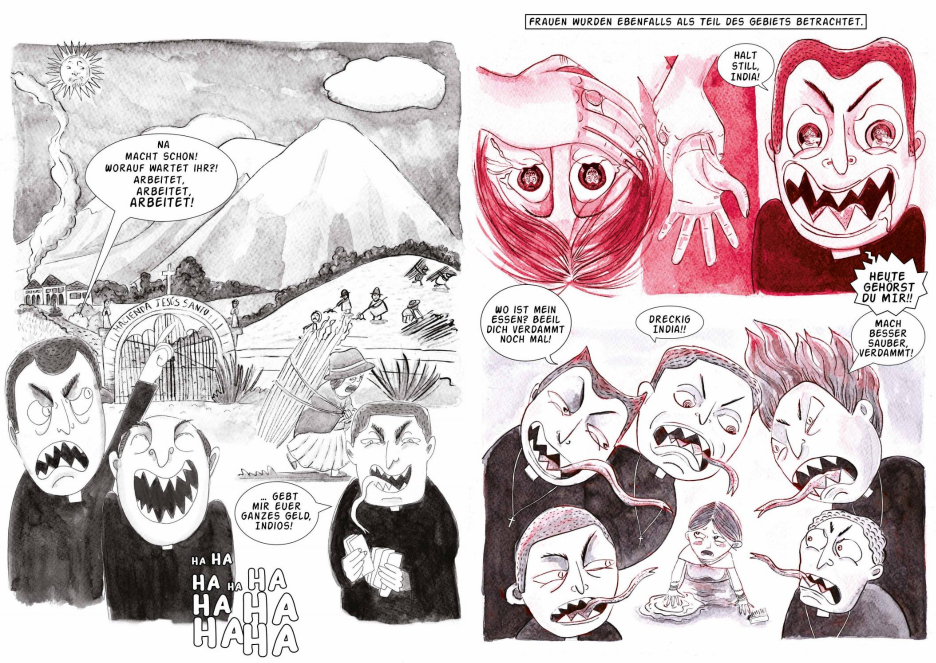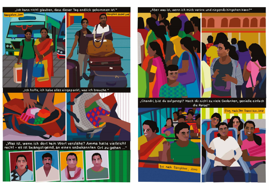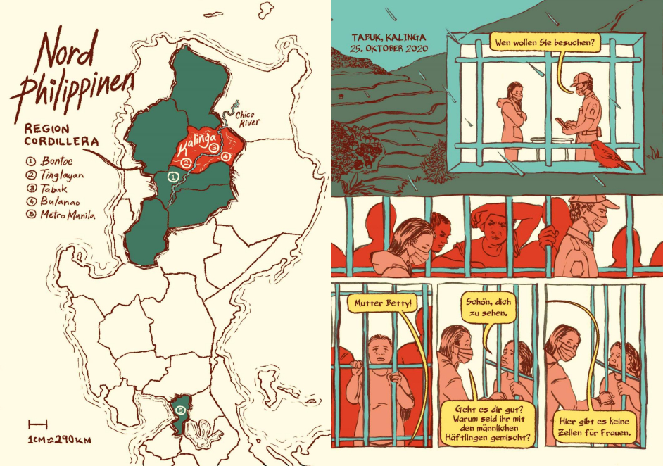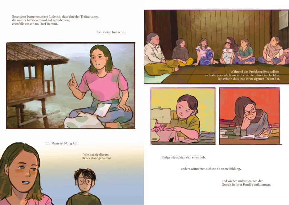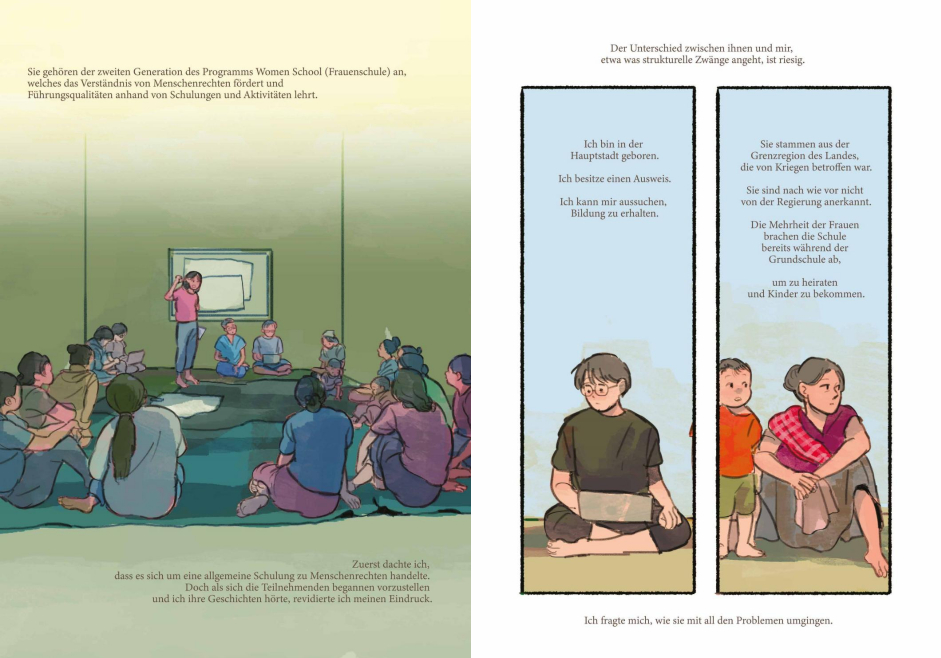 Die Künstler*innen, die großteils in Teams und unter der fachkundigen Anleitung ihrer Mentorinnen Nacha Vollenweider und Amruta Patil gearbeitet haben, stellen dabei so diverse Bewegungen vor wie die der anarchistischen Chola-Gewerkschafterinnen im Peru der 1920er, den brasilianischen Kampf für die Rechte indigener LGBTQIA+-Personen von den Anfängen der Kolonialisierung bis heute oder die Pflege bedrohter musikalischer Traditionen im vietnamesischen Hochland.