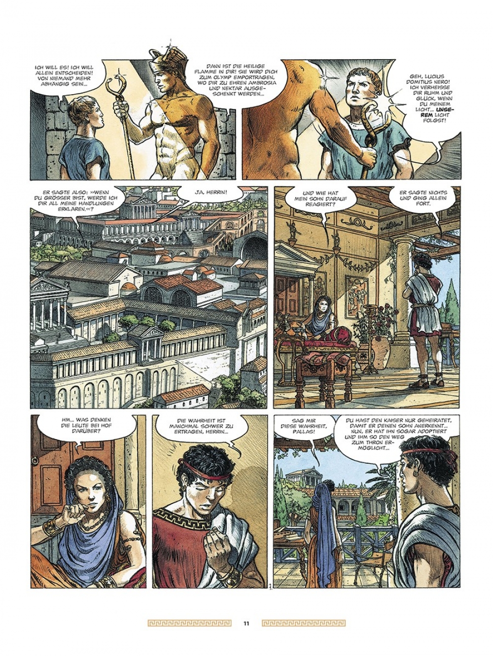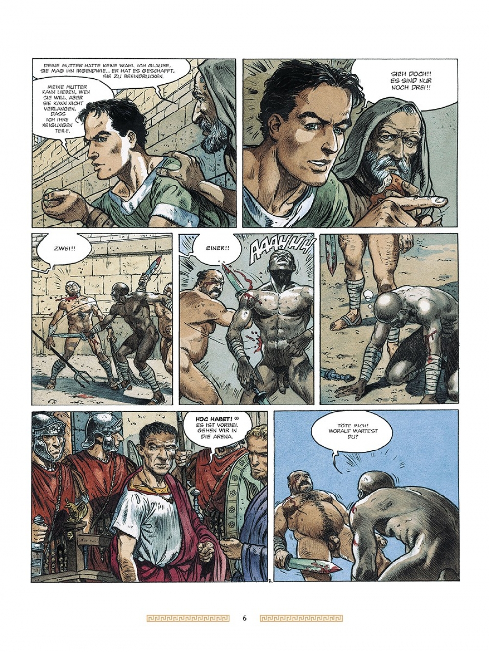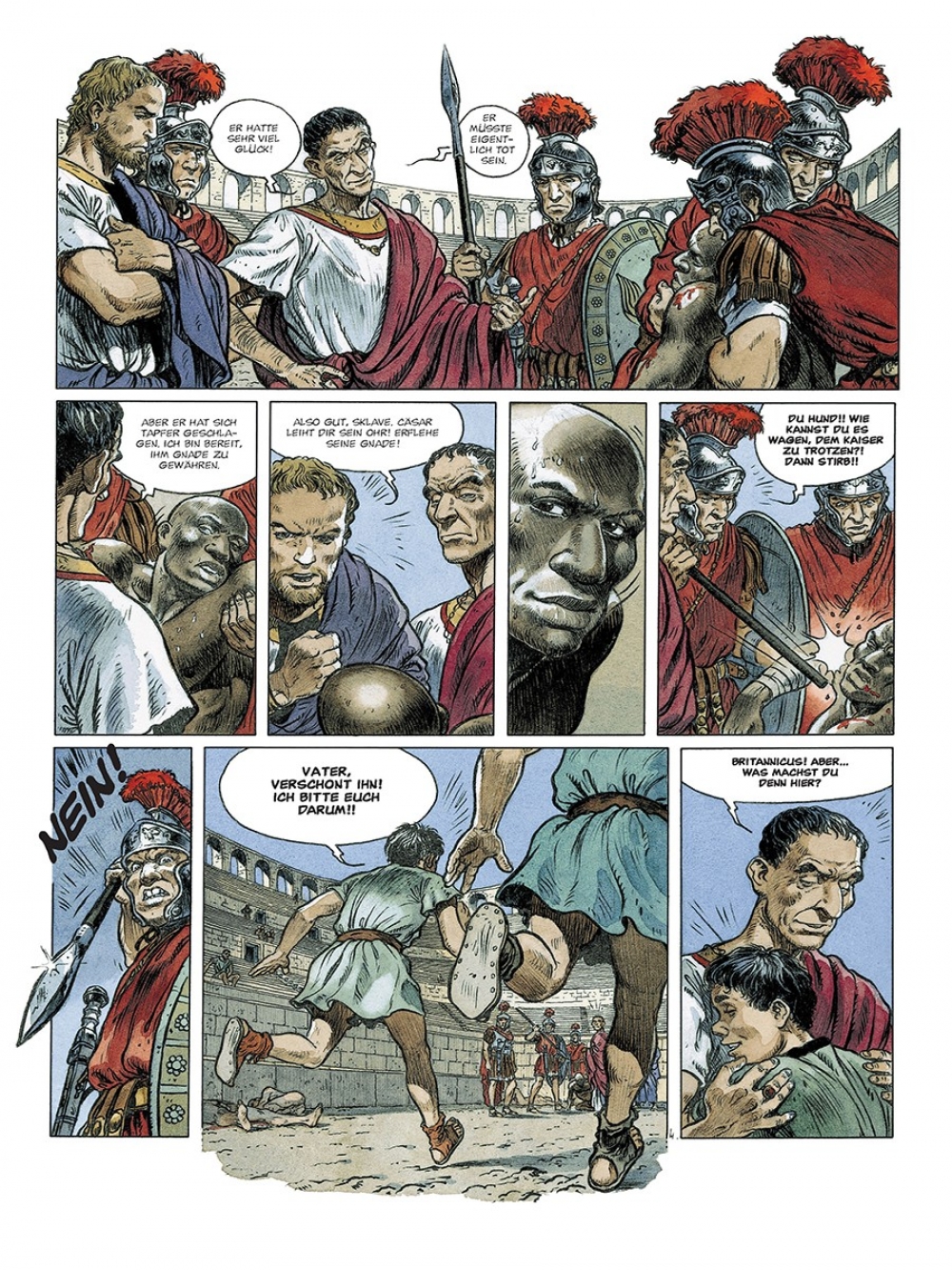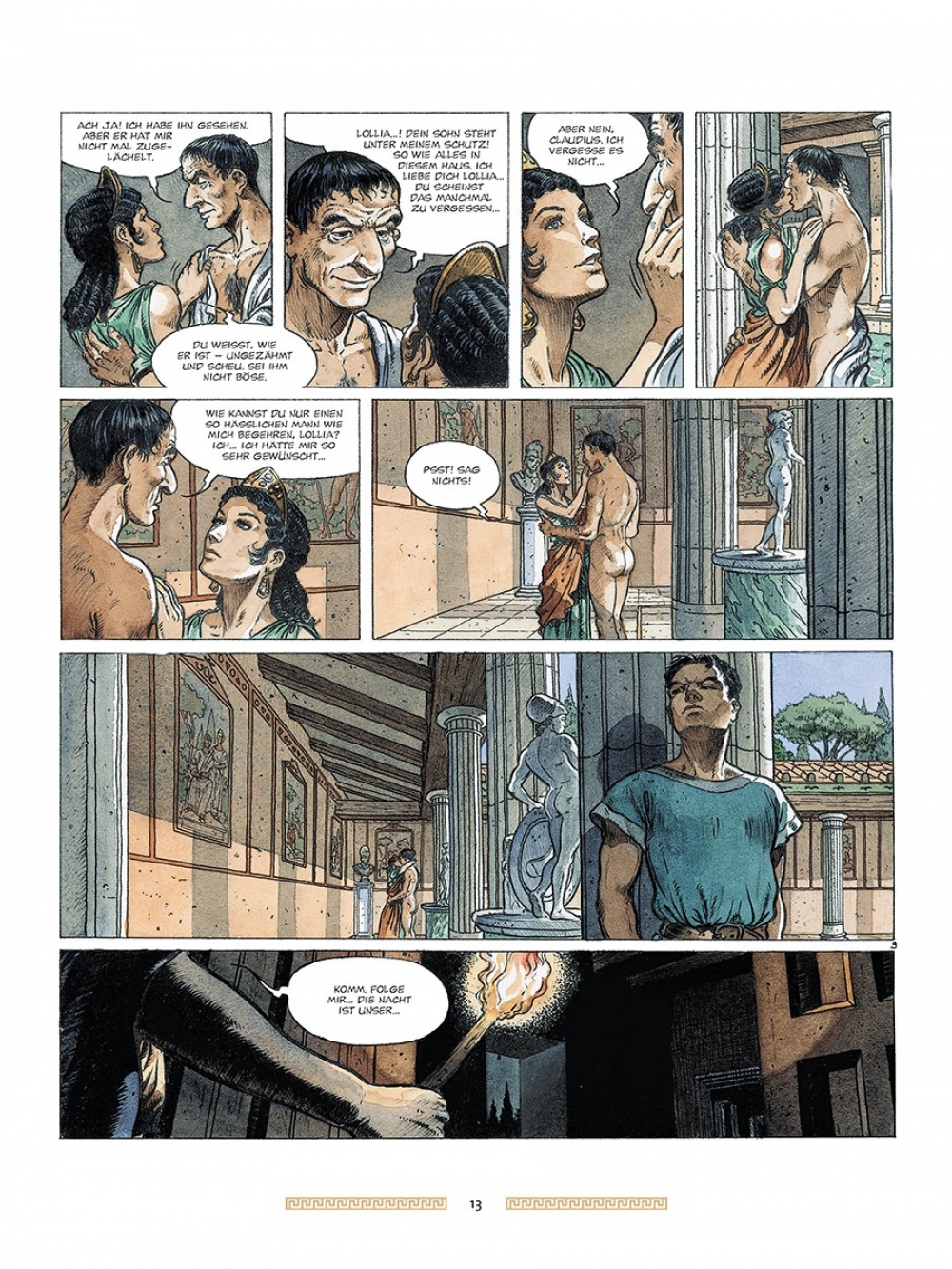 Jean Dufaux (»Giacomo C.«, »Kreuzzug«, »Conquistador« etc.) und Philippe Delaby (»Die Ritter des verlorenen Landes«) haben exakt dieses düster schillernde Kapitel der römischen Kaiserzeit gewählt, um mit »Murena« ein packendes historisches Drama zu inszenieren, das geschickt geschichtliche Fakten und Fiktion miteinander verwebt. Im Mittelpunkt steht neben Nero vor allem der gleichaltrige Lucius Murena, mit ersterem anfangs durchaus befreundet. Er gerät jedoch schon früh in die tödlichen Intrigen bei Hofe und wird so zum erbitterten Gegner Neros, der mehr und mehr dem Cäsarenwahn verfällt. Das alles präsentieren Dufaux und Delaby vor einem detaillierten Panorama der antiken Lebenswelt, penibel recherchiert und akribisch umgesetzt. Und nebenbei geben sie auch noch eine Antwort darauf, wer nun Rom wirklich angezündet hat. Und warum. Schon heute ein Klassiker des History-Comics.