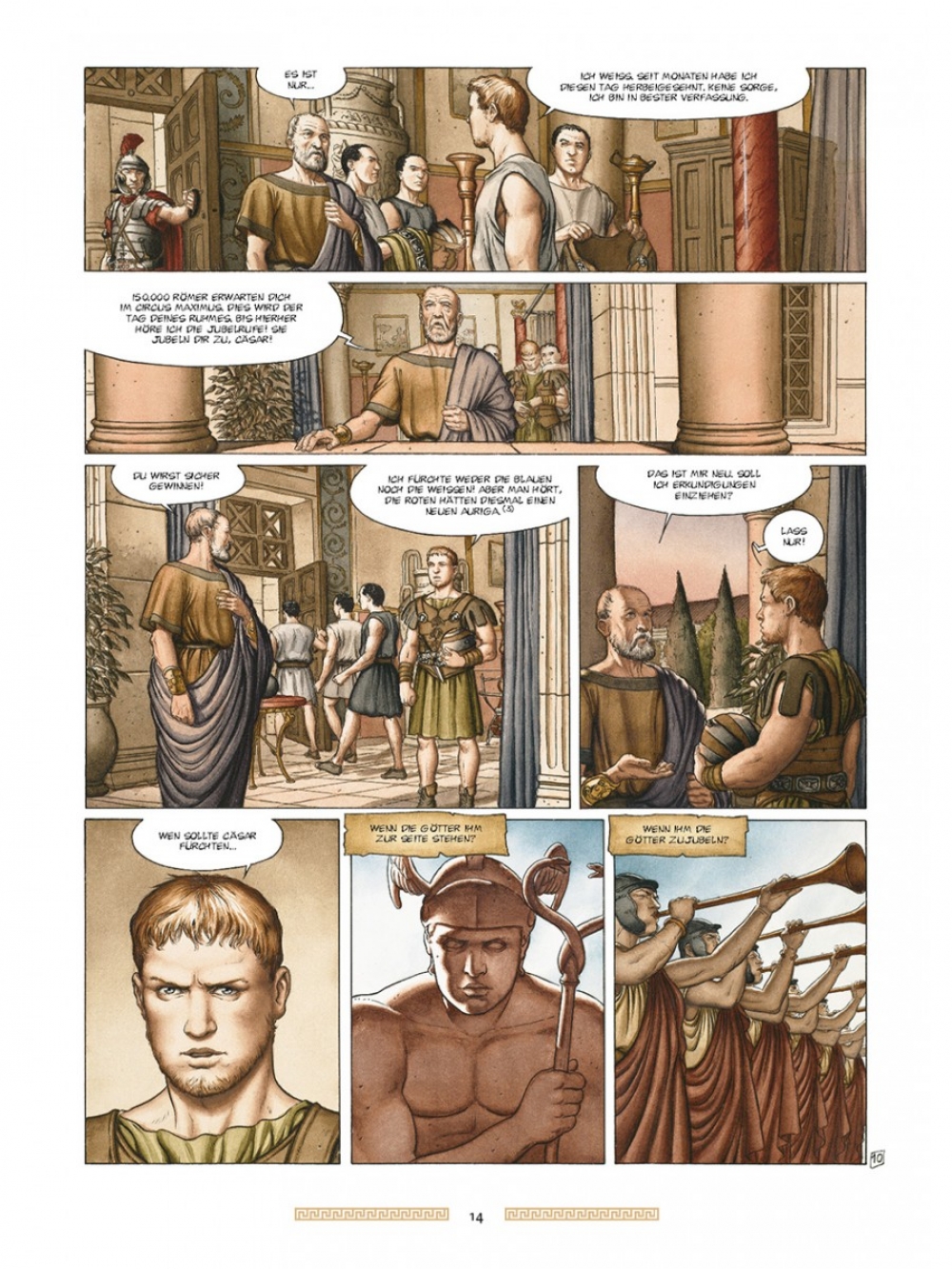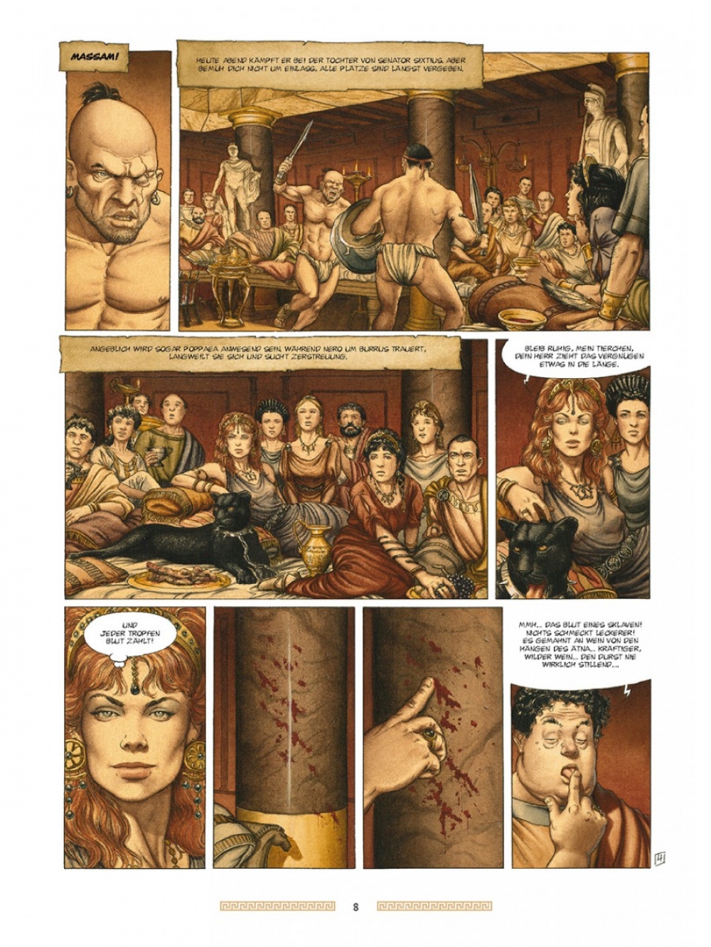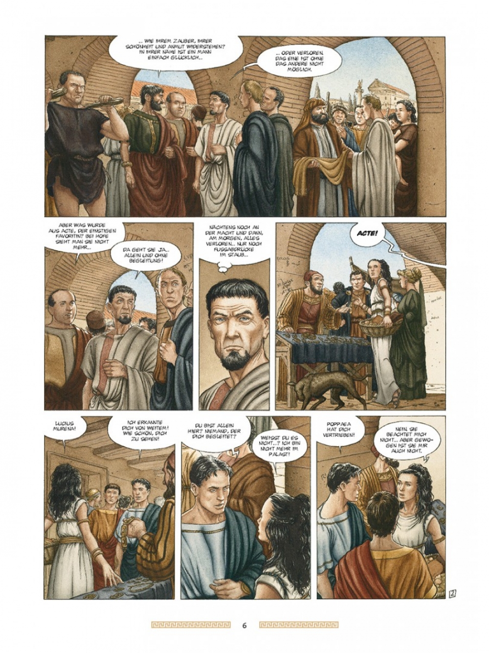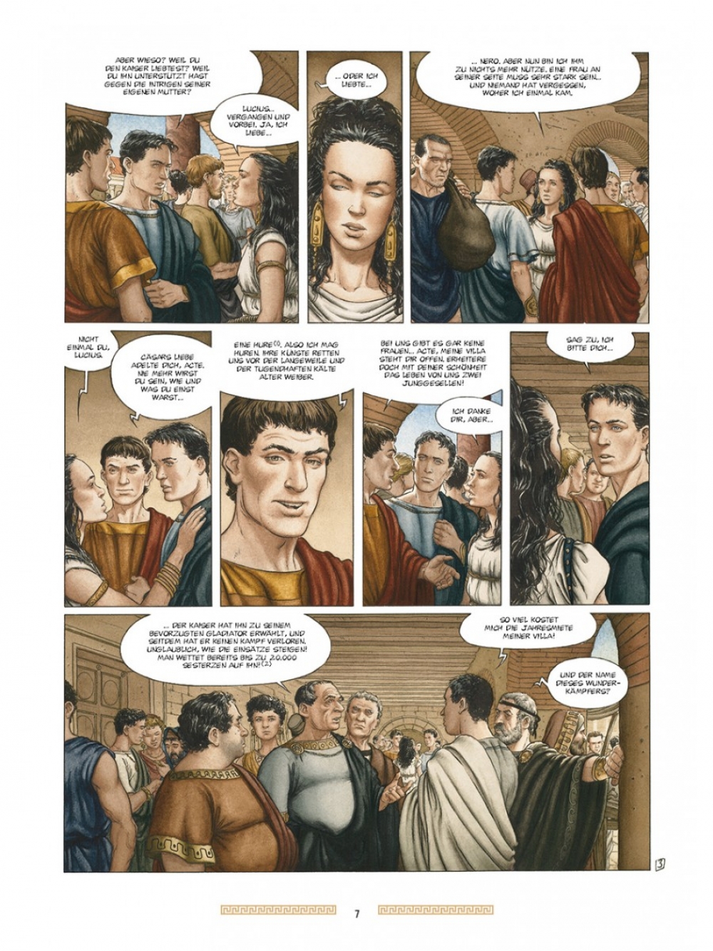 Jean Dufaux (»Giacomo C.«, »Kreuzzug«, »Conquistador« etc.) und Philippe Delaby (»Die Ritter des verlorenen Landes«) haben exakt dieses düster schillernde Kapitel der römischen Kaiserzeit gewählt, um mit »Murena« ein packendes historisches Drama zu inszenieren, das geschickt geschichtliche Fakten und Fiktion miteinander verwebt. Im Mittelpunkt steht neben Nero vor allem der gleichaltrige Lucius Murena, mit ersterem anfangs durchaus befreundet. Er gerät jedoch schon früh in die tödlichen Intrigen bei Hofe und wird so zum erbitterten Gegner Neros, der mehr und mehr dem Cäsarenwahn verfällt. Das alles präsentieren Dufaux und Delaby vor einem detaillierten Panorama der antiken Lebenswelt, penibel recherchiert und akribisch umgesetzt. Und nebenbei geben sie auch noch eine Antwort darauf, wer nun Rom wirklich angezündet hat. Und warum. Schon heute ein Klassiker des History-Comics.