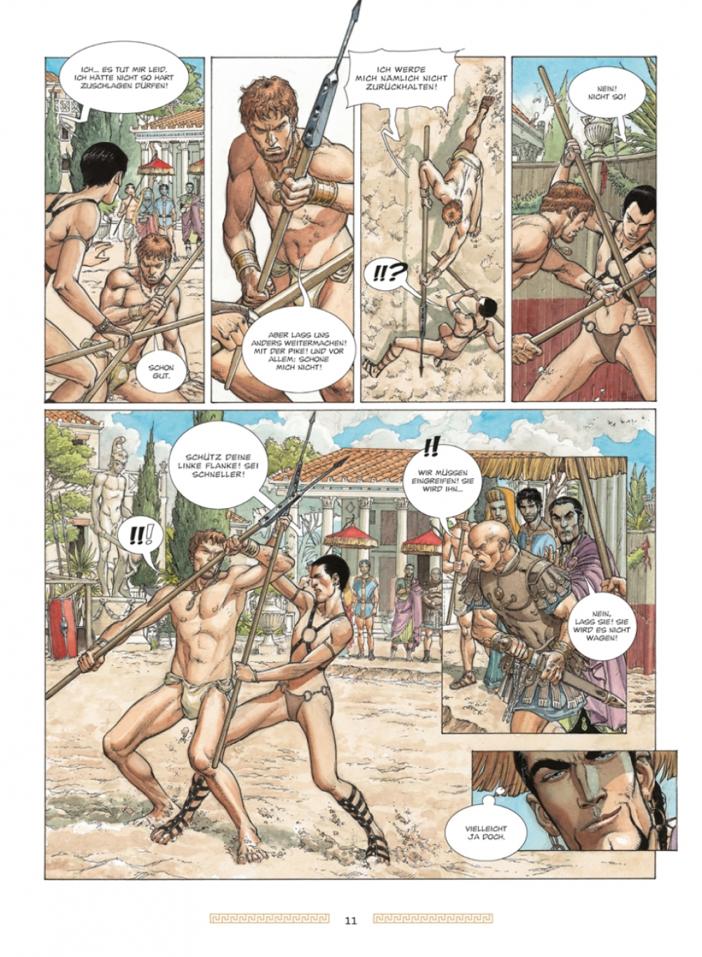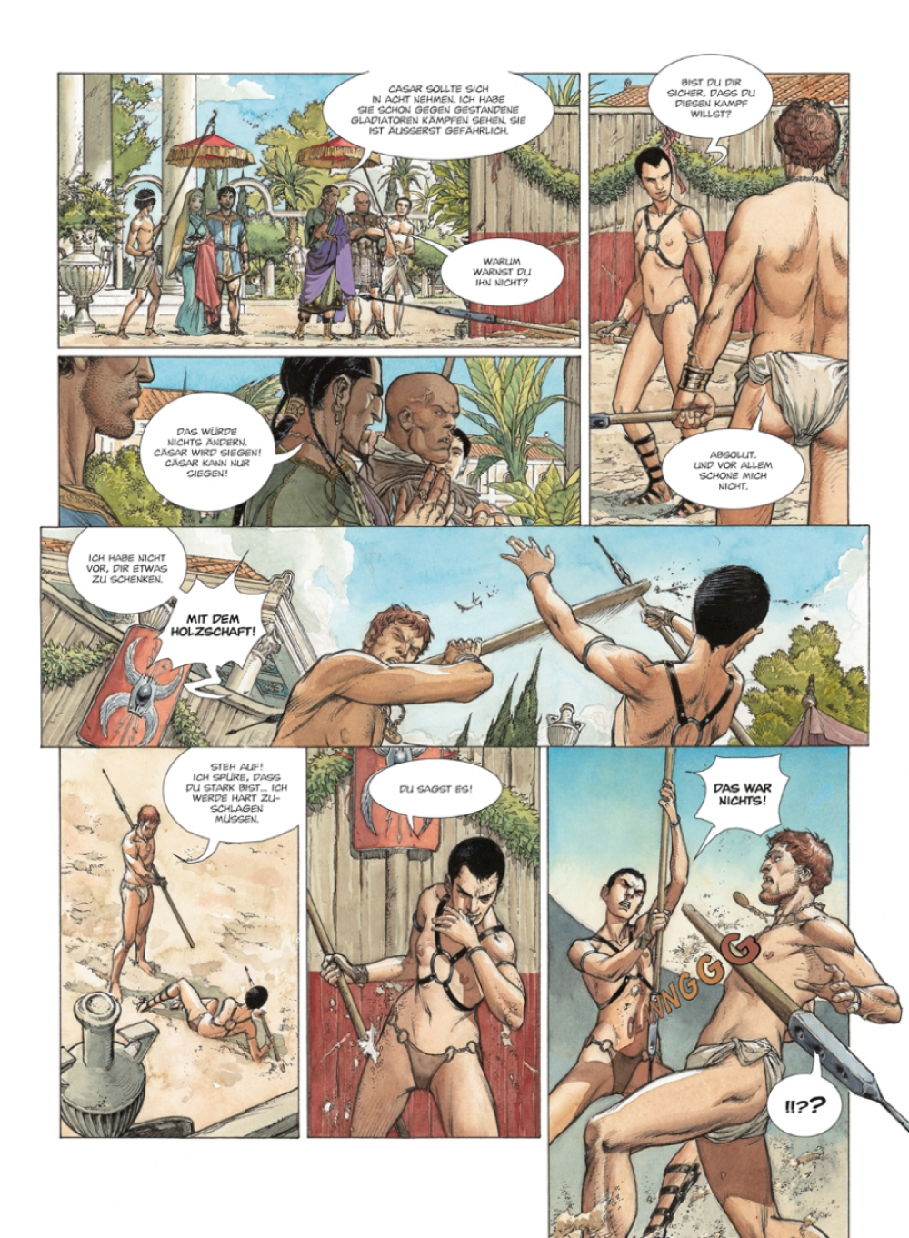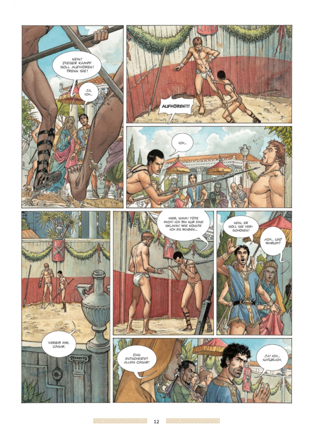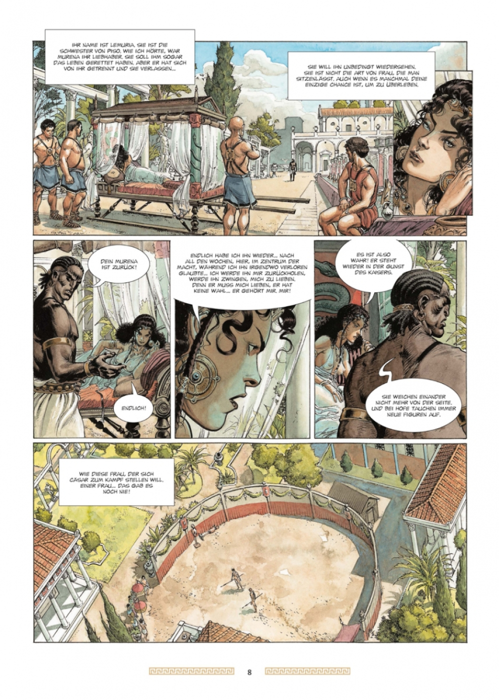 Jean Dufaux (»Giacomo C.«, »Kreuzzug«, »Conquistador« etc.), Philippe Delaby und jetzt Theo (»Der tönerne Thron«) haben exakt dieses düster schillernde Kapitel der römischen Kaiserzeit gewählt, um mit »Murena« ein packendes historisches Drama zu inszenieren, das geschickt geschichtliche Fakten und Fiktion miteinander verwebt. Im Mittelpunkt steht neben Nero vor allem der gleichaltrige Lucius Murena, mit ersterem anfangs durchaus befreundet. Er gerät jedoch schon früh in die tödlichen Intrigen bei Hofe und wird so zum erbitterten Gegner Neros, der mehr und mehr dem Cäsarenwahn verfällt. Das alles präsentieren Dufaux und Theo vor einem detaillierten Panorama der antiken Lebenswelt, penibel recherchiert und akribisch umgesetzt. Und nebenbei geben sie auch noch eine Antwort darauf, wer nun Rom wirklich angezündet hat. Und warum. Schon heute ein Klassiker des History-Comics.