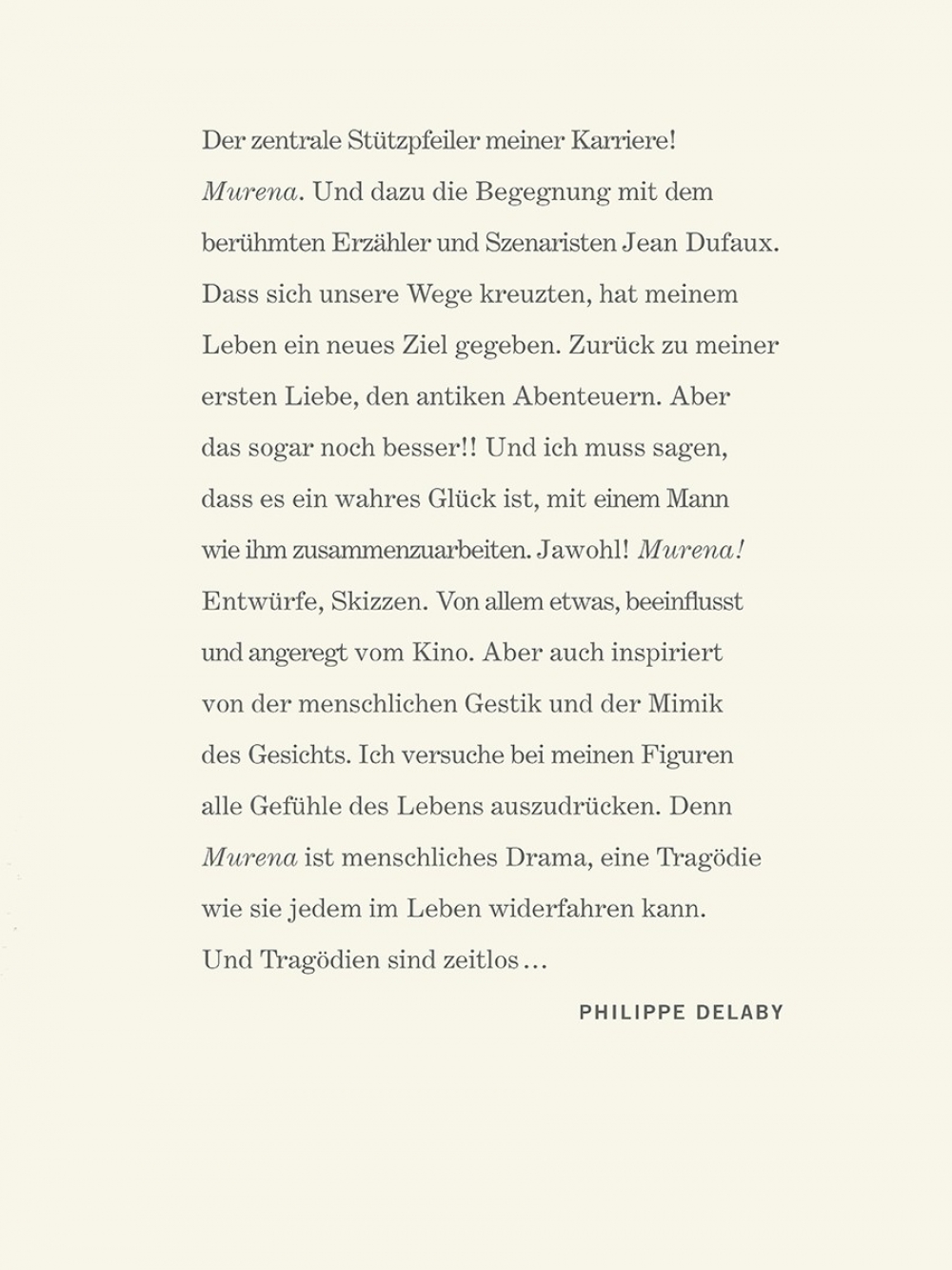 Dieser Skizzenband bietet einen Einblick in den künstlerischen Entstehungsprozess von „Murena“, mehr noch aber verbeugt er sich vor einem der besten Künstler der frankobelgischen Comickunst – ein kleines Dankeschön für ein monumentales Lebenswerk, das so viele LeserInnen auf der ganzen Welt ungebrochen in Begeisterung versetzt. Limitiert auf 1111 Exemplare.