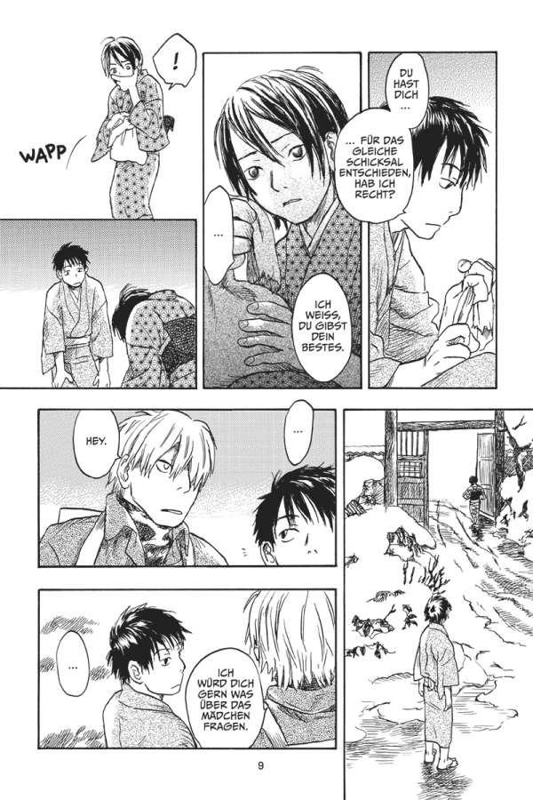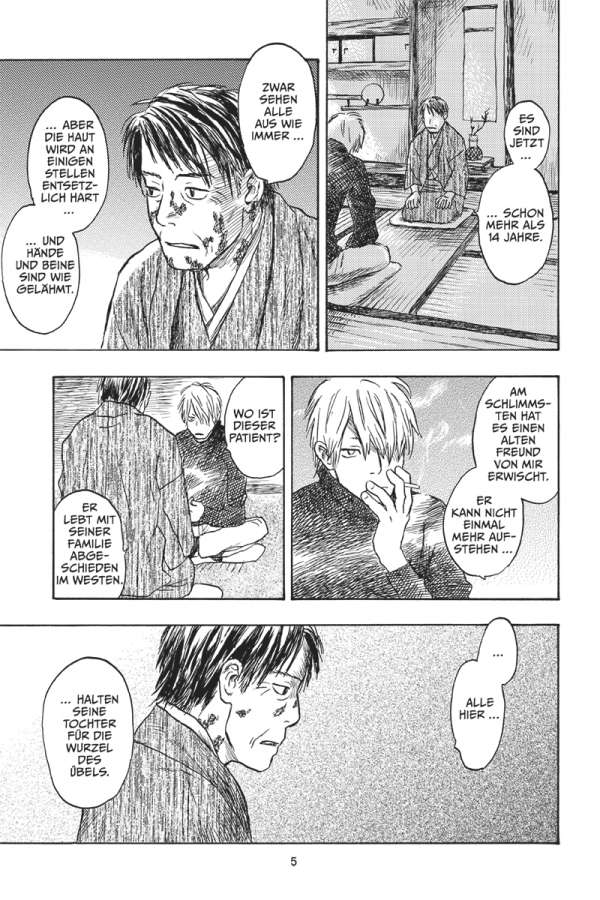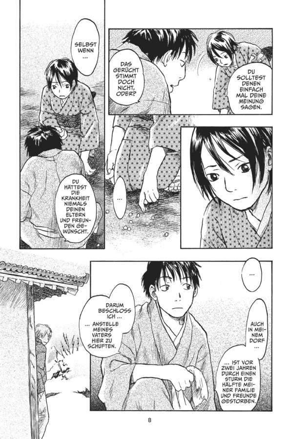 Gleich einem Fluch hat die Stimme eines jungen Mädchens eine entsetzliche Krankheit in einem kleinen, abgeschiedenen Dorf ausbrechen lassen. Doch um das Mädchen zu retten, muss sich Ginko nicht nur den Mushi, sondern auch den rachsüchtigen Dorfbewohnern entgegenstellen …