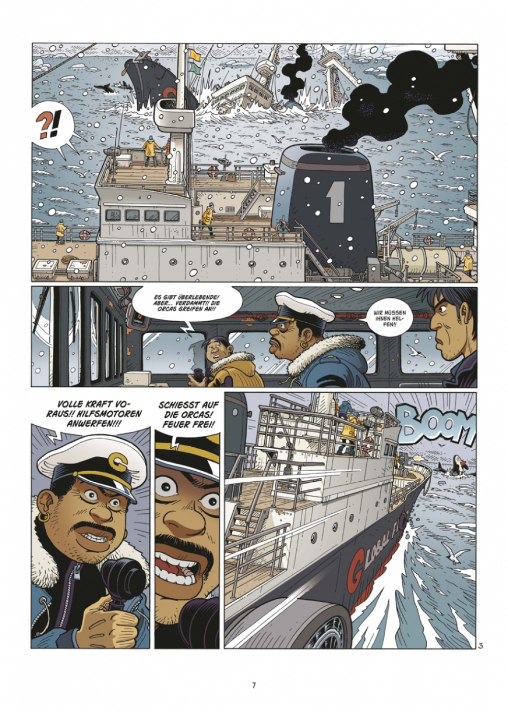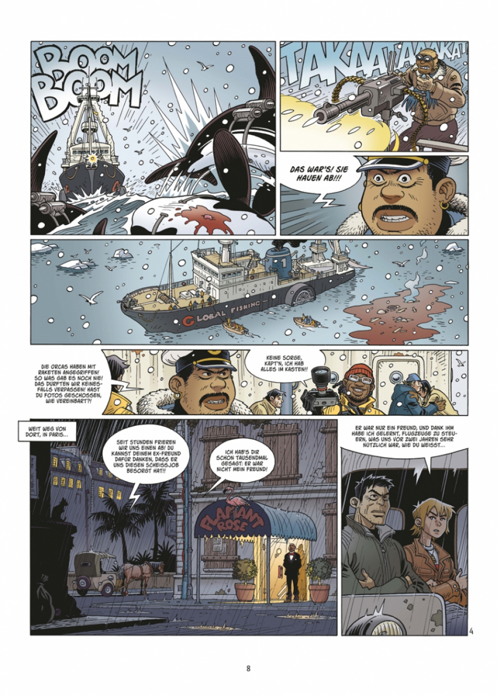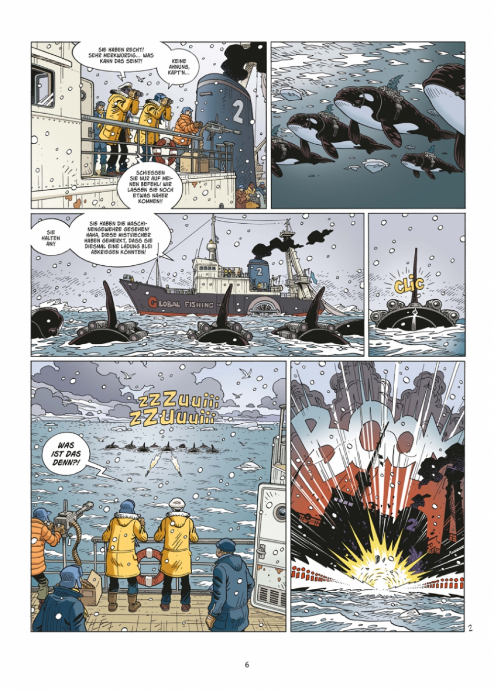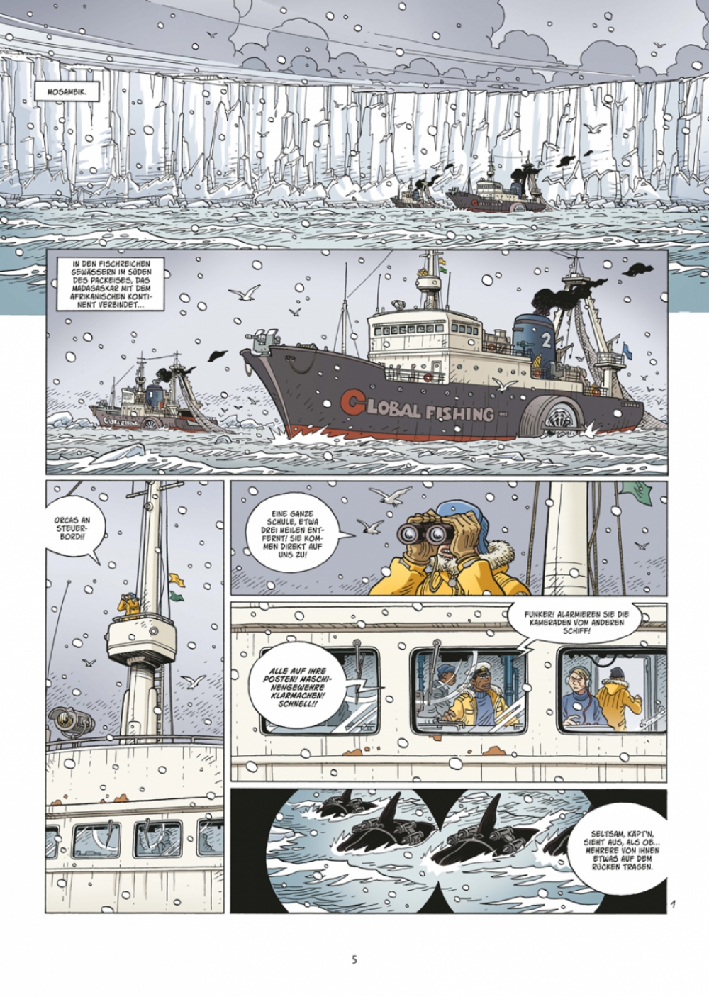 "Die Welt steht Kopf! Nicht genug damit, dass Afrika unter einer Eisschicht verschwindet, jetzt greifen auch noch Wale und Delfine Fischereischiffe vor der Küste von Madagaskar an. Mit Torpedowerfern! Die UNO ist fassungslos und reaktiviert zwei ehemalige Agenten, um der Sache auf den Grund zu gehen: Romane und El Malik, die sich nach ihrem letzten Einsatz mit einer eigenen Detektivagentur selbstständig gemacht haben. Sind die Meeressäuger rasant mutiert und haben die Waffen gestohlen, oder sind sie doch Opfer menschlicher Manipulation?