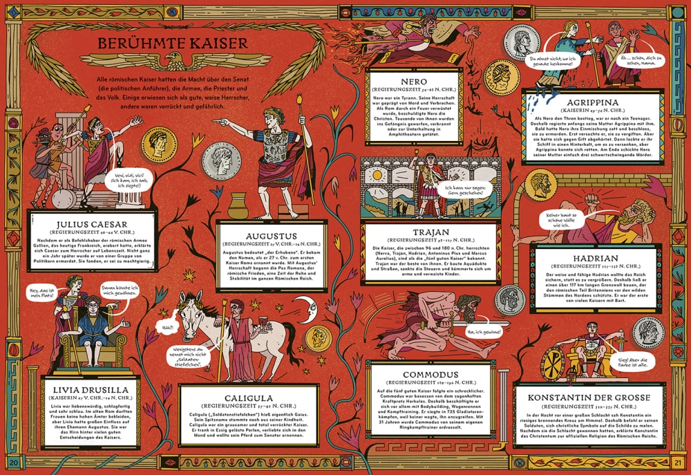 Witzig, bunt und voller Wissen: In diesem rasanten Comic-Band nimmt uns Stephen Davies wieder einmal mit in die Welt der Mythen, Sagen und Legenden. Diesmal dreht sich alles um die römische Antike. In humorvoll gezeichneten Comic-Panels erfahren Kinder nicht nur die abenteuerlichen Geschichten, die man sich über Jupiter, Merkur und Co. erzählte, sondern auch, wie Rom der Legende nach gegründet wurde, wer über das Römische Reich herrschte und wie man dort eigentlich lebte. Von Aeneas über Romulus und Remus bis hin zu Julius Caesar trifft man auf die spannendsten Figuren der römischen Antike. Die perfekte Einführung in die Sagenwelt des Alten Roms für Comic-Fans ab 8 Jahren!