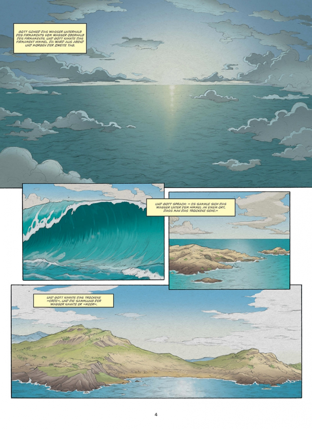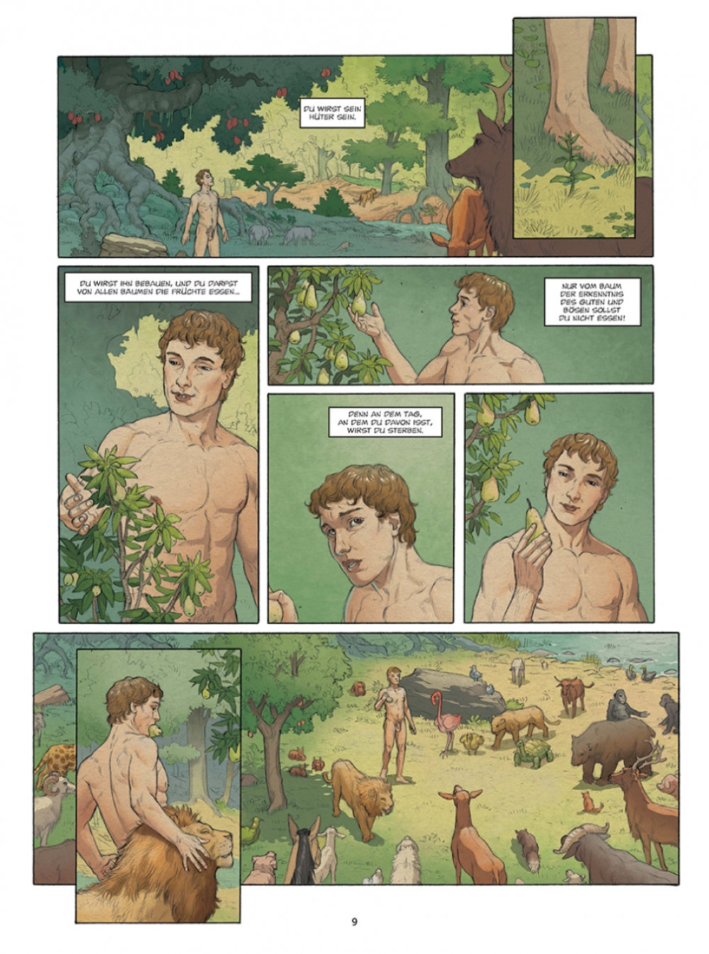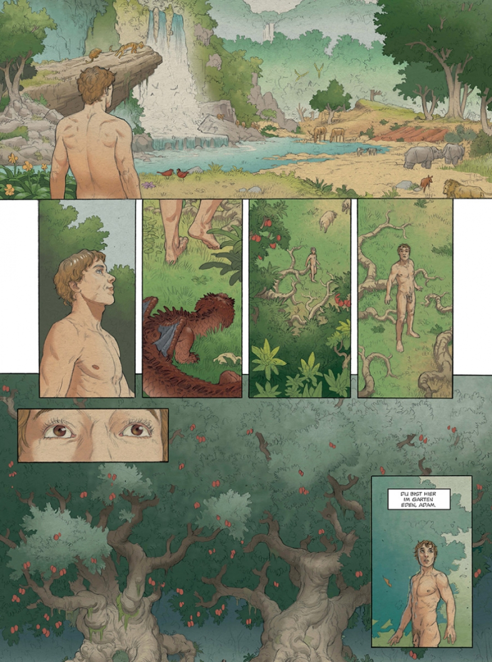 Am Anfang schuf Gott Himmel und Erde. Und im Verlauf von sechs Tagen folgte ein Universum voller Schönheit, in dem ein jedes seinen Platz fand: die Gestirne und die Elemente, der Himmel und die Erde, die Tiere und die Pflanzen und schließlich Adam, der erste Mensch, den Gott nach seinem Bilde schuf. Bald schenkte Gott Adam eine Gefährtin namens Eva, und zusammen leben sie im Garten Eden. Doch Eva erliegt der Versuchung der Schlange. Im Bestreben, Erkenntnis zu erlangen, isst sie von der verbotenen Frucht und weckt Gottes Zorn. Adam und Eva werden des Paradieses verwiesen und bevölkern von da an gepeinigt von der Last der Erbsünde die Erde...