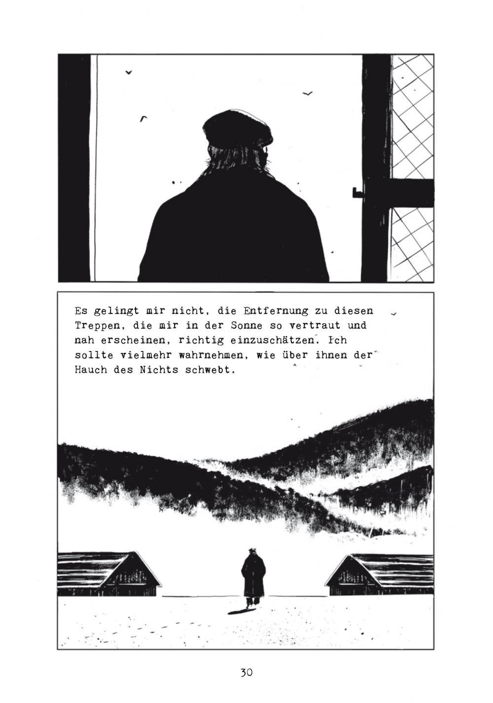 des 2. Weltkriegs und seiner späteren Erinnerungsversuche als Holocaust-Überlebender bei der Wiederbegehung der Orte seines Schreckens. Trotz der Düsterheit erstaunt, die dieser Graphic Novel innewohnende Lebenskraft , die bei aller Hoff nungslosigkeit auch von Menschlichkeit und Solidarität im Ausweglosen zeugt.