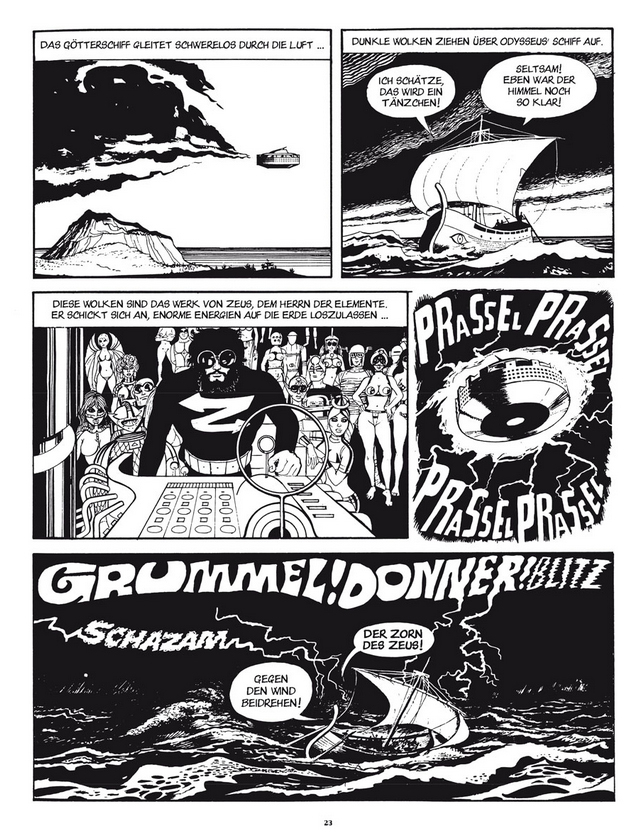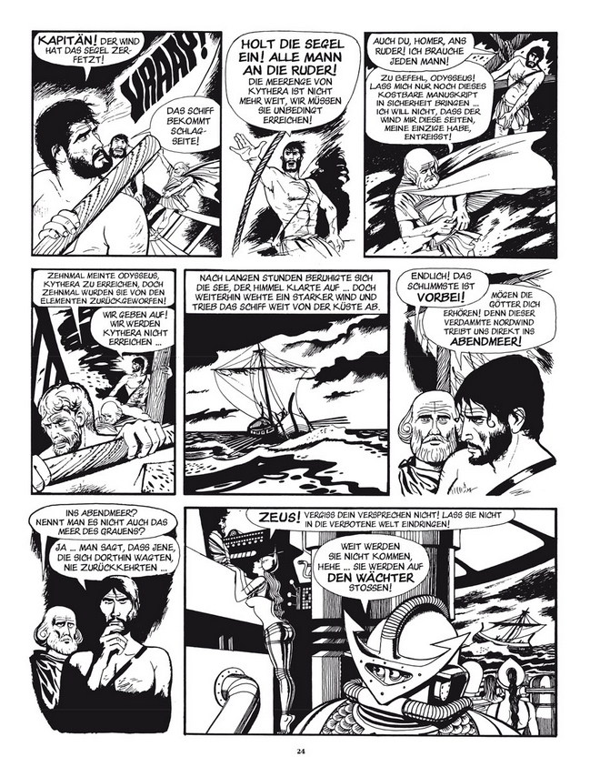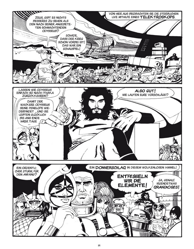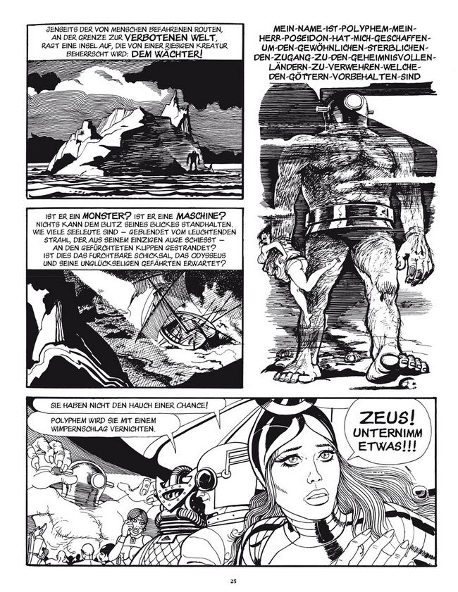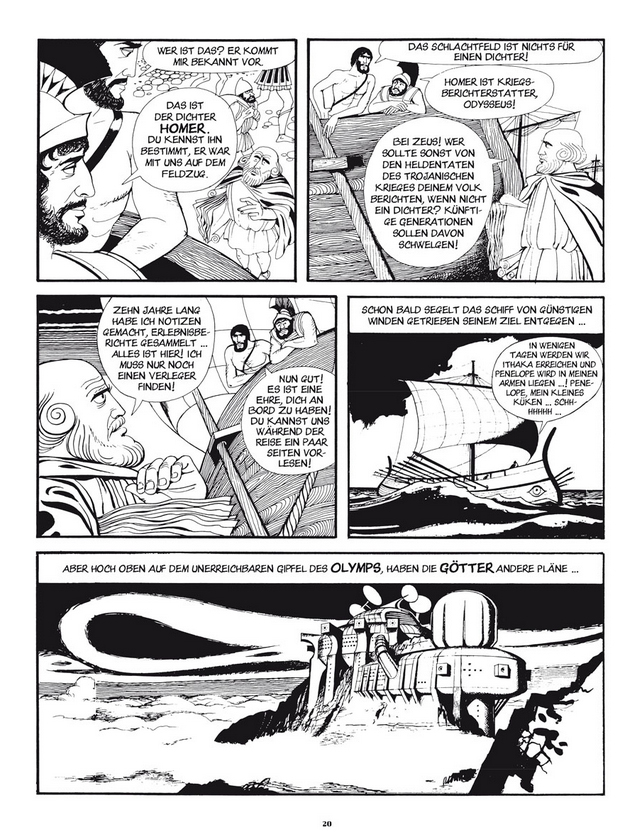 Es ist wahrscheinlich die bekannteste Geschichte der Welt: Die Irrfahrt des listigen und furchtlosen Odysseus, König von Ithaka, und die Rückkehr in seine Heimat, um seine geliebte Frau Penelope wieder in die Arme zu schließen. Ein märchenhaftes Abenteuer, das auch heute noch Gegenstand zahlreicher Adaptionen ist. Die hier vorliegende Version bleibt dem Text Homers treu und stößt trotzdem die Tür auf zu einer neuen Interpretation. Dabei vermengen die Autoren mythologische Bilder mit dem Science-Fiction-Dekor der 60er Jahre: Raumschiffe, Roboter und ein Afri-Cola trinkender Zeus. Ursprünglich erschien diese Adaption von 1968 bis 1974 im französischen Magazin Charlie Mensuel.