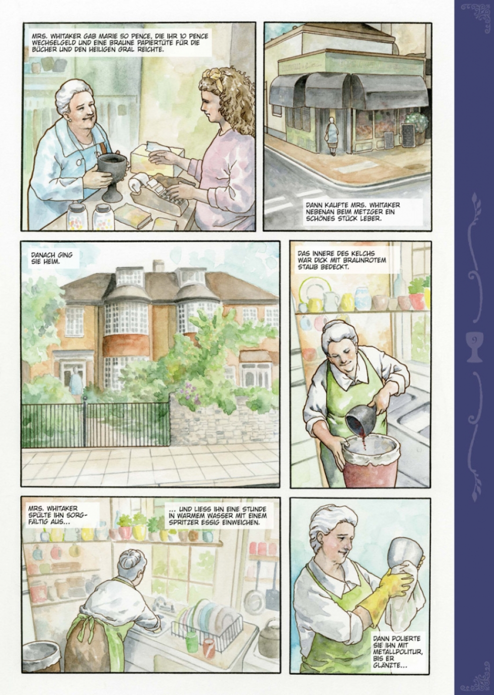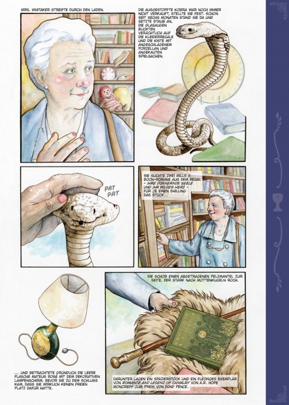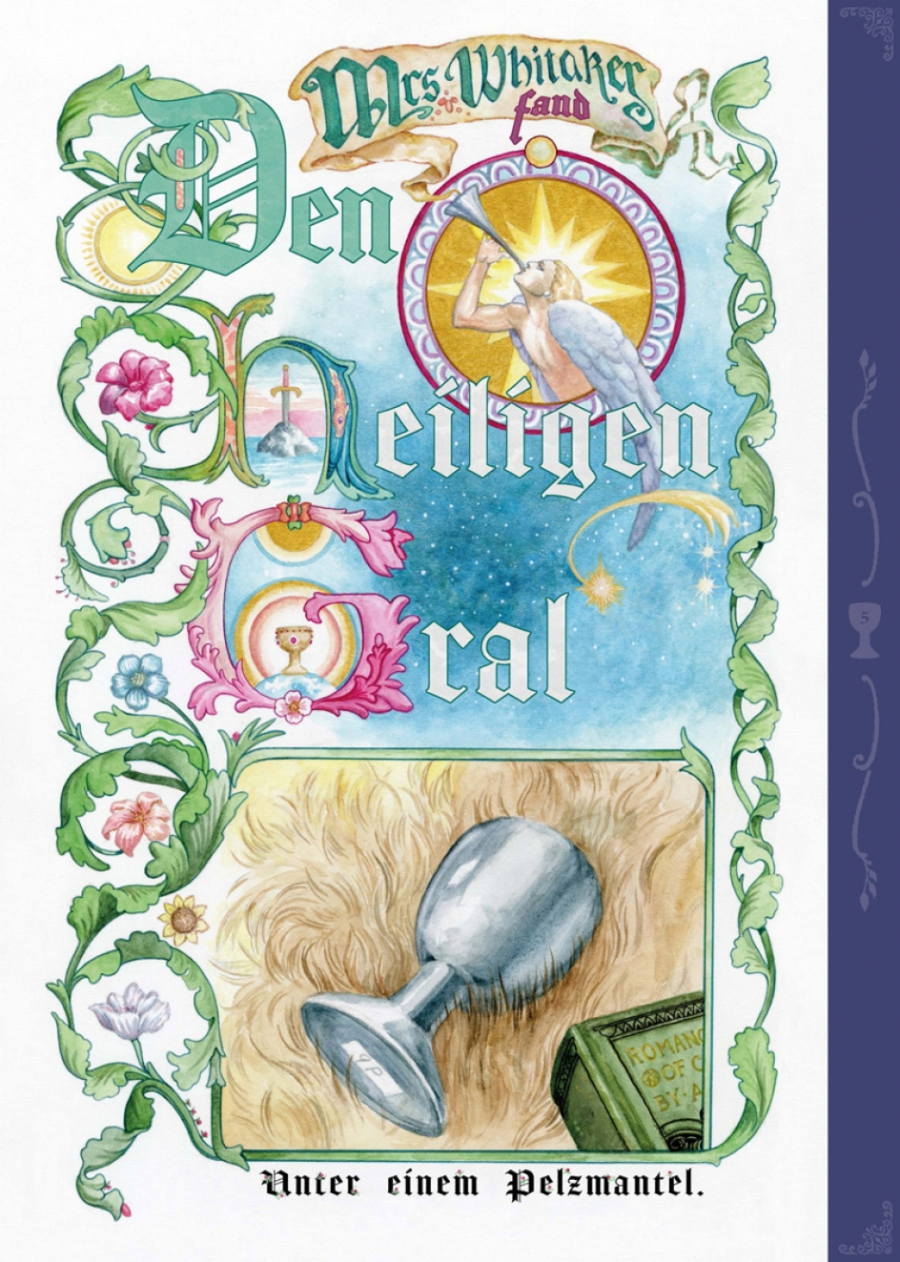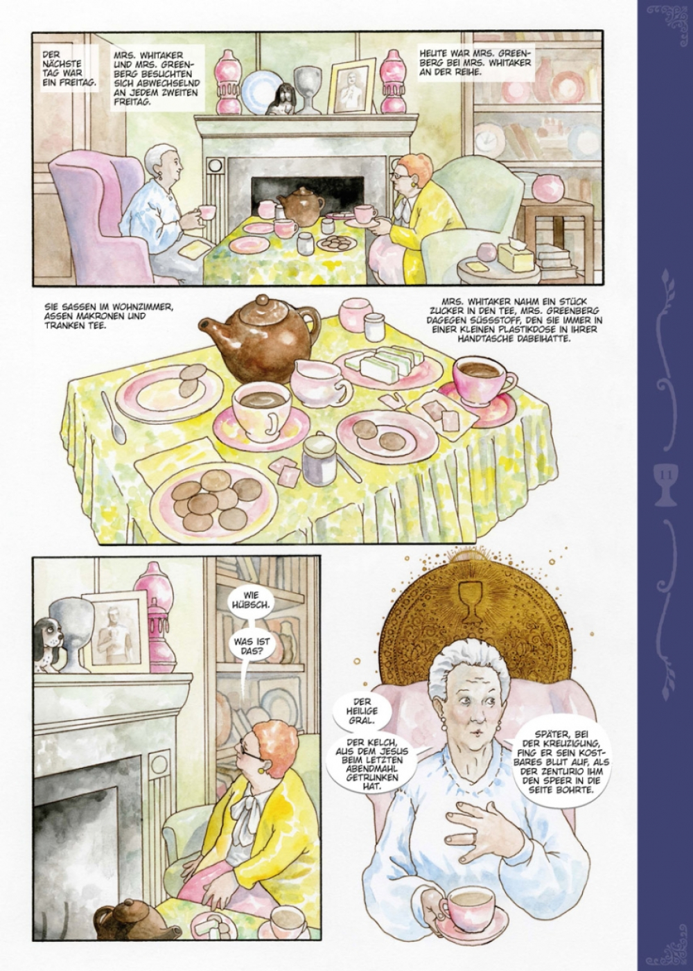 Jeden Donnerstag ging Mrs. Whitaker zuerst zur Post, um ihren Pensionsscheck abzuholen, und danach zum Oxfam-Shop, um ein bisschen zu stöbern. An jenem Tag fand sie zwei alte Taschenbücher und den Heiligen Gral und kaufte alles zusammen für 40 Pence. Danach ging sie zum Metzger und kaufte ein schönes Stück Leber fürs Dinner. Mrs. Whitaker stellte den Gral auf ihren Kaminsims, zwischen die Figurine des Bassets mit den treuen Augen und das Foto ihres verstorbenen Ehemannes Henry, denn da machte er sich gut. Sie staunt nicht schlecht, als am nächsten Tag der edle Galaad in strahlender Rüstung vor ihrer Tür steht, um seine Queste, die Suche nach dem Sang Real, endlich abzuschließen. Glücklicherweise ist eine britische Dame nicht so leicht aus der Ruhe zu bringen.