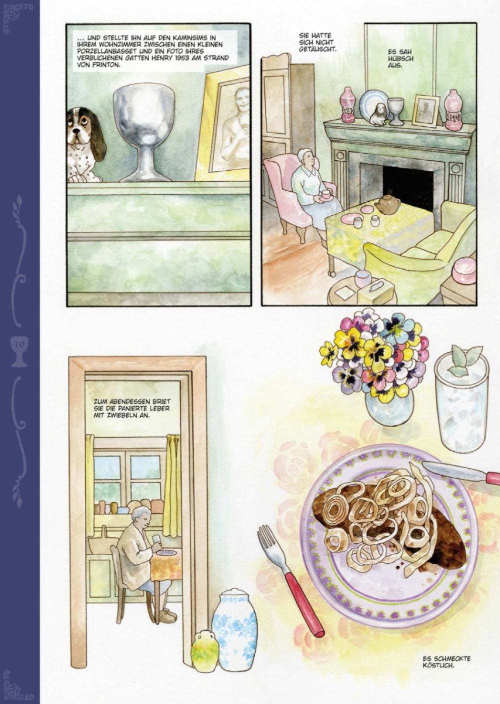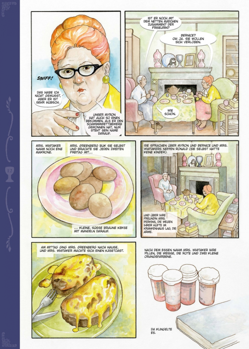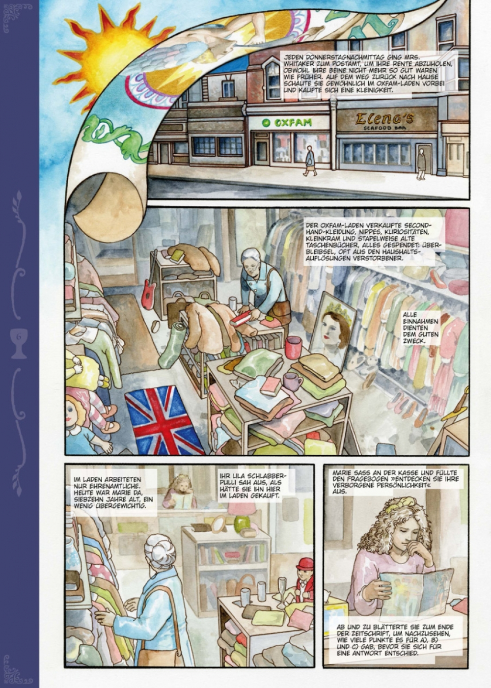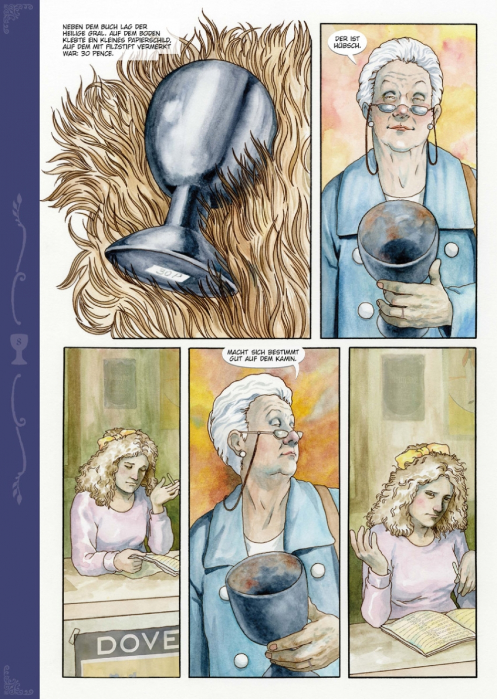 Jeden Donnerstag ging Mrs. Whitaker zuerst zur Post, um ihren Pensionsscheck abzuholen, und danach zum Oxfam-Shop, um ein bisschen zu stöbern. An jenem Tag fand sie zwei alte Taschenbücher und den Heiligen Gral und kaufte alles zusammen für 40 Pence. Danach ging sie zum Metzger und kaufte ein schönes Stück Leber fürs Dinner. Mrs. Whitaker stellte den Gral auf ihren Kaminsims, zwischen die Figurine des Bassets mit den treuen Augen und das Foto ihres verstorbenen Ehemannes Henry, denn da machte er sich gut. Sie staunt nicht schlecht, als am nächsten Tag der edle Galaad in strahlender Rüstung vor ihrer Tür steht, um seine Queste, die Suche nach dem Sang Real, endlich abzuschließen. Glücklicherweise ist eine britische Dame nicht so leicht aus der Ruhe zu bringen.