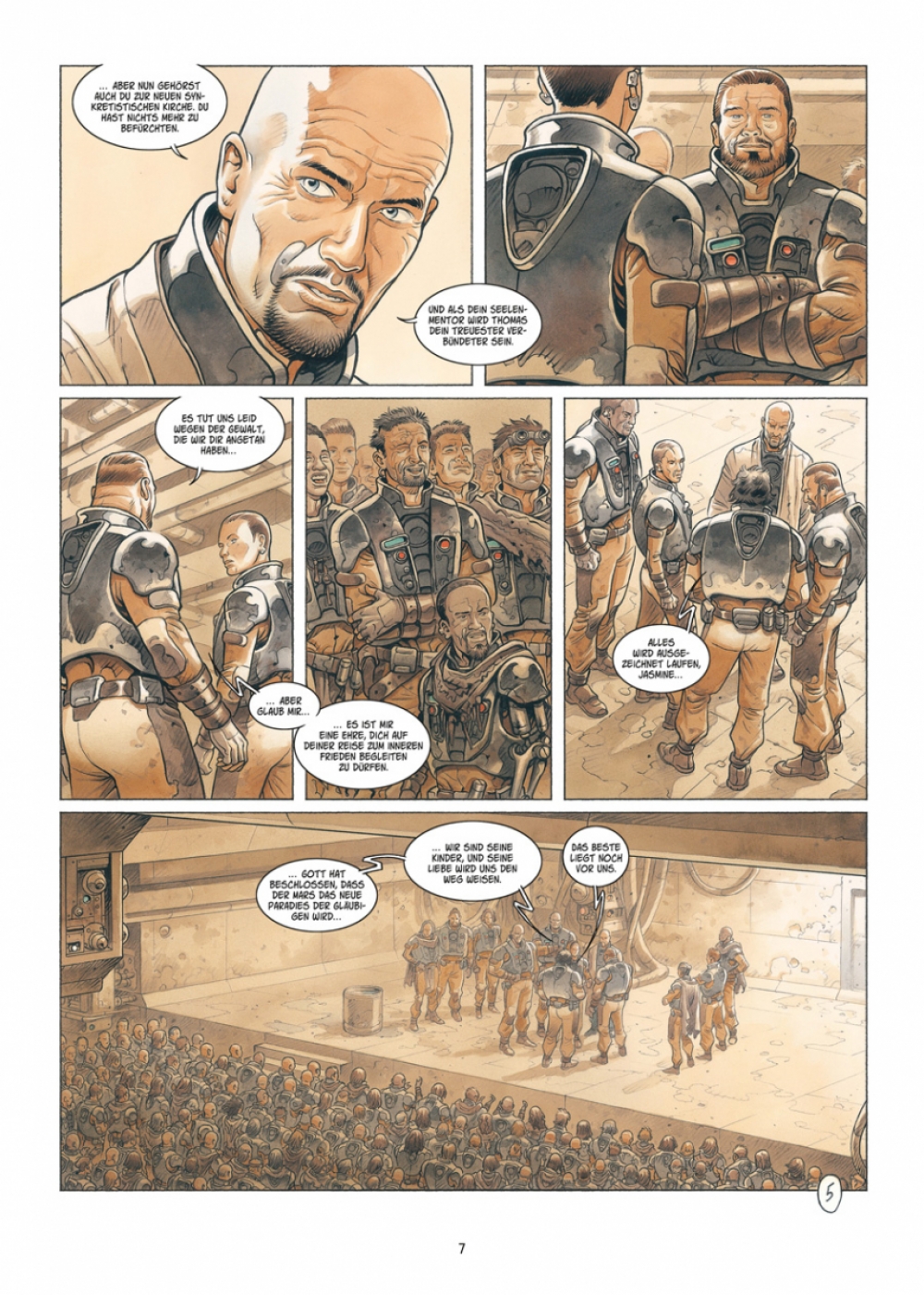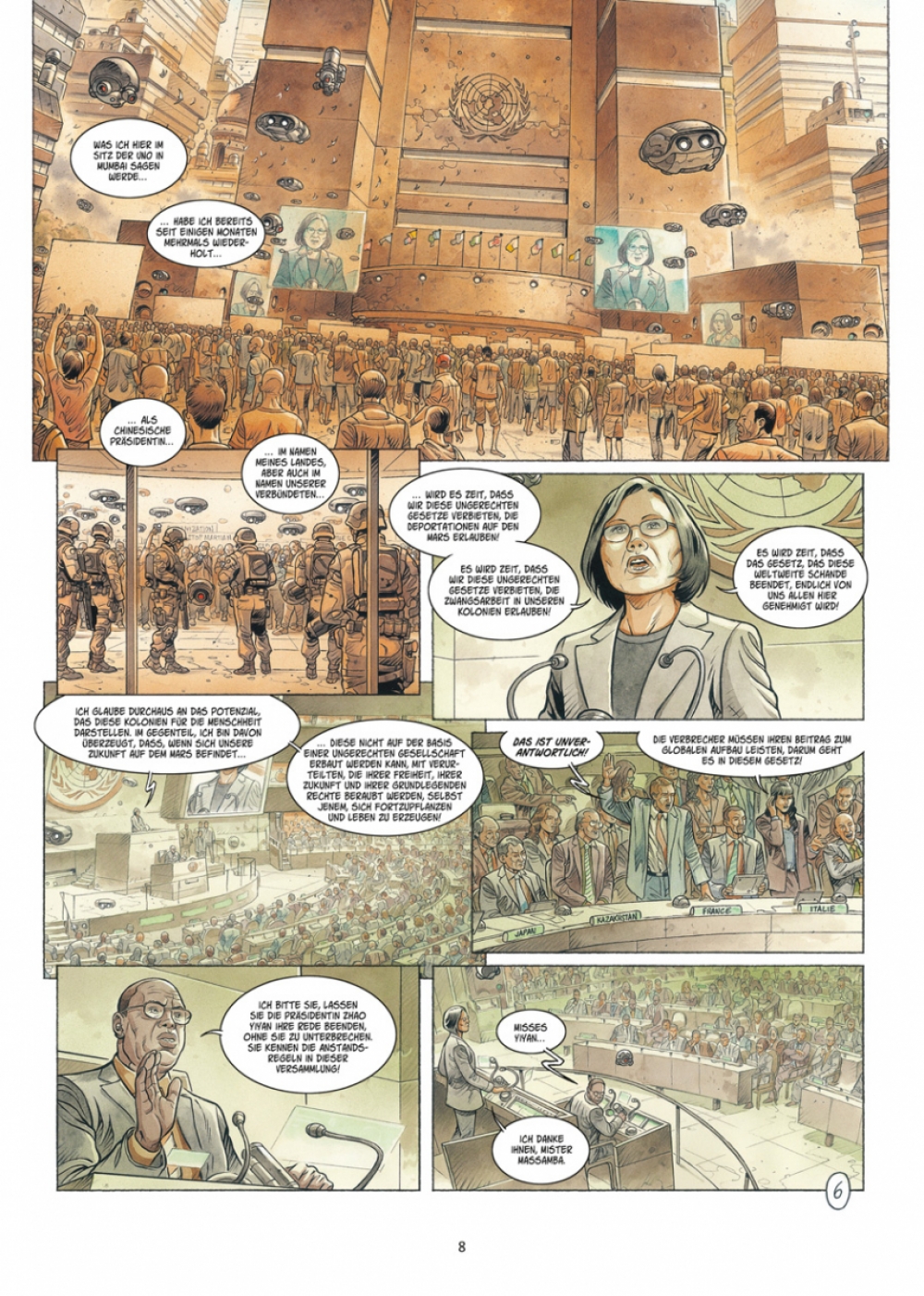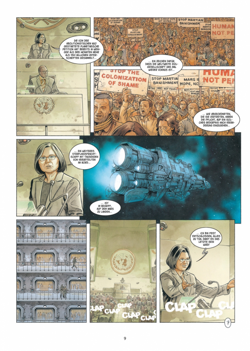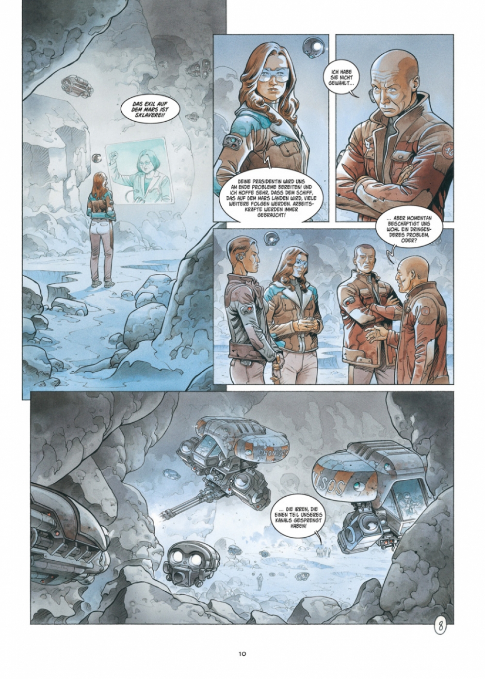 Das Jahr 2132. Die natürlichen Ressourcen der Erde sind endgültig erschöpft. Die Lösung: eine großangelegte Kolonialisierung des Mars. Um das kolossale Projekt zu stemmen, eine Infrastruktur auf dem roten Planeten aufzubauen mitsamt Bewässerungssystem und autarker Sauerstoffversorgung, werden Gefangene von der Erde deportiert und zur Zwangsarbeit eingesetzt. Jasmin Stenford ist mit der letzten Ladung Sträflinge auf dem Mars angekommen, und jetzt muss sie zusehen, wie sie sich in dieser Gesellschaft aus Schmugglern, Dieben und Halsabschneidern zurechtfindet. Denn ein Rückreiseticket hat sie nicht bekommen. Sci-Fi-Veteran Sylvain Runberg (»Orbital«) bleibt seiner Linie treu. Nach Aliens und sonstigen »Star Trek«-Versatzstücken such man in »On Mars_« vergeblich. Stattdessen lotet Runberg die Prämisse einer nahen Zukunft aus, in welcher der Fortbestand der Menschheit von einer Gefangenenkolonie abhängt – politisch, philosophisch, religiös. Gruns realistischer und bis ins kleinste Detail ausgearbeiteter Stil fügt sich nahtlos in diese Fiktion.