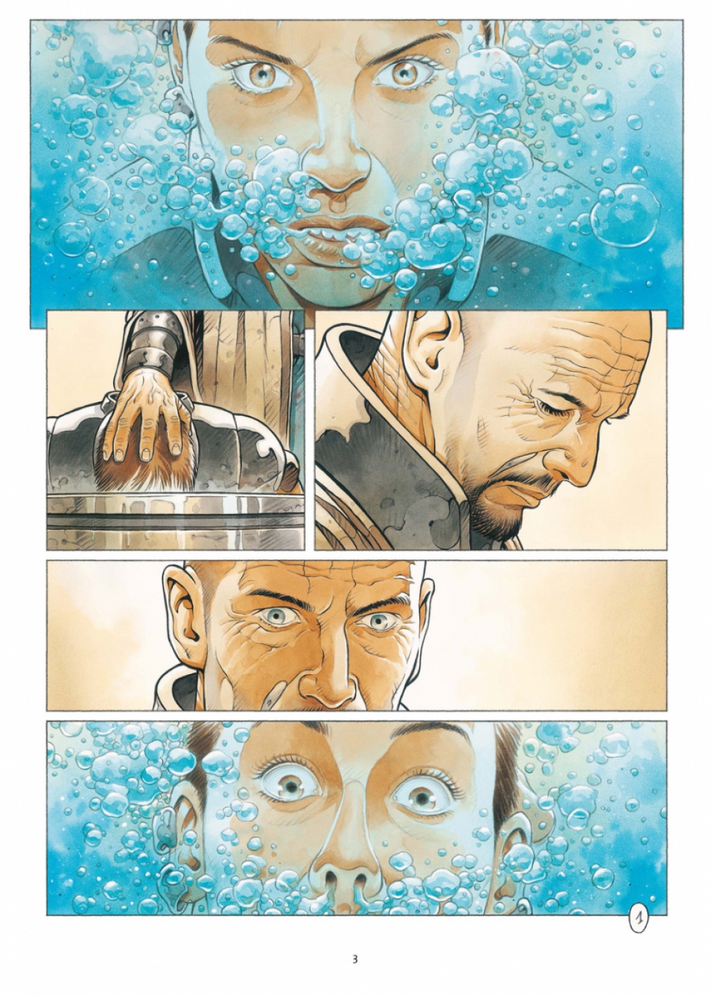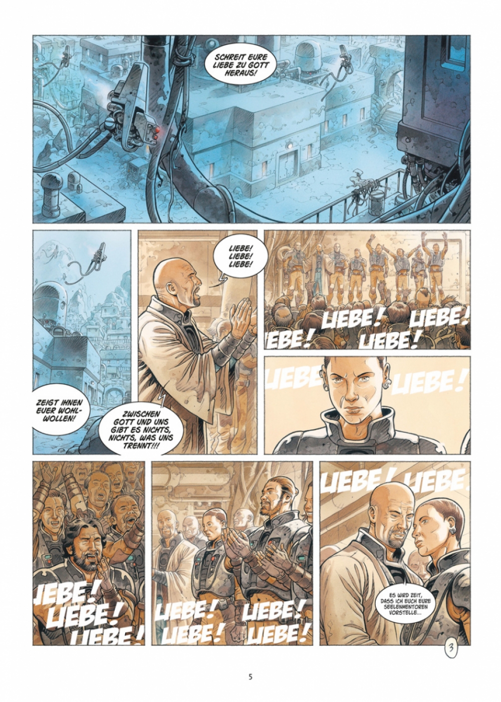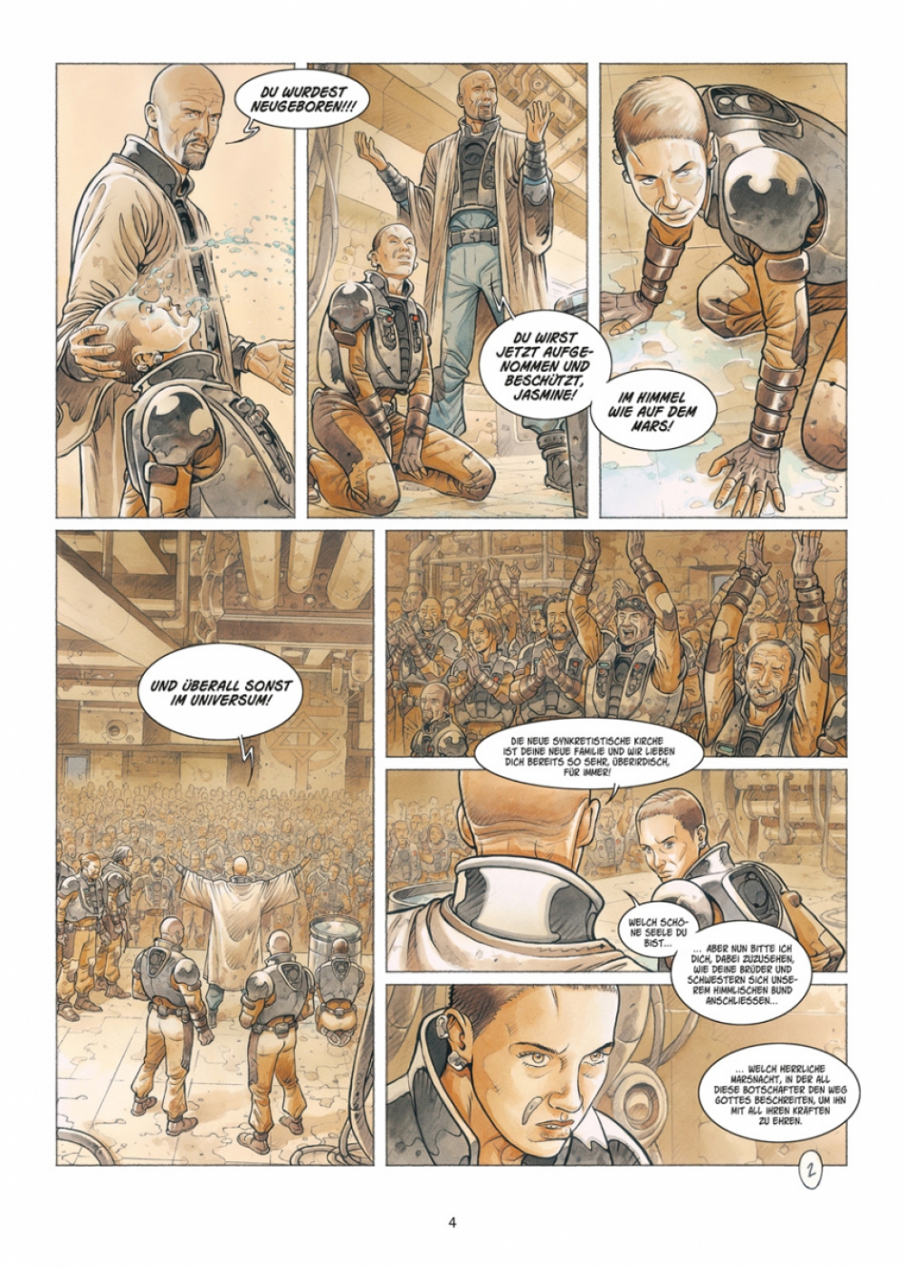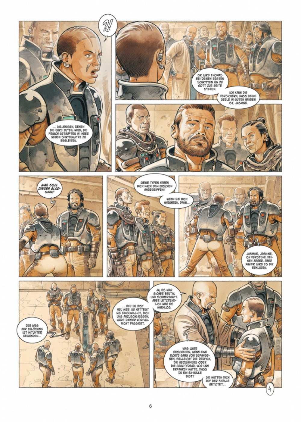 Das Jahr 2132. Die natürlichen Ressourcen der Erde sind endgültig erschöpft. Die Lösung: eine großangelegte Kolonialisierung des Mars. Um das kolossale Projekt zu stemmen, eine Infrastruktur auf dem roten Planeten aufzubauen mitsamt Bewässerungssystem und autarker Sauerstoffversorgung, werden Gefangene von der Erde deportiert und zur Zwangsarbeit eingesetzt. Jasmin Stenford ist mit der letzten Ladung Sträflinge auf dem Mars angekommen, und jetzt muss sie zusehen, wie sie sich in dieser Gesellschaft aus Schmugglern, Dieben und Halsabschneidern zurechtfindet. Denn ein Rückreiseticket hat sie nicht bekommen. Sci-Fi-Veteran Sylvain Runberg (»Orbital«) bleibt seiner Linie treu. Nach Aliens und sonstigen »Star Trek«-Versatzstücken such man in »On Mars_« vergeblich. Stattdessen lotet Runberg die Prämisse einer nahen Zukunft aus, in welcher der Fortbestand der Menschheit von einer Gefangenenkolonie abhängt – politisch, philosophisch, religiös. Gruns realistischer und bis ins kleinste Detail ausgearbeiteter Stil fügt sich nahtlos in diese Fiktion.