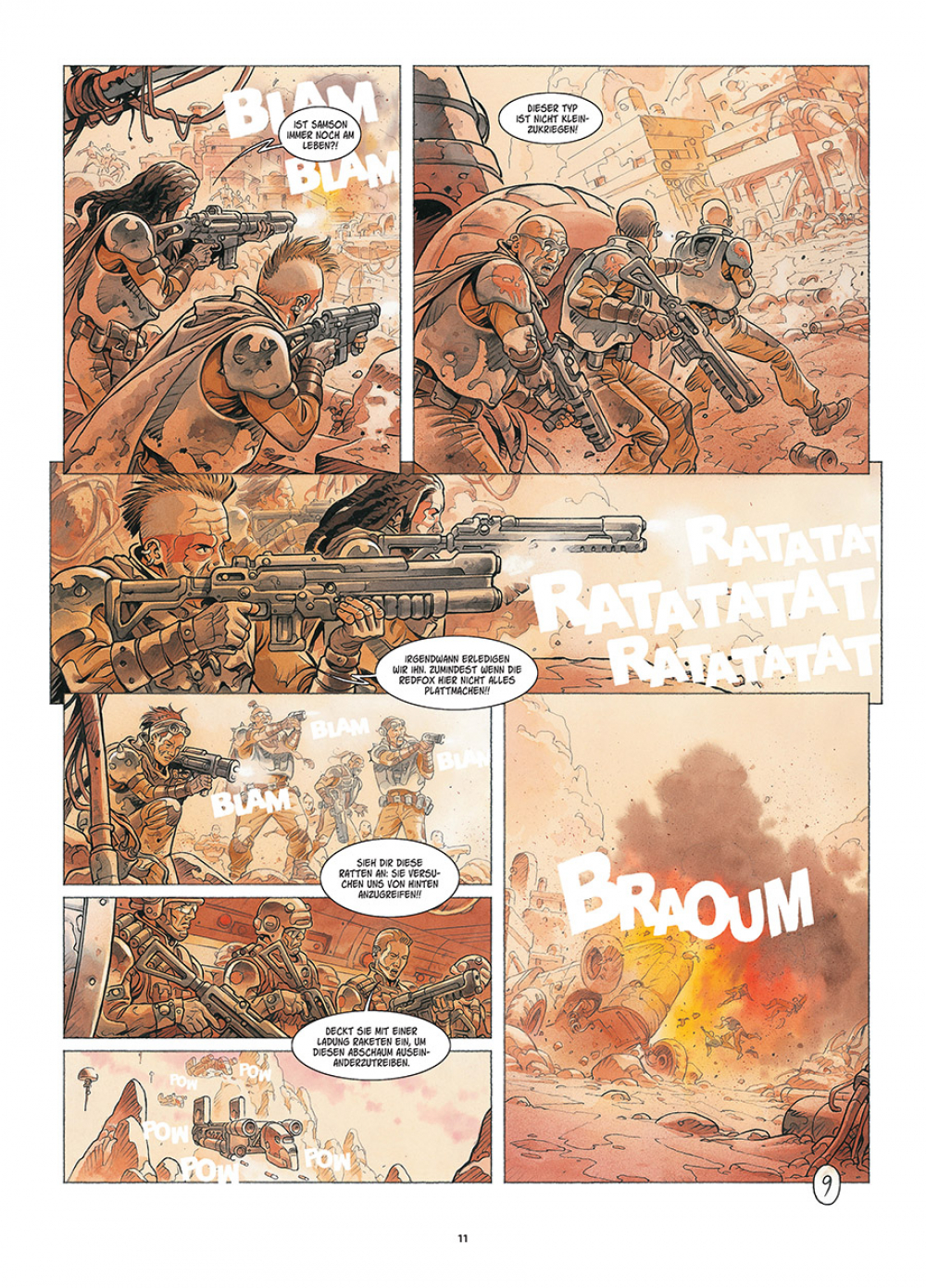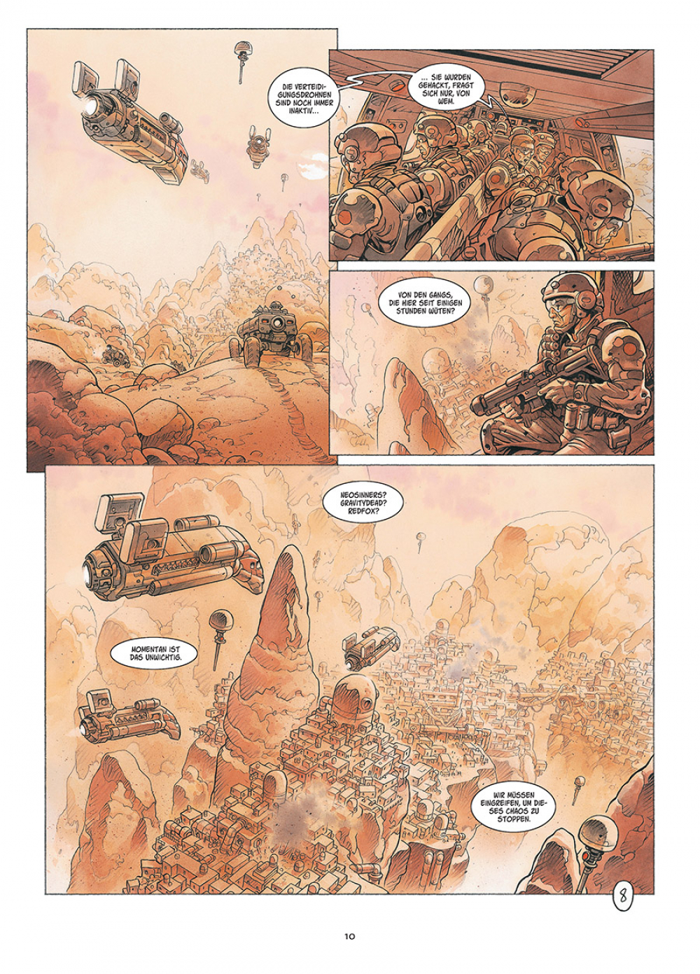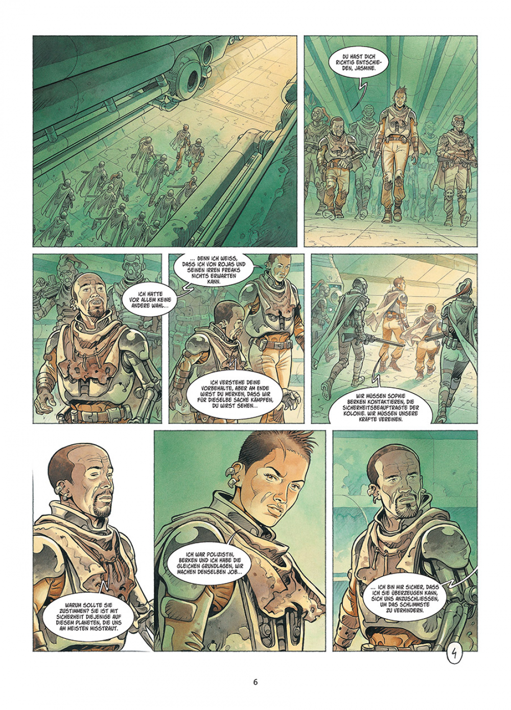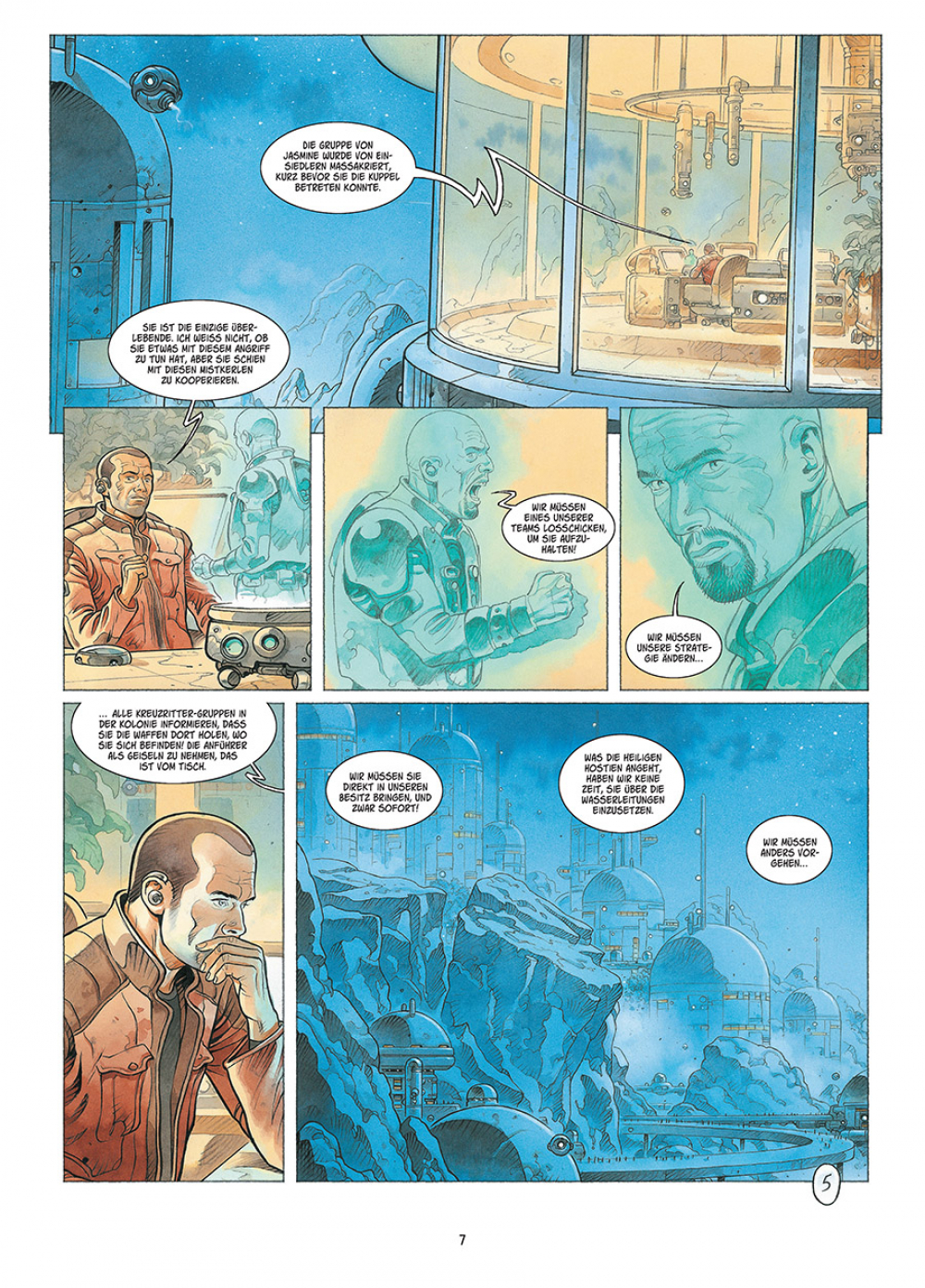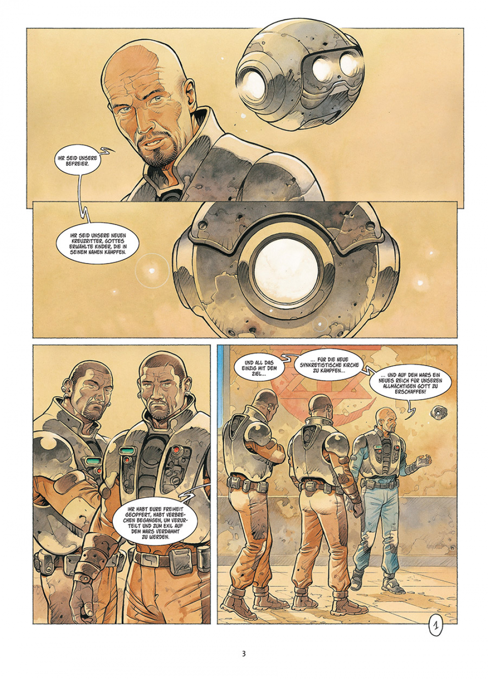 Sci-Fi-Veteran Sylvain Runberg (»Orbital«) bleibt seiner Linie treu. Nach Aliens und sonstigen »Star Trek«-Versatzstücken such man in »On Mars_« vergeblich. Stattdessen lotet Runberg die Prämisse einer nahen Zukunft aus, in welcher der Fortbestand der Menschheit von einer Gefangenenkolonie abhängt – politisch, philosophisch, religiös. Gruns realistischer und bis ins kleinste Detail ausgearbeiteter Stil fügt sich nahtlos in diese Fiktion.