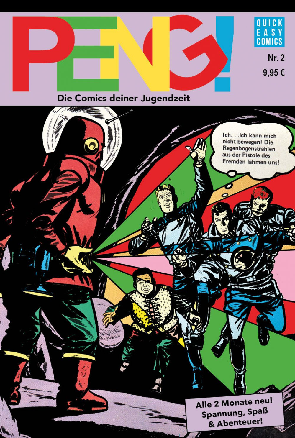 Auch PENG! Nr. 2 wartet mit einem bunten Stil- und Genre-Mix auf und nimmt den Leser auf eine wilde Reise in die Jugendjahre mit. BIMBA bringt Abenteuer & Erotik, die ASTRO-FLITZER entführen uns ins Weltall und Höhlenmensch SHMEGEGGI in die Steinzeit. Der 1997 verstorbene Zeichner Benito Jacovitti überrascht mit Märchenhaftem, und der SCHWARZE FALKE bekommt es mit einem kosmischen Plünderer vom Pluto zu tun. Und auch gruselig wird es mit "Die Rache vom Rhein" ebenfalls wieder.