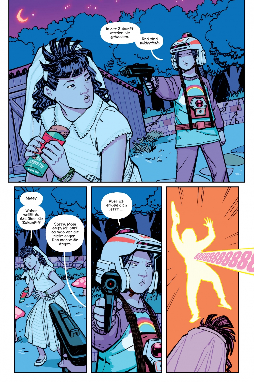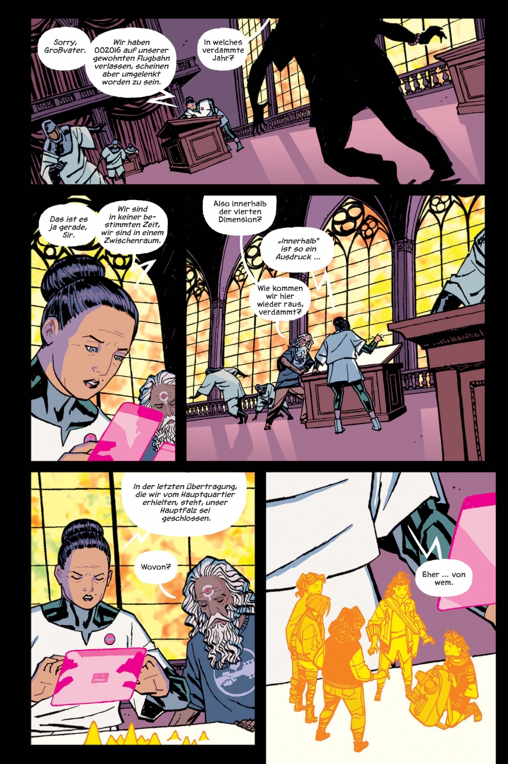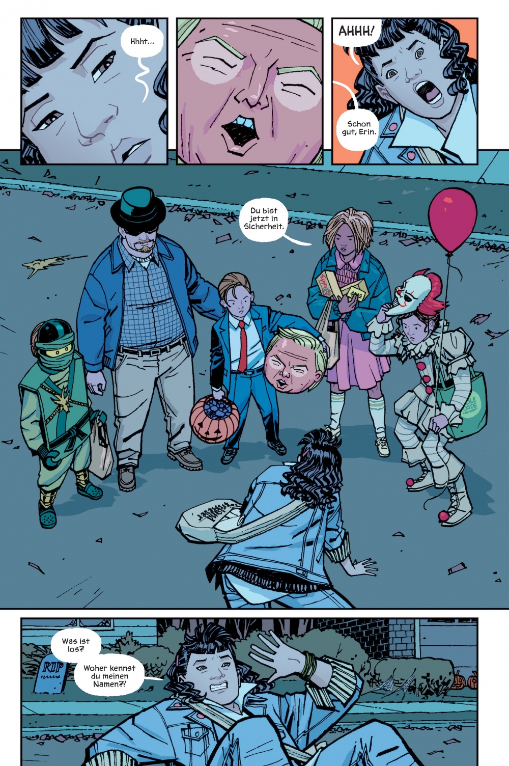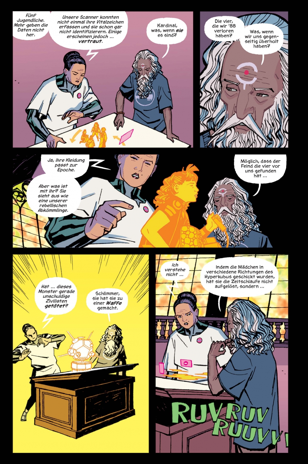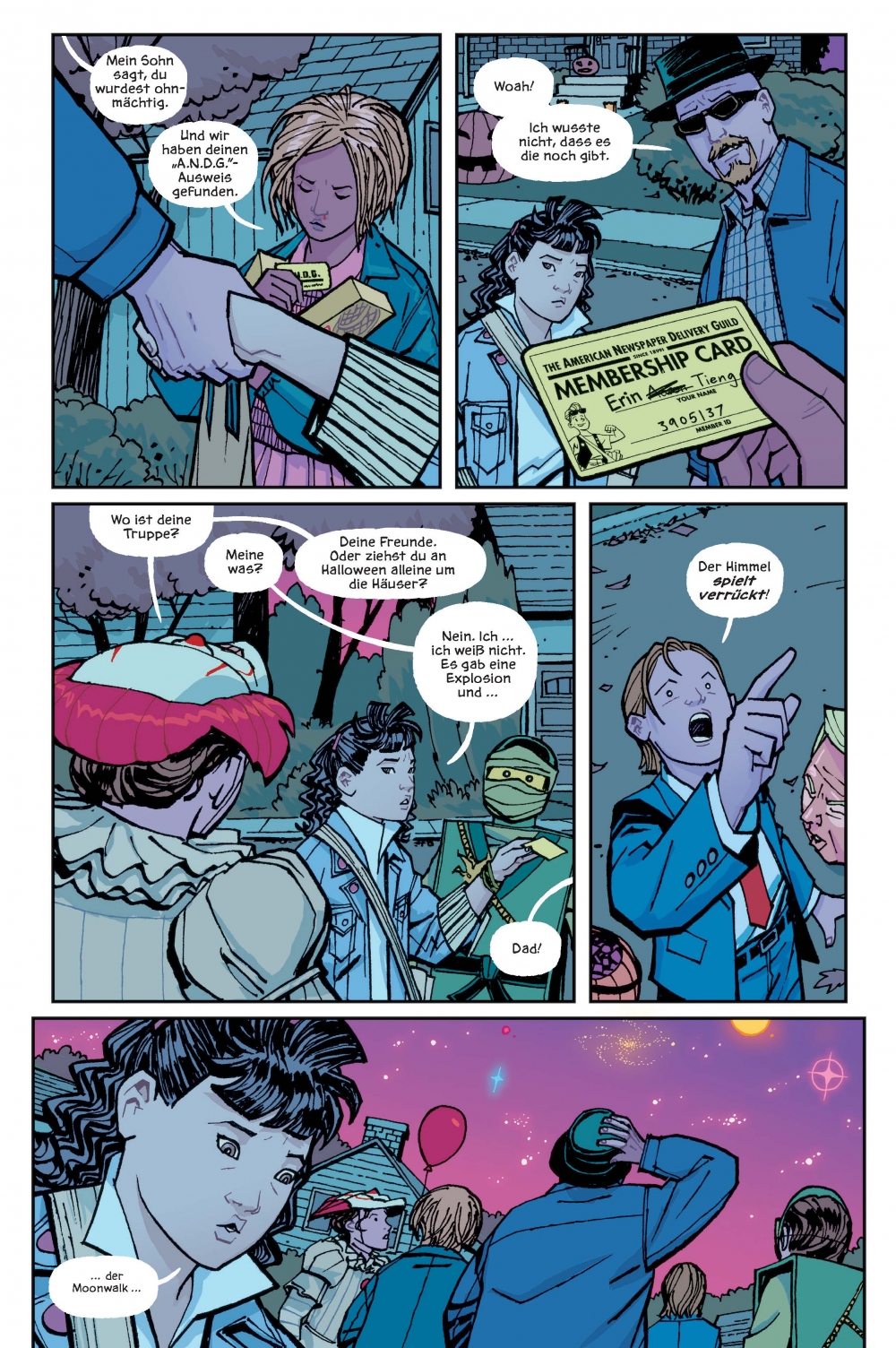 Tiffany, Mac und Co. haben in der fernen Zukunft neue Freunde und alte Verbündete getroffen. Doch gerade, als sich die Zusammenhänge ihrer ungeplanten Zeitreisen zu offenbaren schienen, werden sie von einem alten Feind überrascht – und voneinander getrennt. In die verschiedensten Zeitalter zerstreut beginnt ein letztes großes Abenteuer für die Paper Girls! Werden sie endlich den Weg nach Hause finden?
