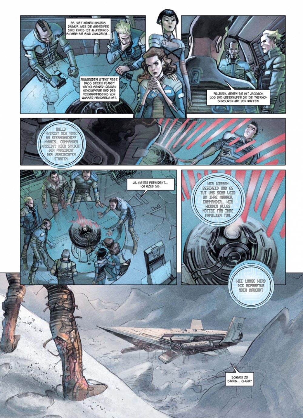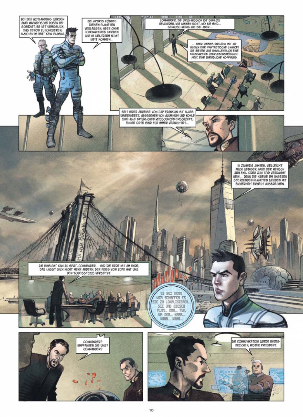 Im Jahr 2082 ist die Erde geplündert, wesentliche Ressourcen sind aufgebraucht, und ein apokalyptischer Krieg zwischen Ost und West mit biologischchemischen Kampfmitteln inklusive Atomschlag hat dem geschundenen Planeten den Rest gegeben. Die Menschen stehen am Abgrund, eine Ersatz-Erde ist jetzt dringend vonnöten. Glücklicherweise ist das Raumschiff Hybris gerade dabei, eine solche zu erkunden. Die Grundvoraussetzungen dort sind auch gar nicht so schlecht, die Luft ist zumindest atembar, das Klima allerdings eisig.
