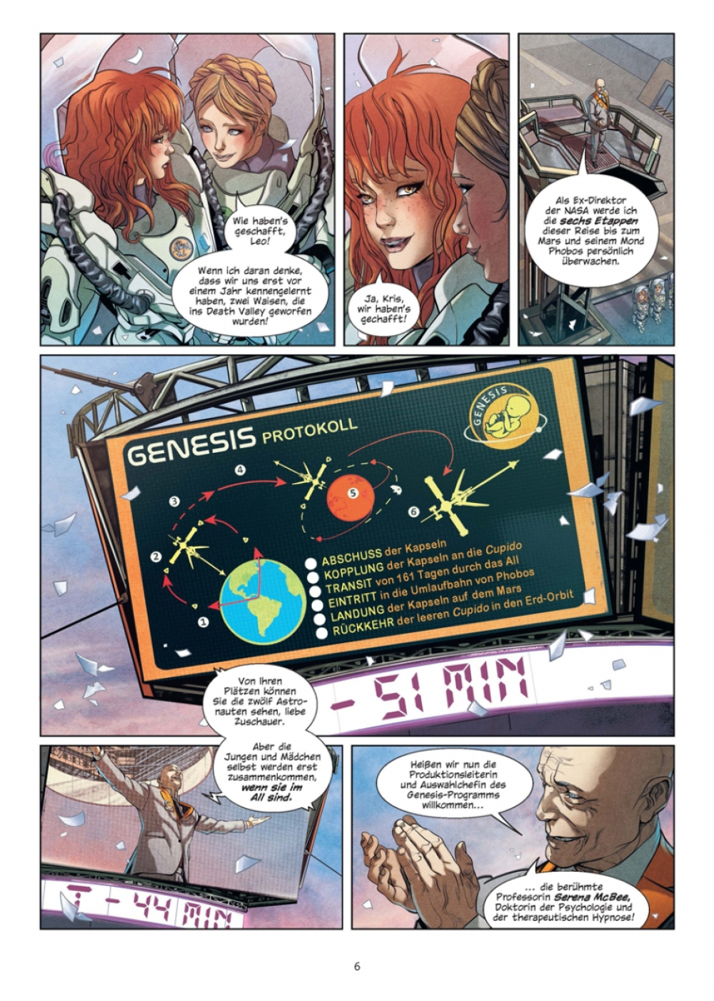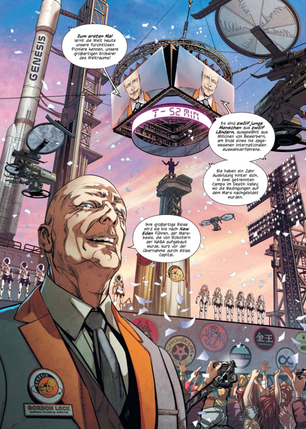 Nachdem die NASA an der Eroberung des Weltalls gescheitert ist, übernimmt die Investmentfirma Atlas Capital das Raumschiffruder: Sie stampft das Genesis-Programm aus dem Boden, das ehrgeizigste Projekt zur Besiedelung des Mars aller Zeiten. Und die hochkarätigste Reality-Show in der Mediengeschichte! 12 Teilnehmer zwischen 17 und 20 Jahren, 6 Frauen und 6 Männer, wurden aus Tausenden von Bewerbern auserkoren, um auf der langen Reise zum Roten Planeten durch sechsminütige Speed-Dates Partner für den Rest ihres Lebens zu finden, damit sie die neue Kolonie mit Nachwuchs füllen können. Lästerei, Intrigen und Verrat lassen nicht lange auf sich warten, denn das Publikum auf der Erde verlangt nach Unterhaltung!