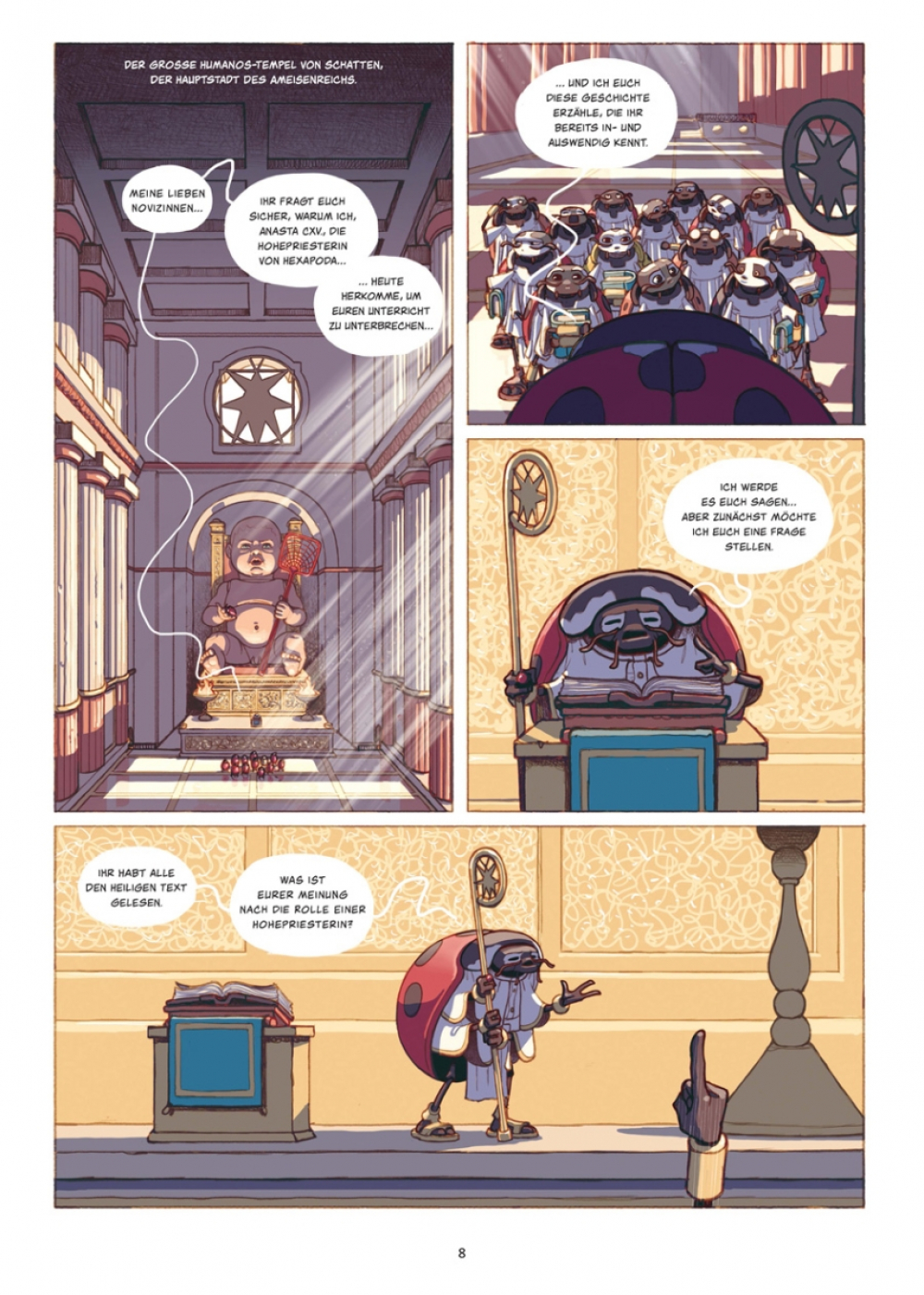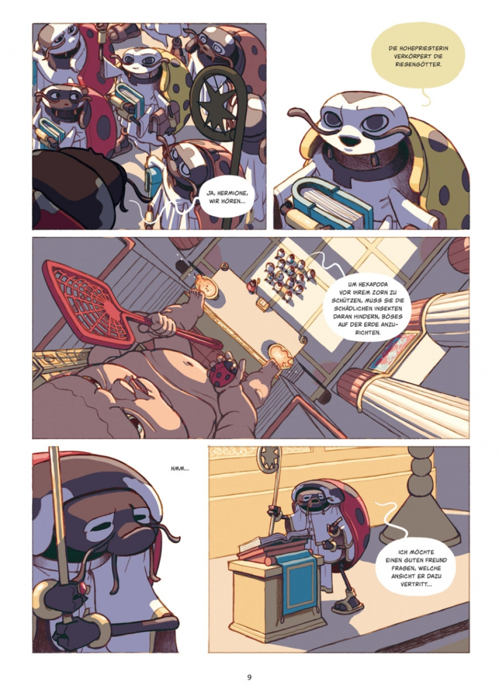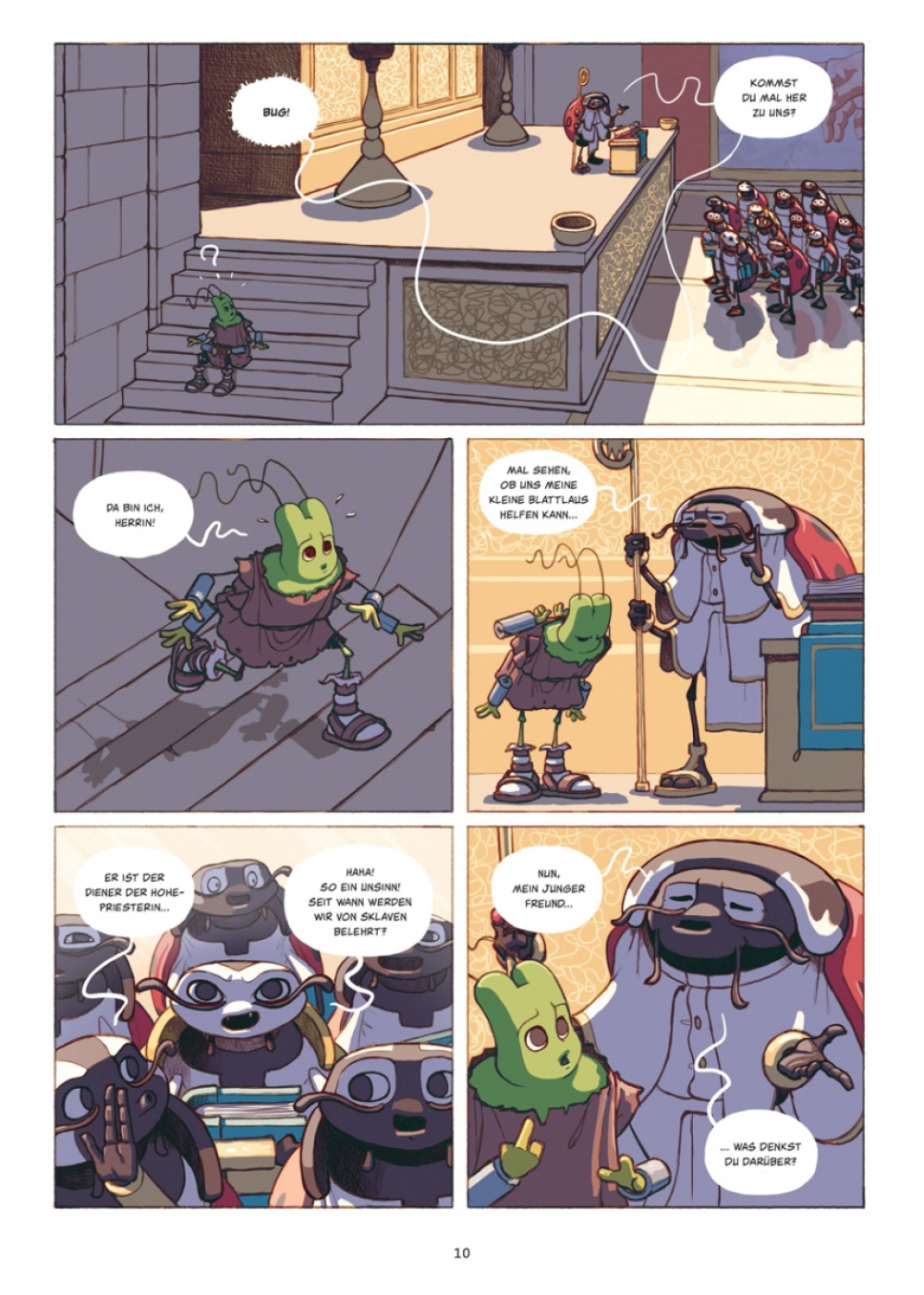 Bug, die Blattlaus, ist ein treuer Diener der Hohepriesterin im Kult der verschwundenen Götter. Die streng hierarchische Gesellschaft der Insekten schätzt seine Spezies jedoch gering, und als die Priesterin Opfer eines fatalen Anschlags wird, fällt der Verdacht sofort auf Bug. Wird die wackere Laus ihre Unschuld beweisen können?
