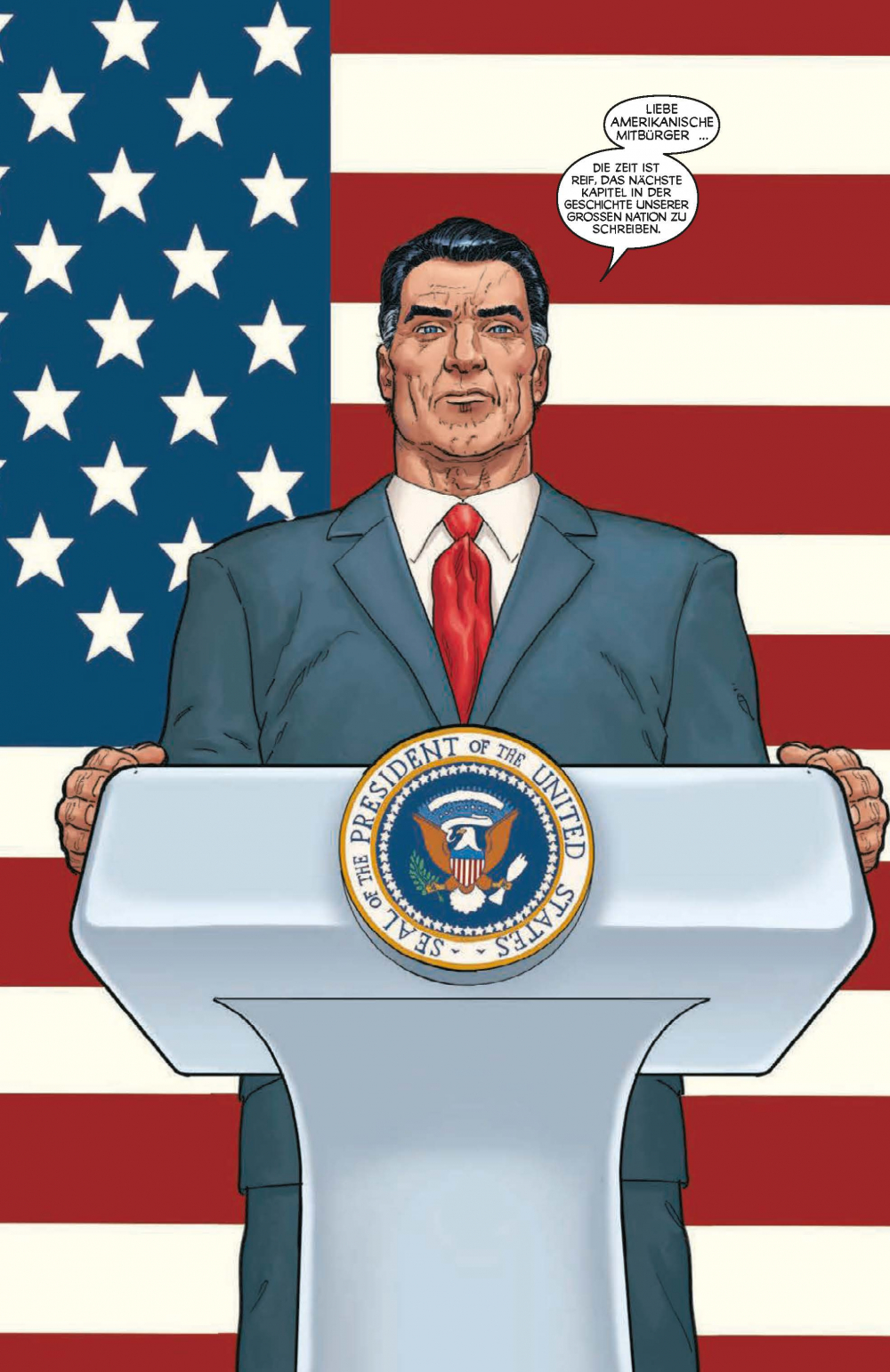 Als dann die Welt tatsächlich unterging, gelang es der Exekutive nicht mehr, den Bunker lebend zu erreichen, der amerikanischen Bürgerelite jedoch schon. Achtzig Jahre später hat sich einer aus den elitären Reihen dieser Überlebenden zum neuen Präsidenten der Vereinigten Staaten ernannt.