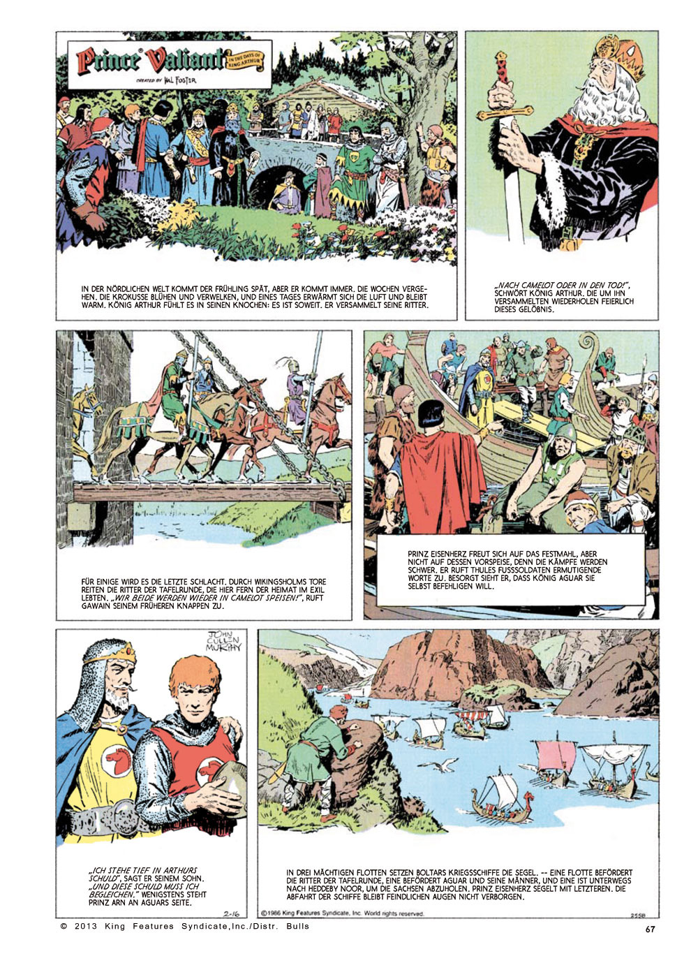 John Cullen Murphy war der auserkorene Nachfolger des genialen Hal Foster. Bis März 2004 (Seite 3501) führte er die Serie fort. 1971, das Jahr, in dem die letzte vollständig von Foster angefertigte Seite erschien, war nicht der Schlusspunkt der Beziehung zwischen Foster und seinem Prinzen. Noch bis Anfang 1980, er war jetzt stolze 87 Jahre alt, schrieb er die Story, überwachte die Farbgebung und fertigte Vorzeichnungen an. Diesen Zeitraum, die 'Foster & Murphy-Jahre', veröffentlicht der Bocola Verlag nun auch digital überarbeitet. Nicht zuletzt hat uns der Wunsch zahlreicher Fans nach Fortsetzung dazu bewogen, den Abenteuern des Prinzen aus Thule noch ein wenig länger zu folgen. Diese fünfbändige Reihe wird im Umfang und in der Ausstattung unserer Prinz Eisenherz Hal Foster-Gesamtausgabe sehr ähnlich sein.