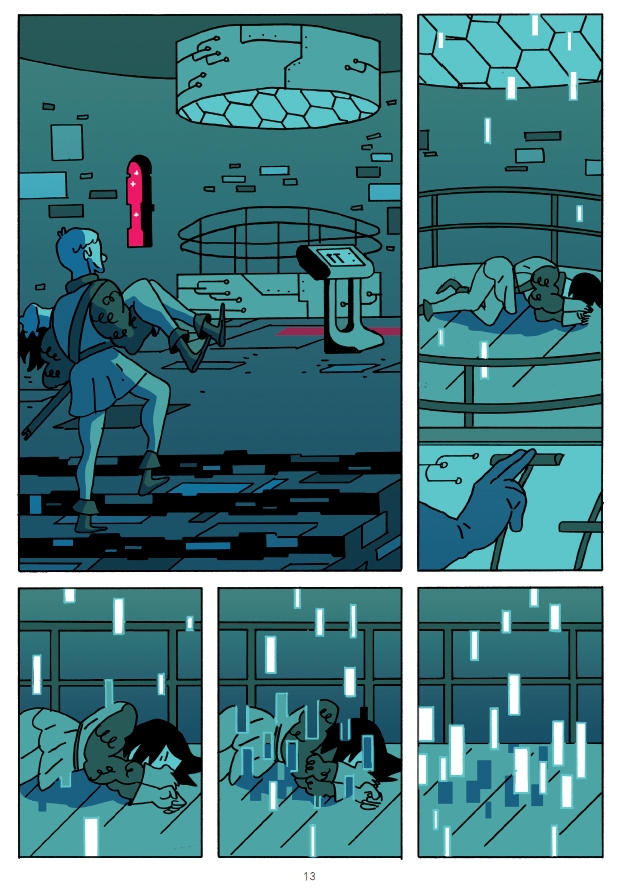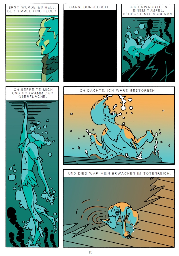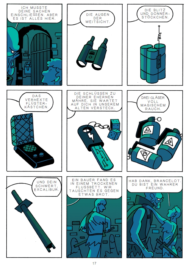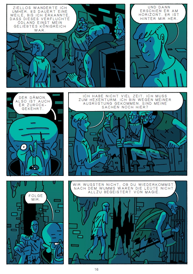 Nach seinem düsteren, nihilistischen Debüt “Die Verwerfung” und Adaptionen von Thomas Bernhards autobiografischen Texten schaltet Lukas Kummer den Kopf aus und lässt Herz und Bauch dem Stift diktieren. In “Prinz Gigahertz” arbeitet er sich visuell berauscht an der High Fantasy ab, lässt dabei scheinbar kein Klischee unbeachtet liegen und strickt aus den bekannten Zutaten des Genres ein spannendes Märchen für Erwachsene: Anleihen an Retro-Computerspiel-Ästhetik beherrschen die neon-gefärbten Bilder und vermischen somit das übliche Mittelalter-geprägte Setting mit einer naiven Tec-Magie, und einer gehörigen Portion Post-Apokalypse, in der auch der Blutzoll nicht zu gering ausfällt.