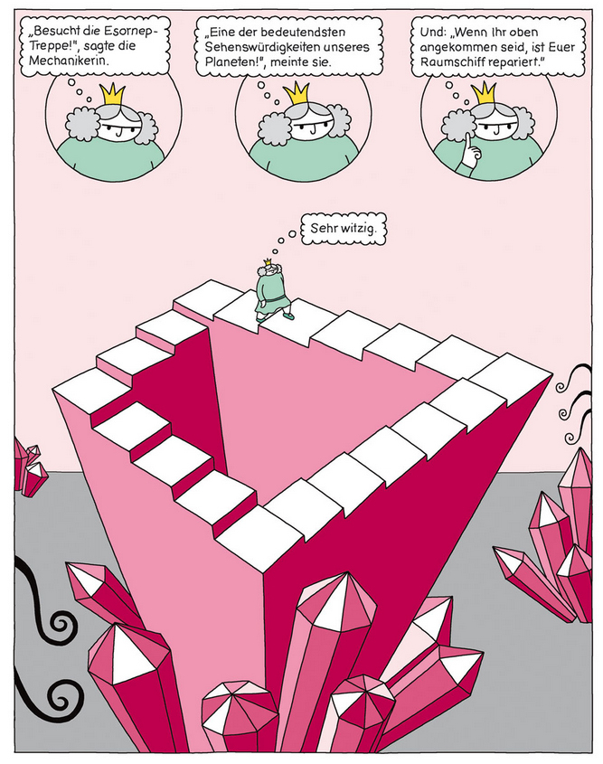 Petronias absurd komische Abenteuer zitieren Motive aus Der kleine Prinz, aus Märchen, Science-Fiction und Klassikern wie Die Odyssee. Auch grafisch sind sie voller Anspielungen: Mal sehen die Seiten aus wie ein Malen-nach-Zahlen-Bild, ein Spielbrett oder eine optische Täuschung à la M.C. Escher.