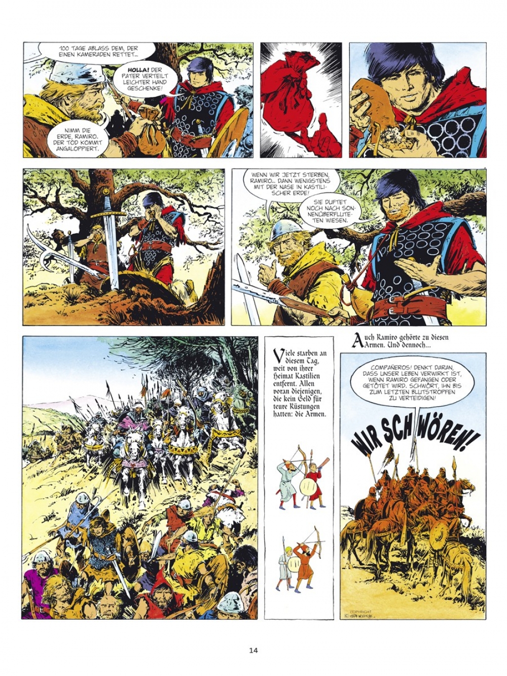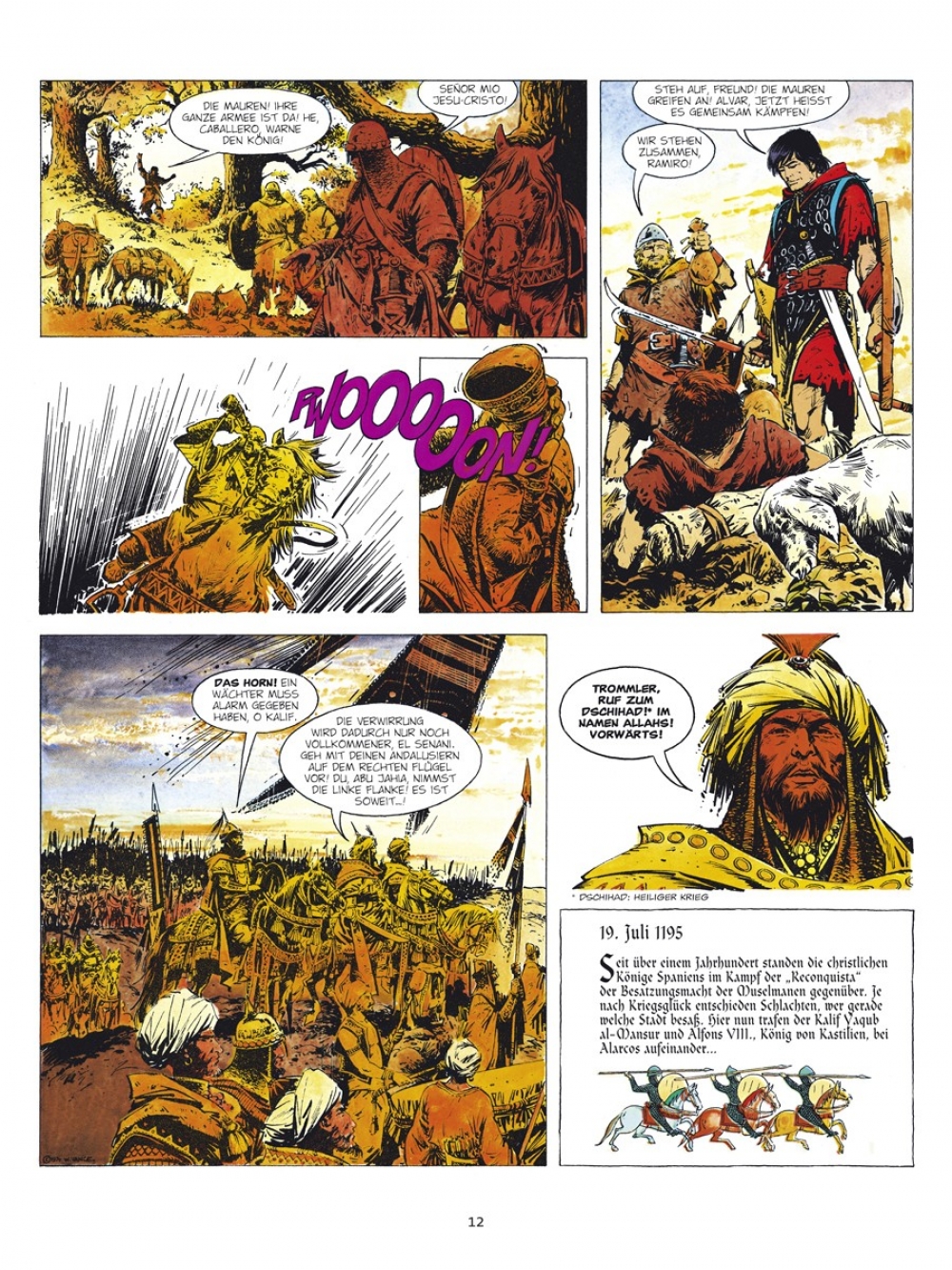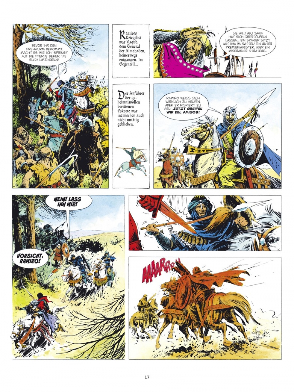 Der uneheliche Sohn des Königs von Kastilien, Ramiro, erhält von seinem Vater eine heikle Mission. Nachdem er zwei Pilger bis nach Santiago de Compostela begleitet hat, soll er einen sagenhaften Schatz, eine Erbschaft der Wisigoths, an sich bringen, der bereits mehrmals vor der Gier der maurischen Besatzer gerettet wurde. Der mutige junge Mann wird von dem Knappen Jos begleitet, den er auf lange Ritte durch das Spanien von König Alfonso VIII. mitnimmt. Das History-Meisterwerk von William Vance (Bruce J. Hawker) - endlich komplett auf Deutsch als Gesamtausgabe.
