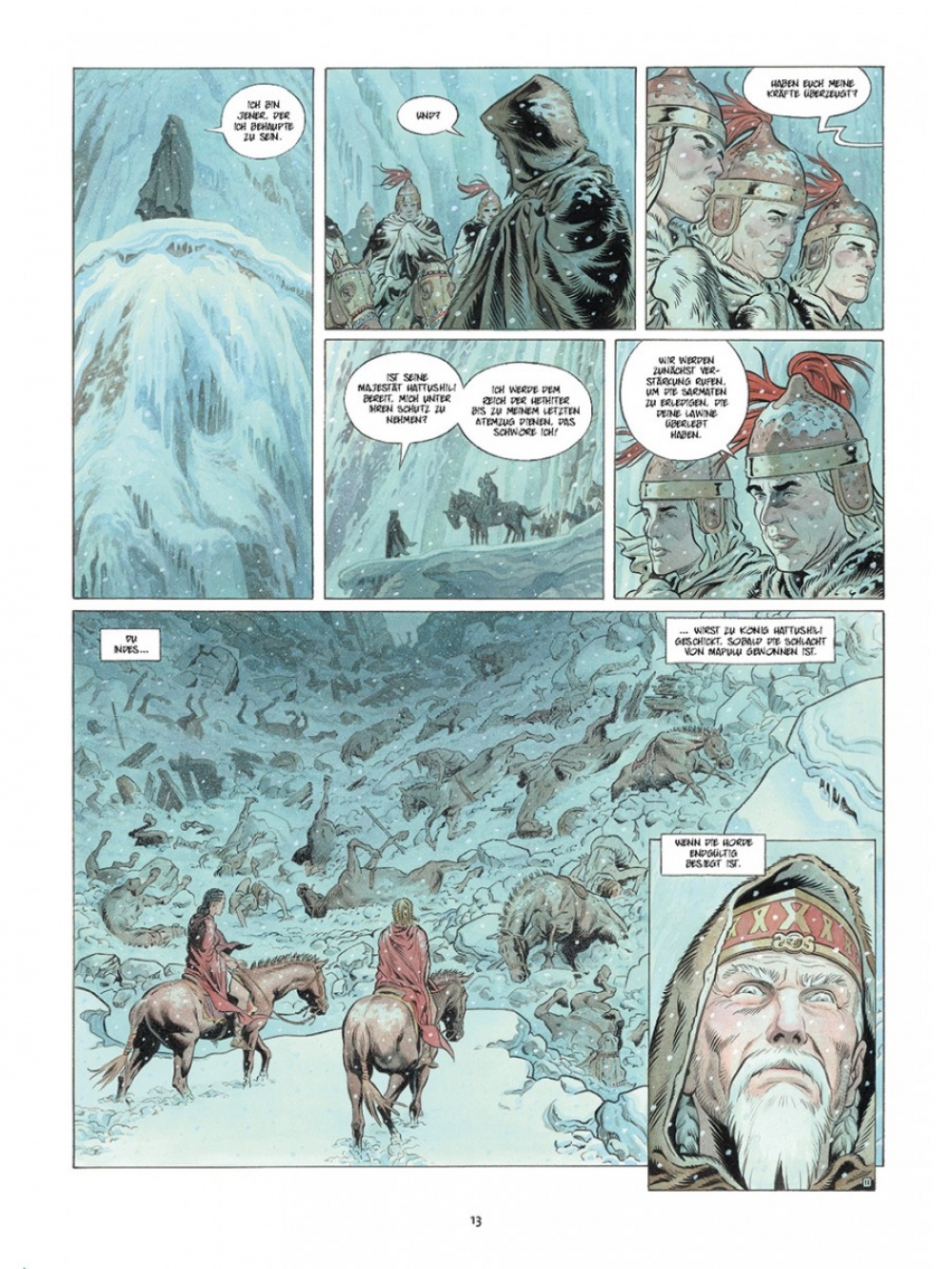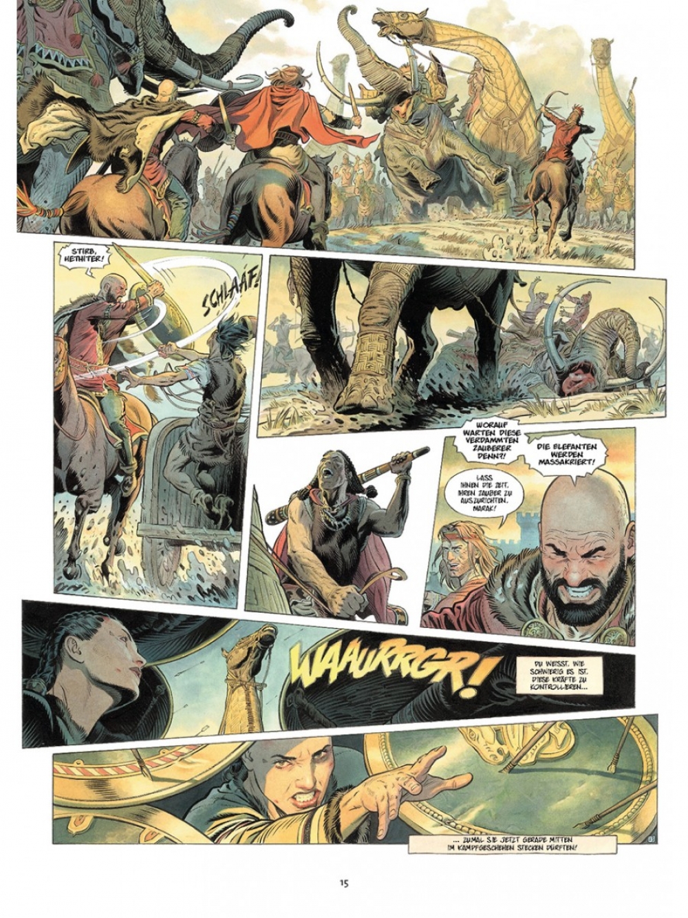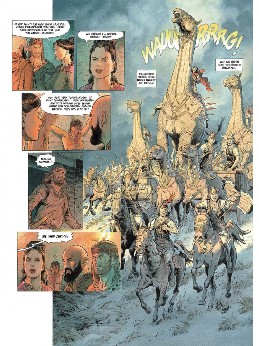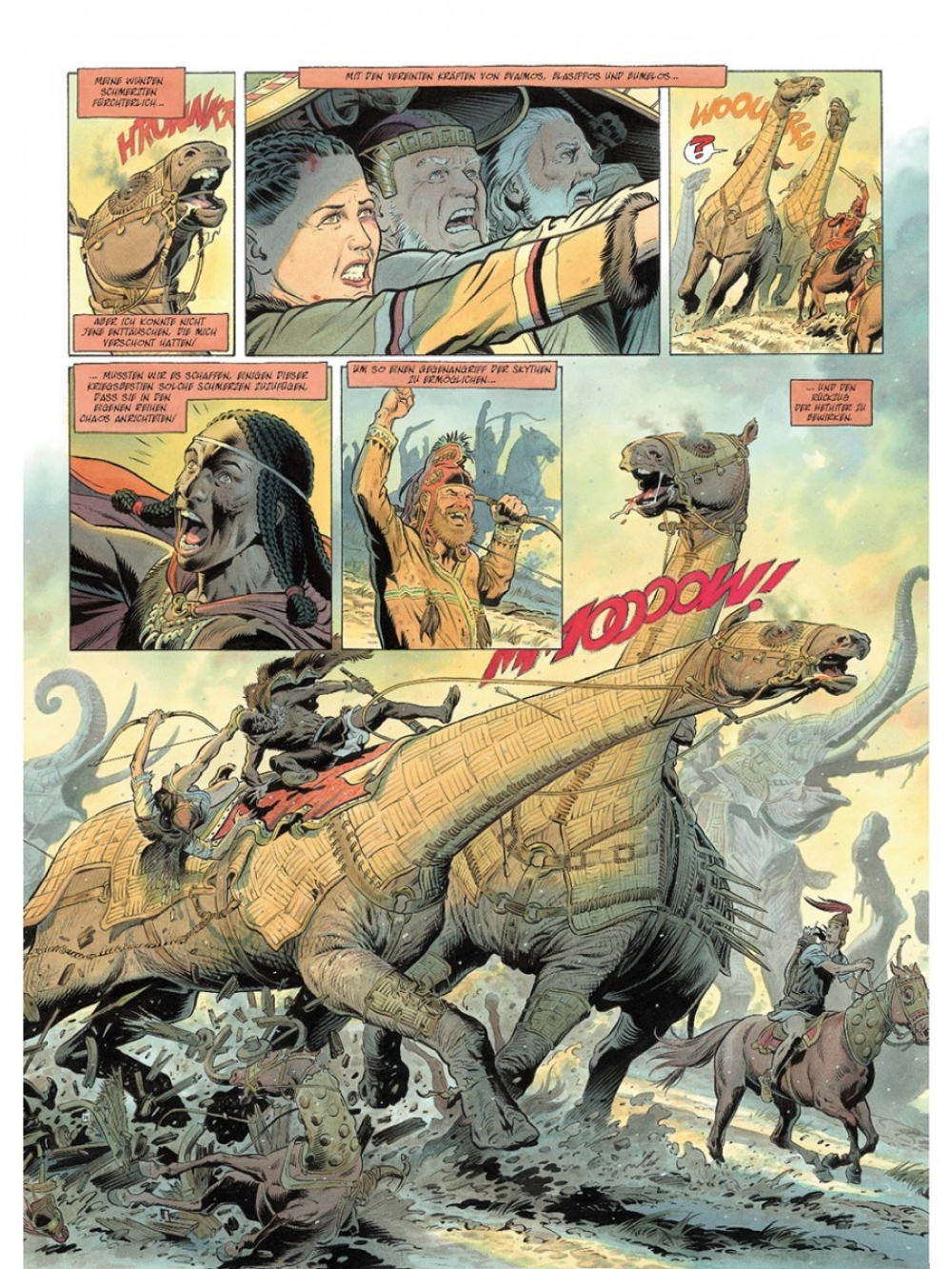 Vor langer Zeit lieferten sich zwei Stämme Kleinasiens, die Hethiter und die Skythen, einen unerbittlichen Krieg. Um dem hethitischen Militär zu trotzen, beenden die Herrscher der drei skythischen Reiche ihre Feindschaft und vereinen ihre Armeen. Hamurapi, König von Babylonien und Verbündeter der Skythen, entsendet seine Schreiberin Thusia, um über die Schlacht zu berichten, damit die denkwürdige Tat in der großen Bibliothek von Babylon nachgelesen werden kann. Darüber hinaus wird der Heereszug von fünf alten Hexern begleitet, den letzten Vertretern einer versunkenen Kultur. Tausende Krieger machen sich schließlich auf den Weg, mit rollenden Palästen, Elefanten, dressierten Bären und geheimnisvollen und furchterregenden Kreaturen, die in ausbruchssicheren Käfigen gehalten werden. Doch die Orakel verheißen den Kämpfern nichts Gutes…