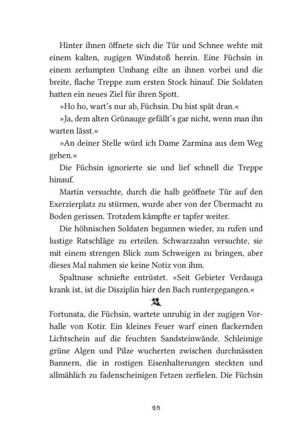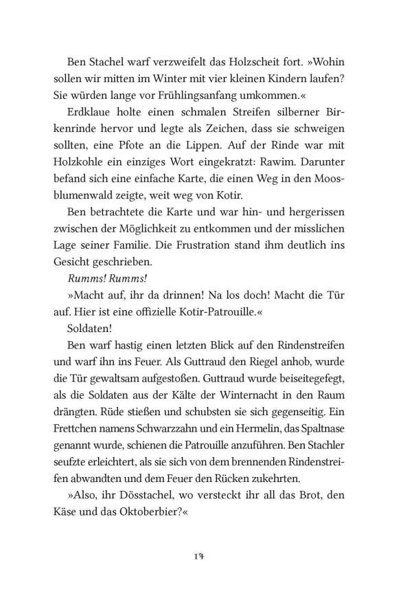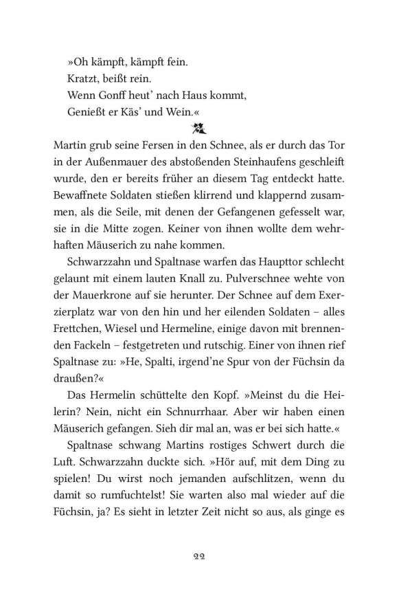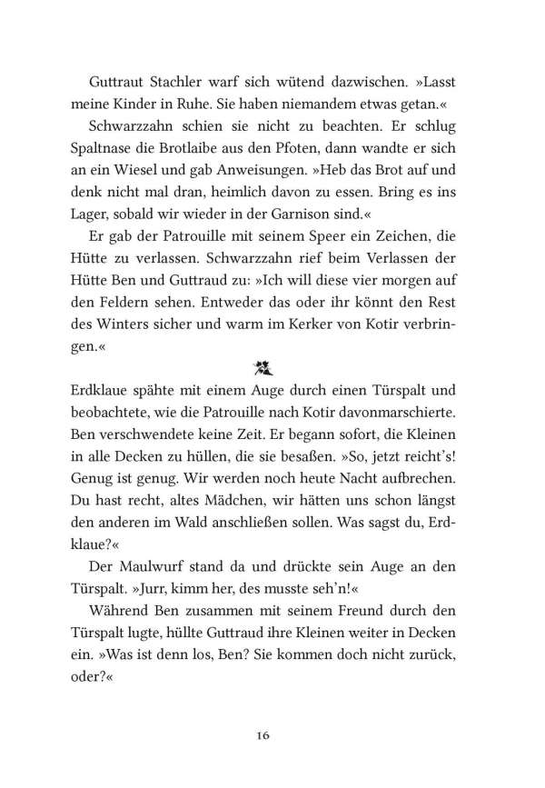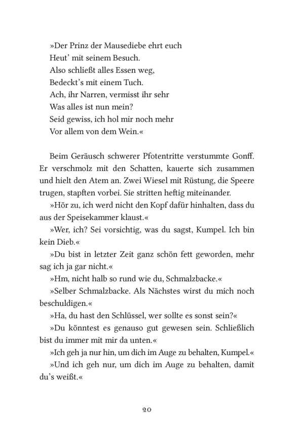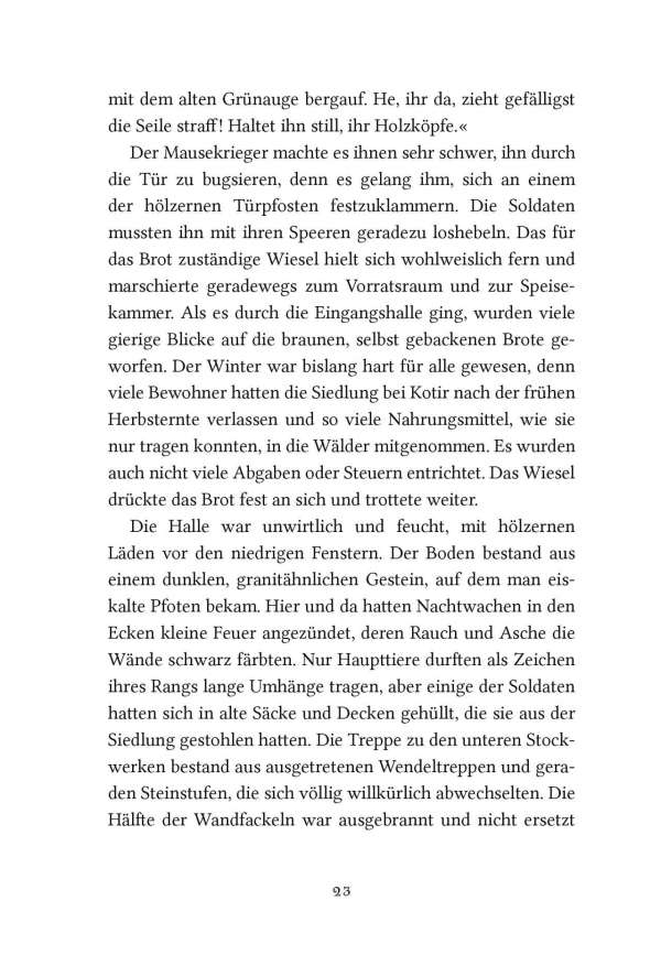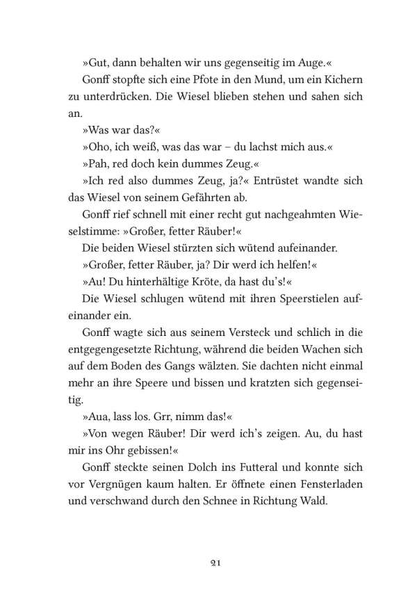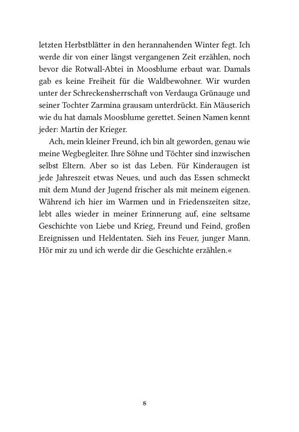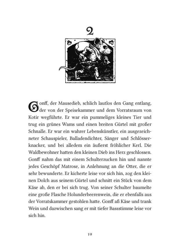 Die schlaue und gierige Wildkatze Zarina wird zur Herrscherin über die Mossflower Woods und ist entschlossen, die friedlichen Waldbewohner mit eiserner Hand zu regieren. Doch in den Tiefen des Kerkers von Schloss Kotir begegnen sich die mutige Maus Martin und der wortgewandte Mäusedieb Gonff. Die beiden entkommen und beschließen, Zarinas tyrannische Herrschaft zu beenden. Zusammen mit Kinny, dem Maulwurf, machen sich Martin und Gonff auf die gefährliche Suche nach Salamandastron – überzeugt, dass ihre einzige Hoffnung, Eber der Kämpfer, dort noch lebt.