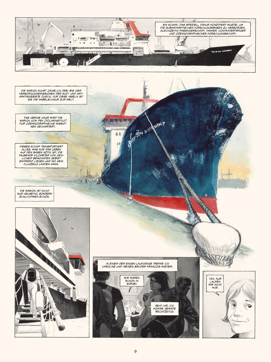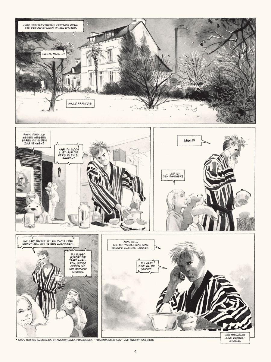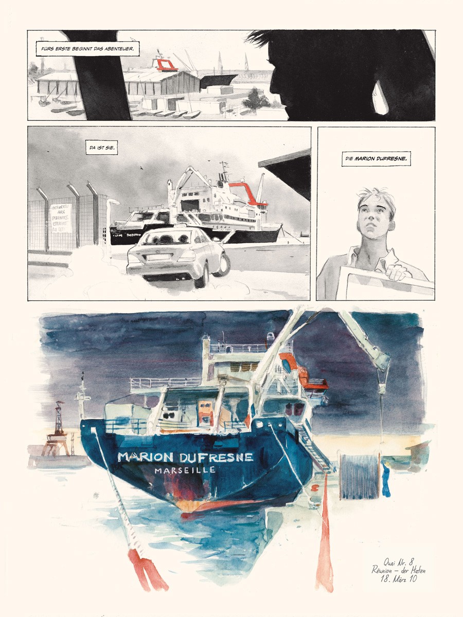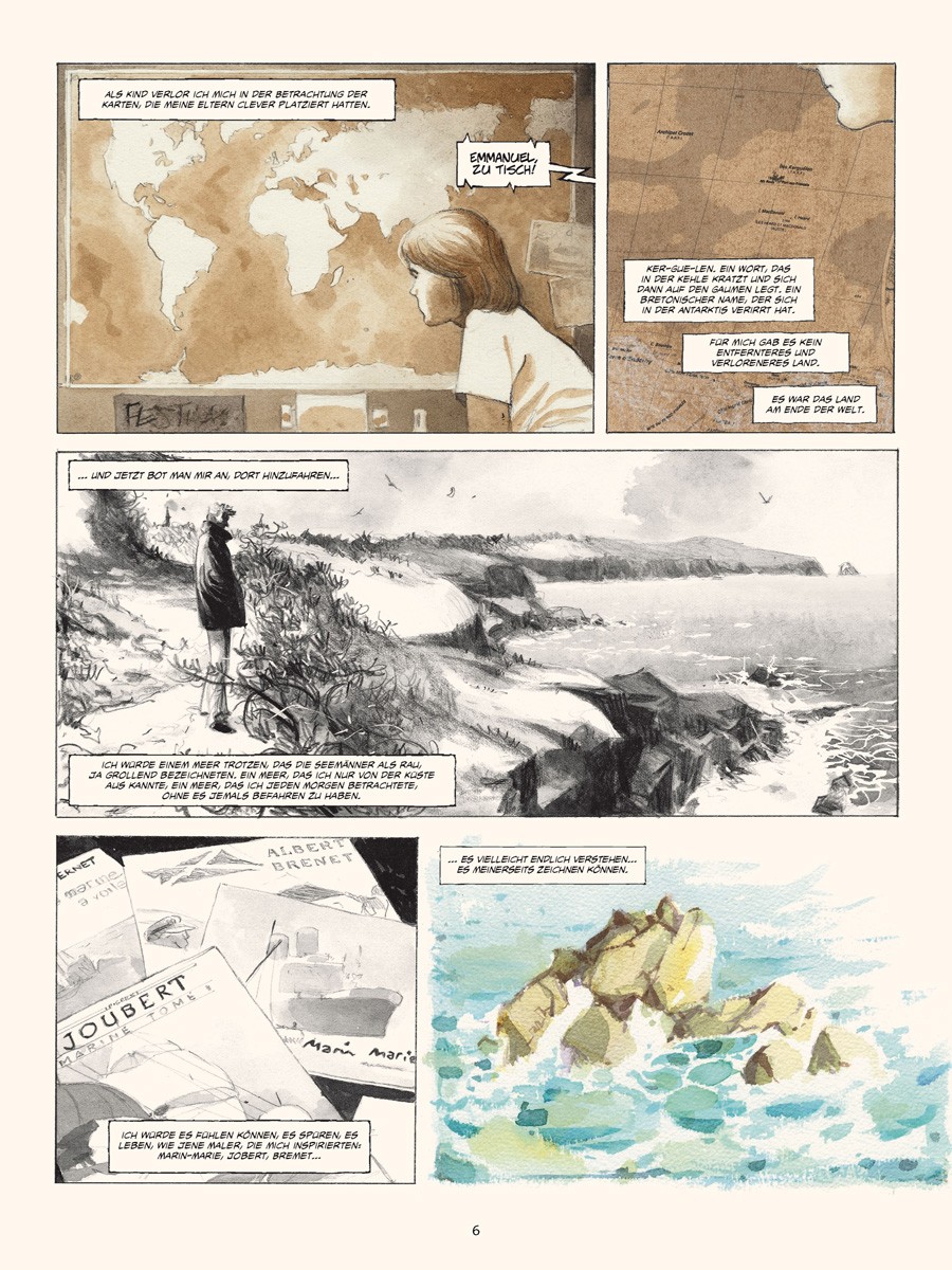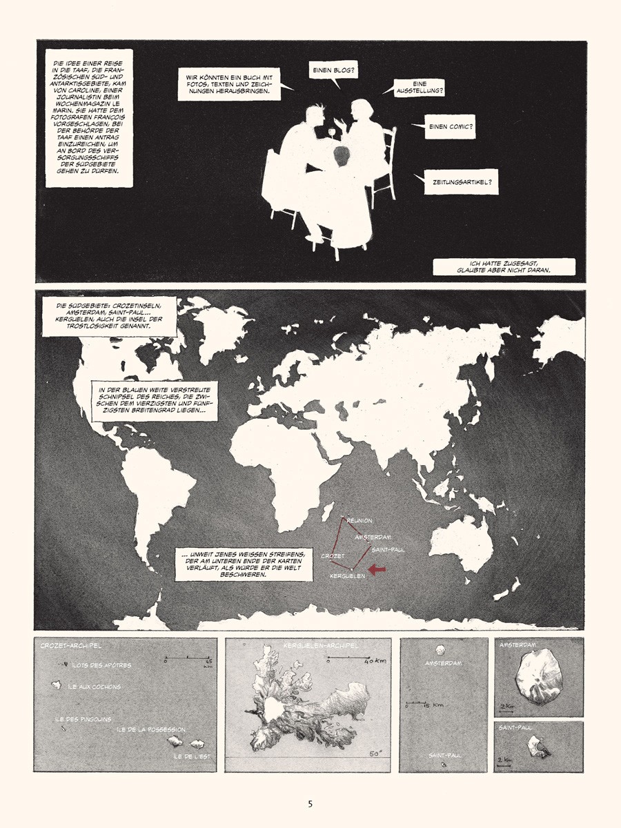 Im März 2010 ging Emmanuel Lepage für mehrere Wochen an Bord des Forschungsschiffes »Marion Dufresne«, um die TAAF, die Französischen Süd- und Antarktisgebiete, zu bereisen, das Meer verstehen und zeichnen zu lernen und um sich von den eisigen Landschaften verzaubern zu lassen, die in der Lage sind, einen in längst vergangene Zeiten zu versetzen.