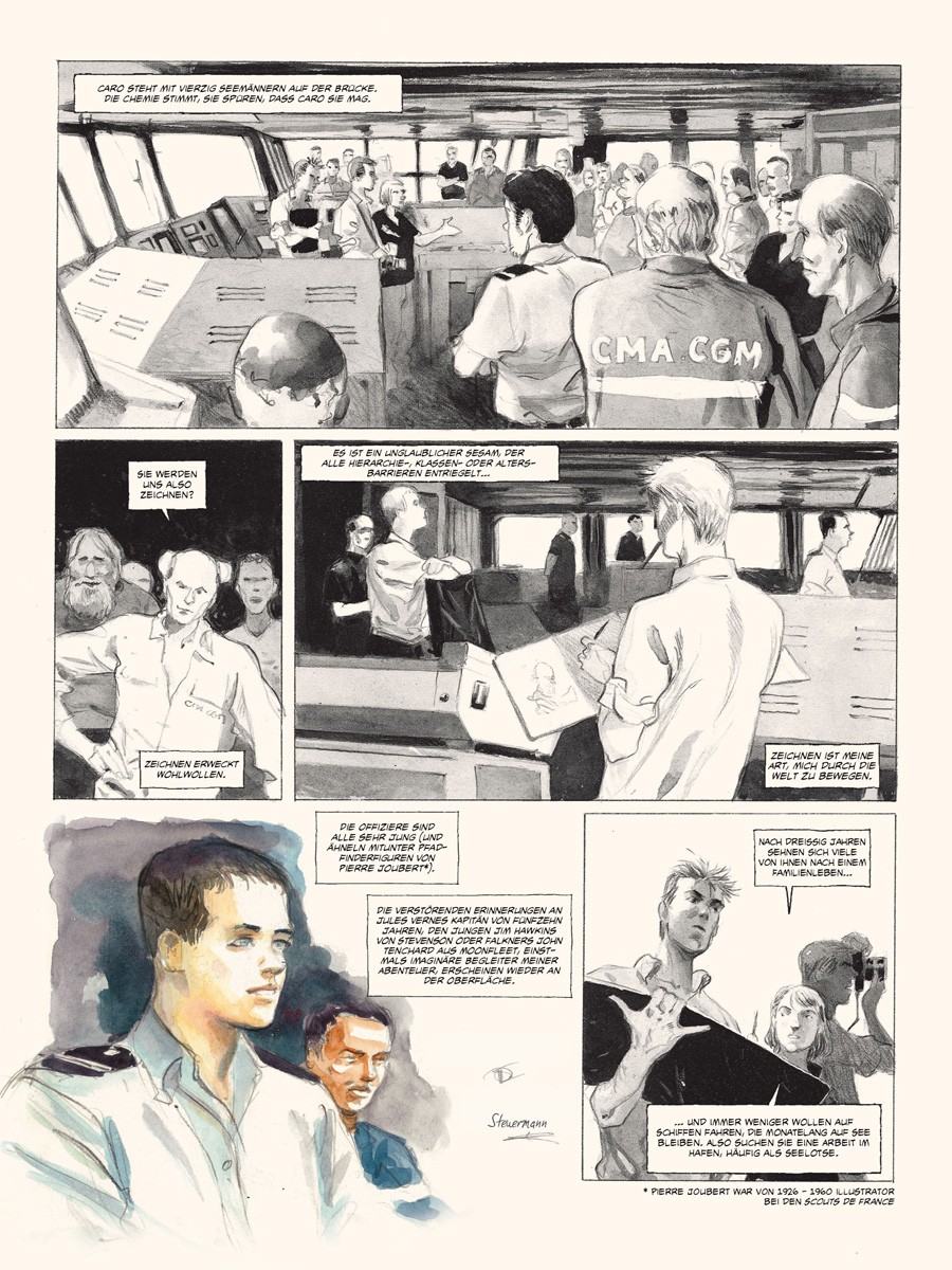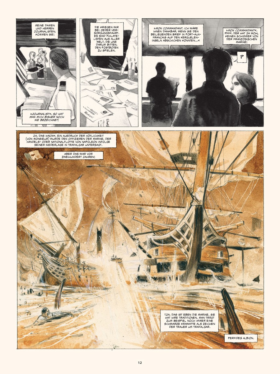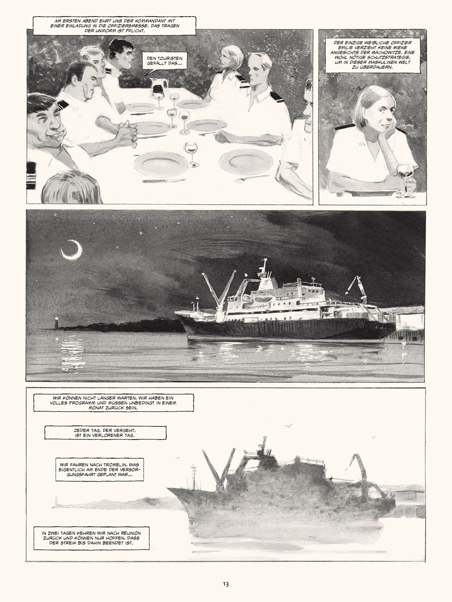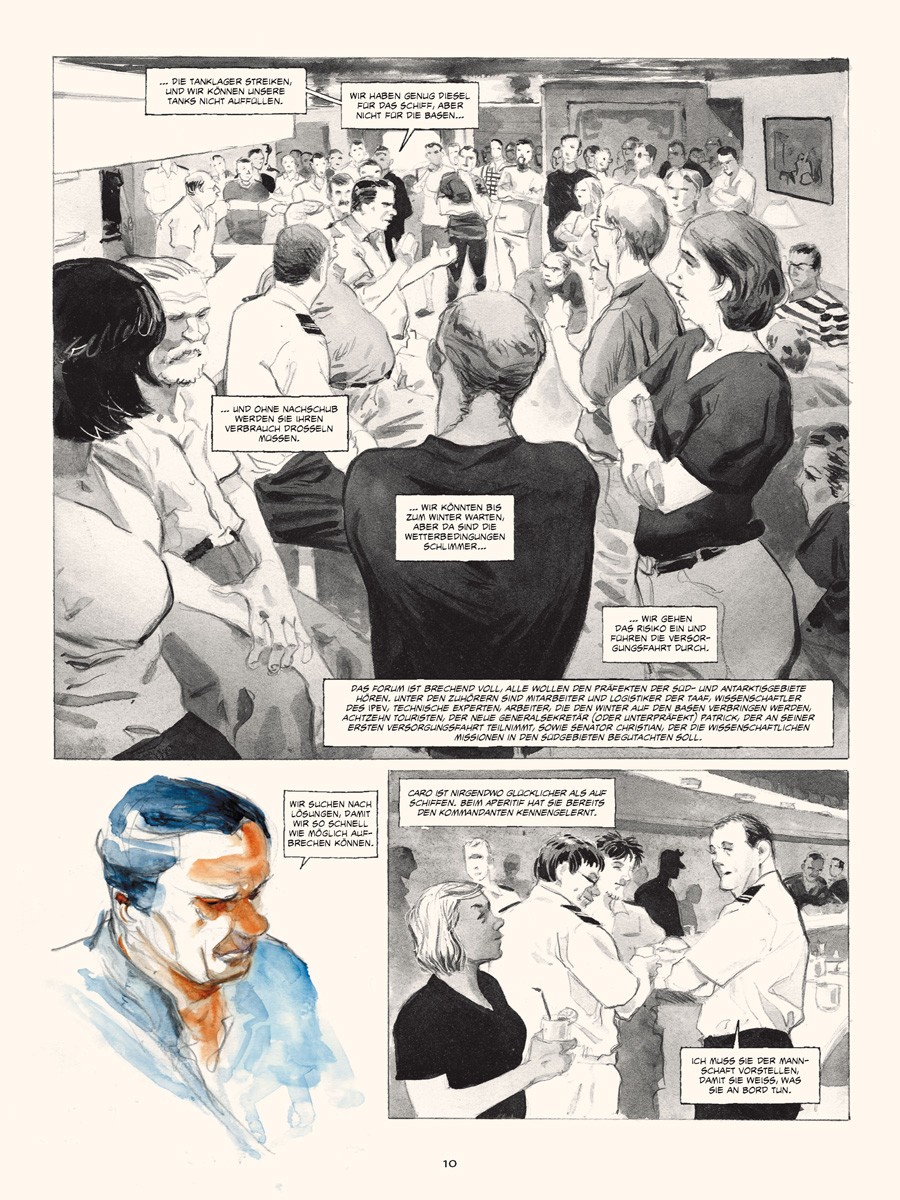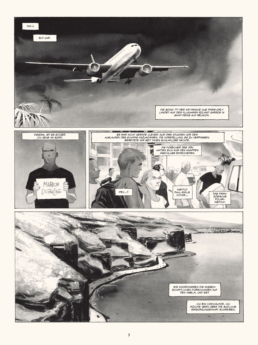 Im März 2010 ging Emmanuel Lepage für mehrere Wochen an Bord des Forschungsschiffes »Marion Dufresne«, um die TAAF, die Französischen Süd- und Antarktisgebiete, zu bereisen, das Meer verstehen und zeichnen zu lernen und um sich von den eisigen Landschaften verzaubern zu lassen, die in der Lage sind, einen in längst vergangene Zeiten zu versetzen.