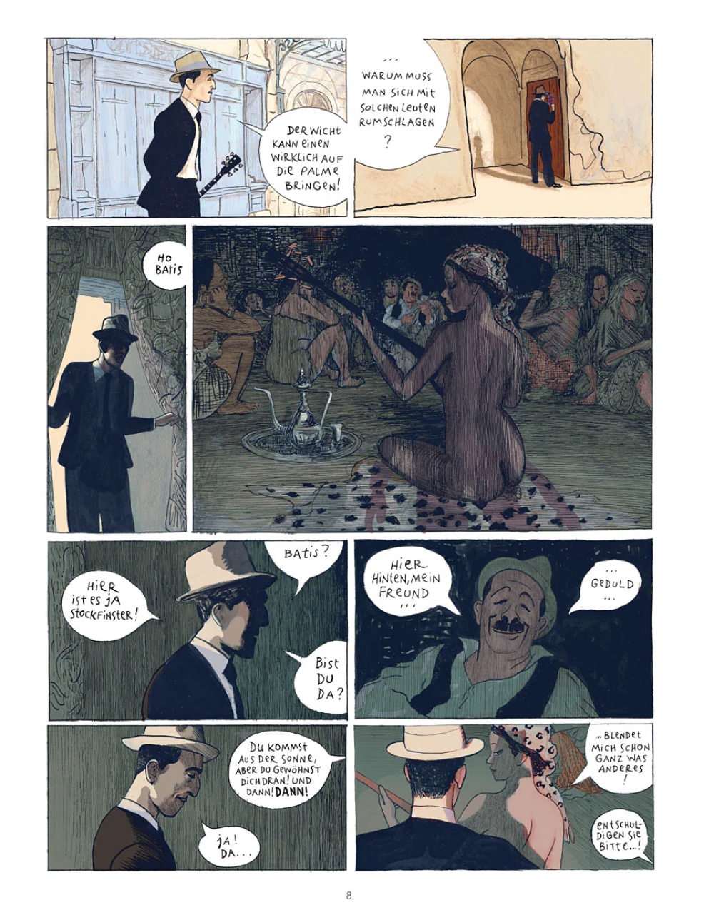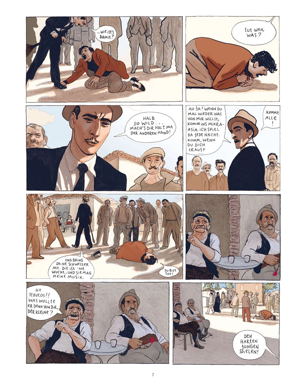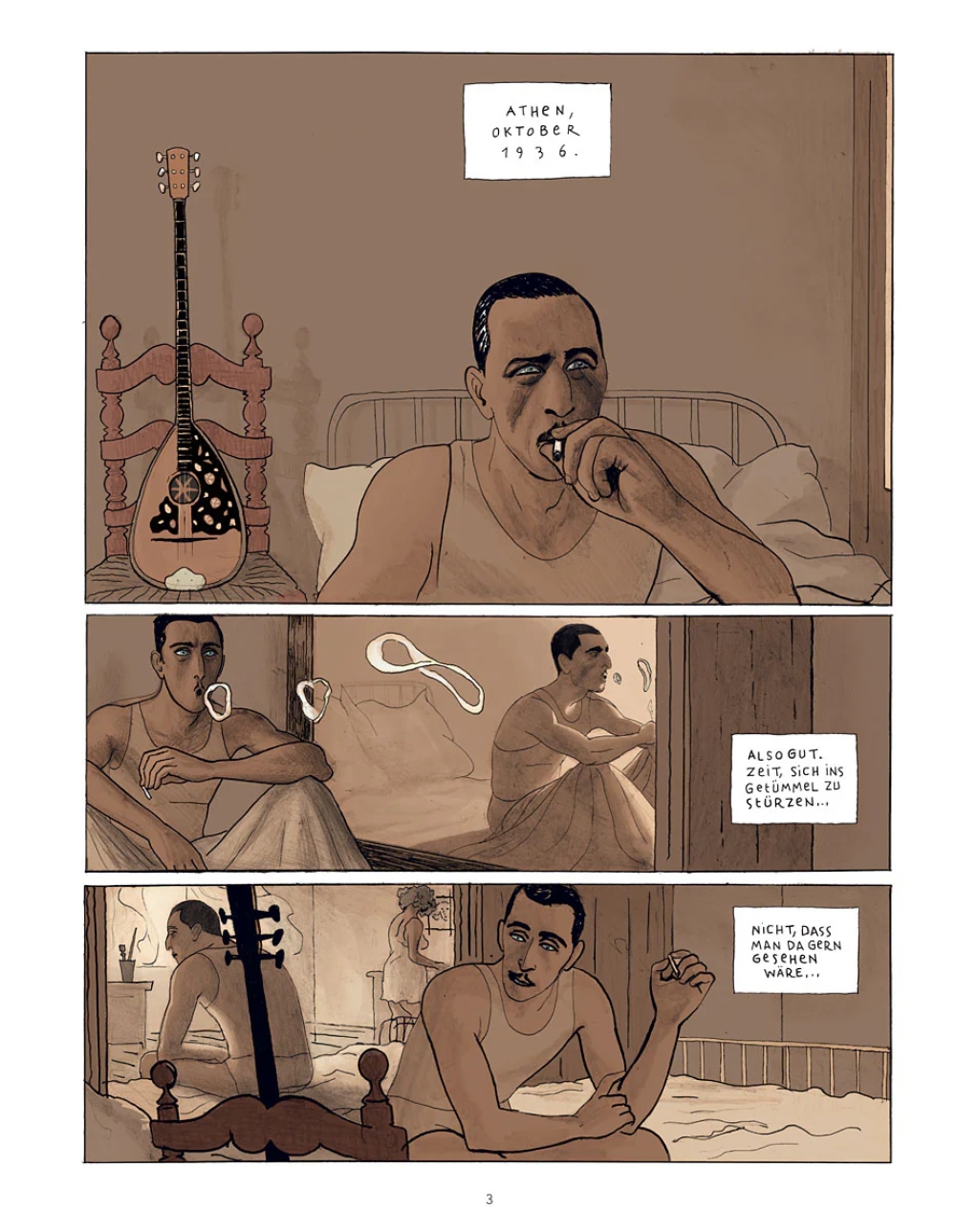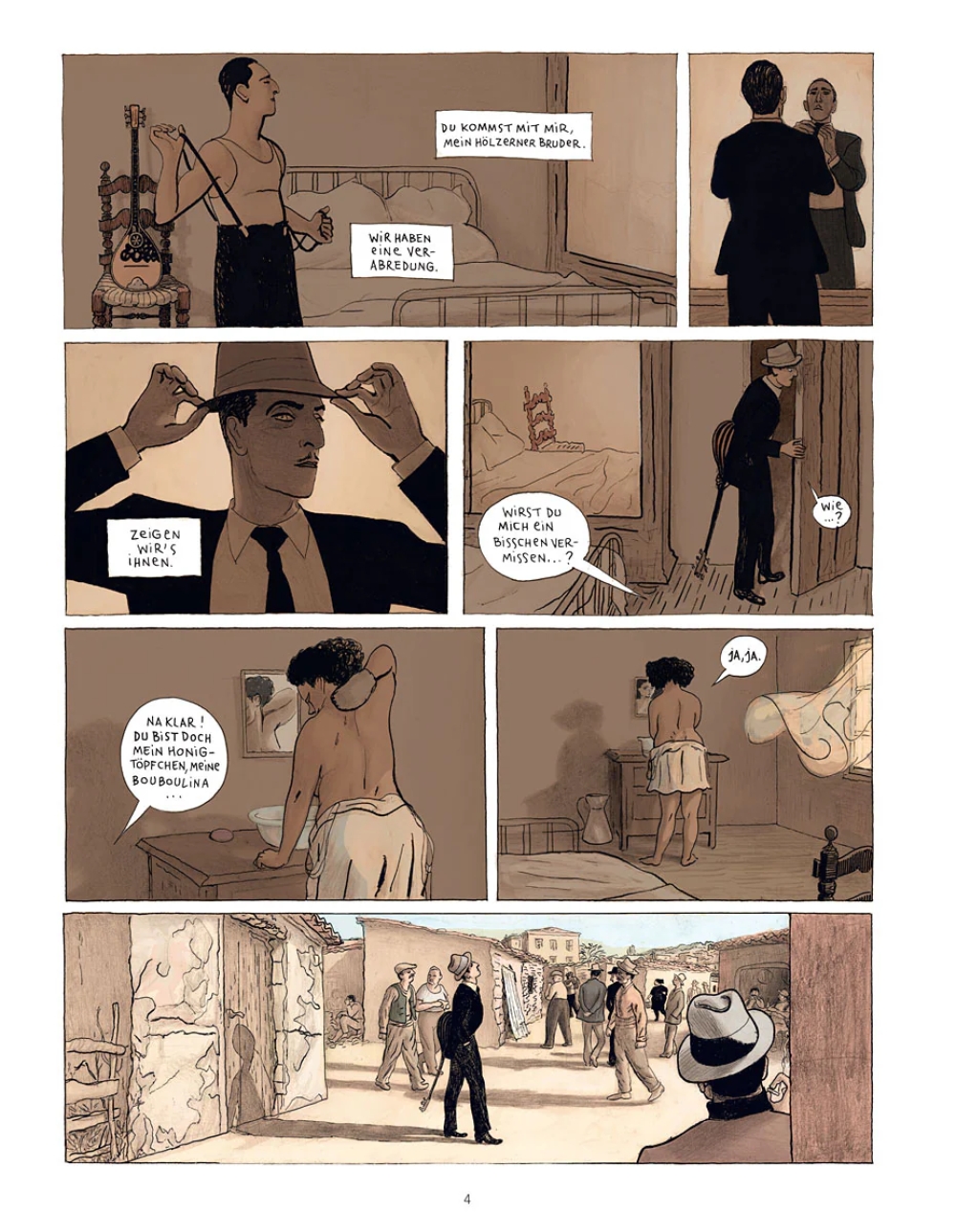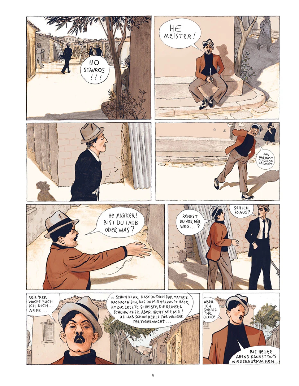 Eindringlich und mit traumwandlerischem Gespür für seine Charaktere schildert David Prudhomme vierundzwanzig Stunden im Leben von fünf Musikern in den Armenvierteln von Piräus. Seine elegante Linienführung und die leuchtende Farbgebung, die das strahlende mediterrane Licht ebenso einfängt wie die Schatten der schummrigen Haschischhöhlen, erzeugen eine Intensität, so hypnotisch und sinnlich wie der Rembetiko selbst.
