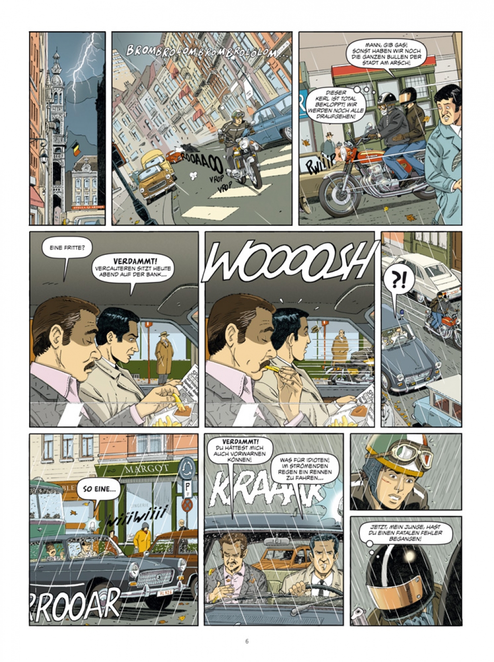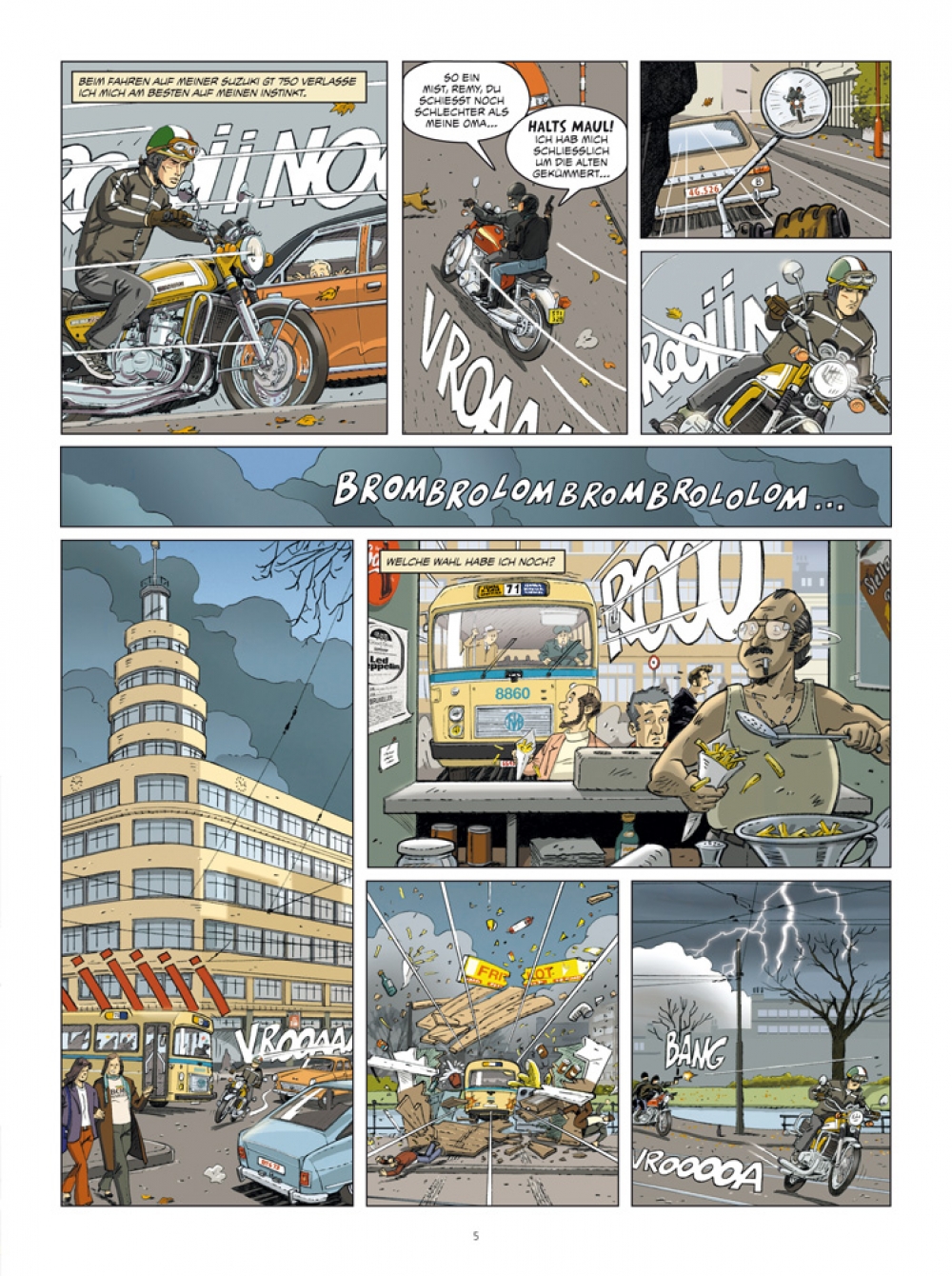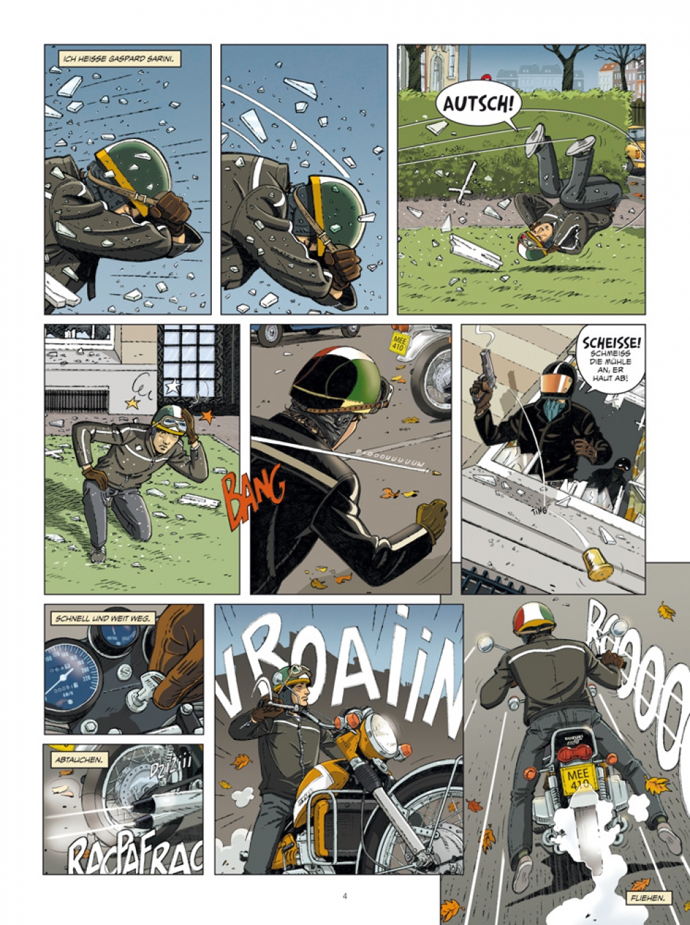 Szenarist Géro erzählt eine spannende Kriminalgeschichte, in der es um den Doppelmord an einem Ehepaar geht. Gaspard Sarini, der Sohn der Ermordeten, flieht vor den Mördern auf seiner Kawasaki durch das Brüssel des Jahres 1974. Baudoin Deville setzt die Geschichte in einem gradlinigen Retro-Stil um und lässt uns ans seiner Begeisterung für Motorräder und Motorradrennen teilhaben.