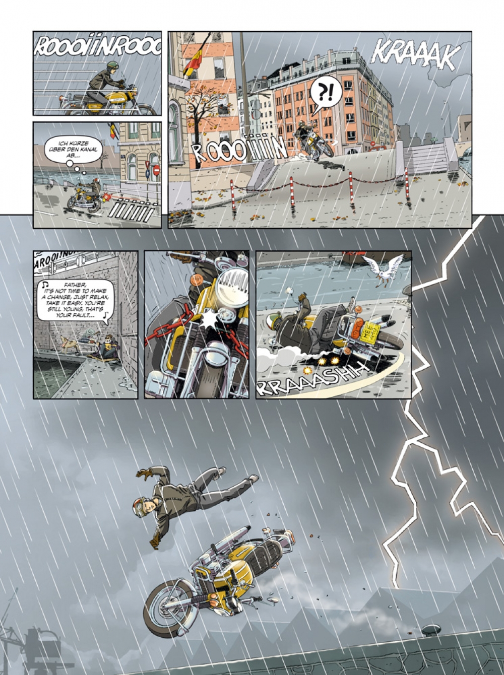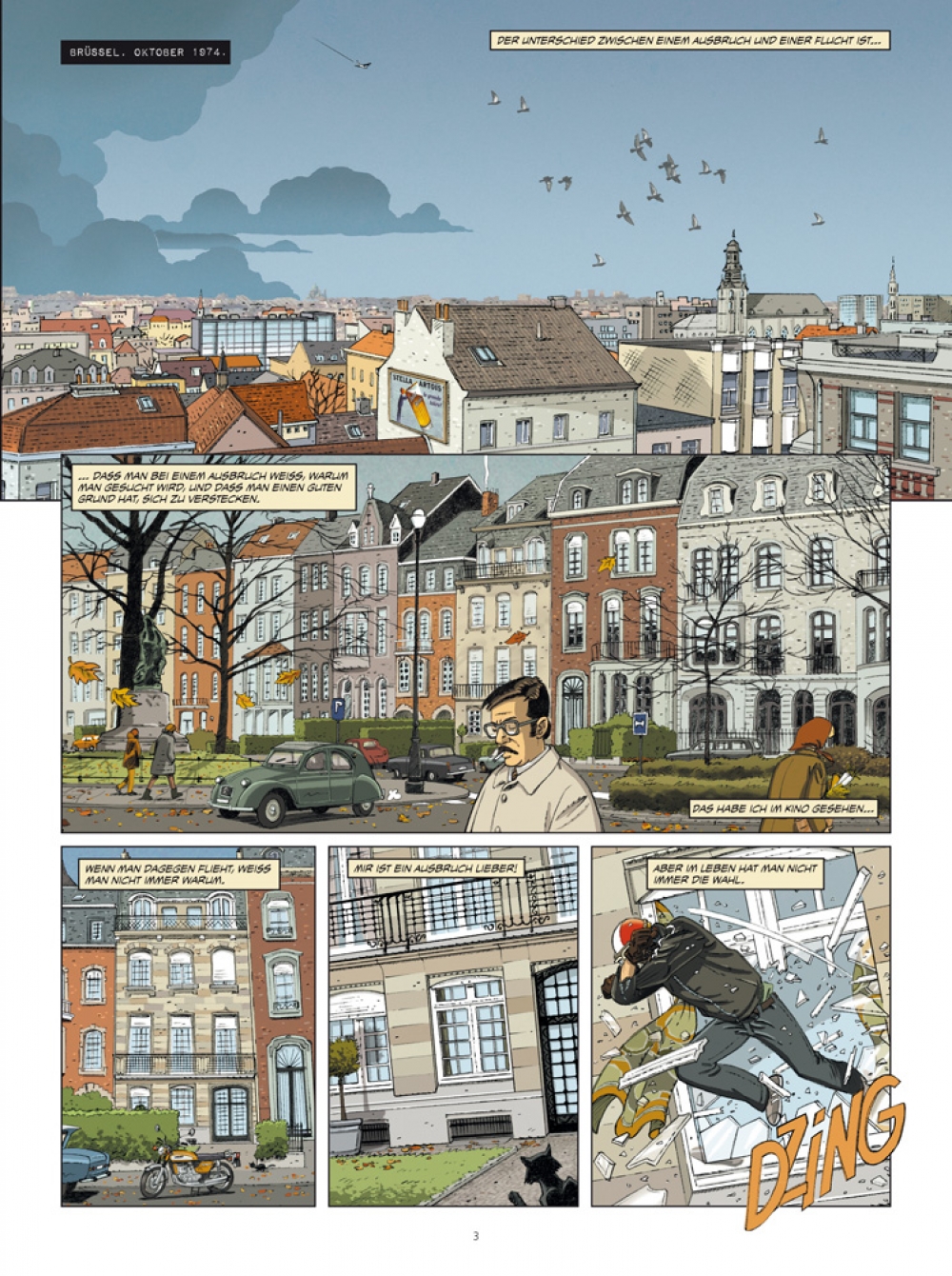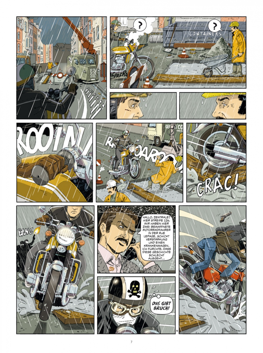 Szenarist Géro erzählt eine spannende Kriminalgeschichte, in der es um den Doppelmord an einem Ehepaar geht. Gaspard Sarini, der Sohn der Ermordeten, flieht vor den Mördern auf seiner Kawasaki durch das Brüssel des Jahres 1974. Baudoin Deville setzt die Geschichte in einem gradlinigen Retro-Stil um und lässt uns ans seiner Begeisterung für Motorräder und Motorradrennen teilhaben.