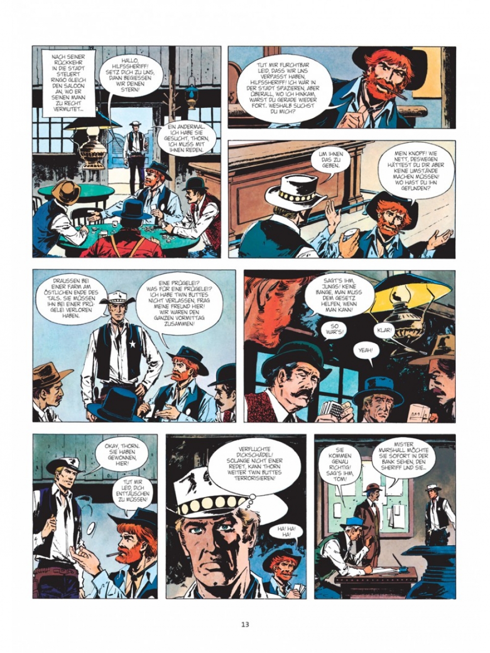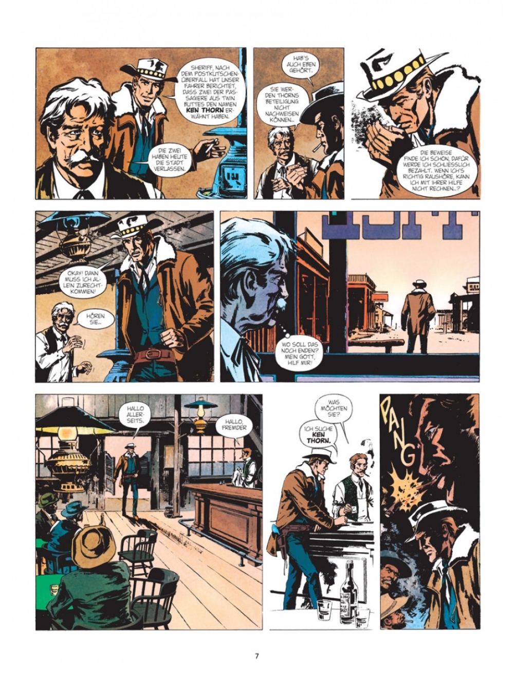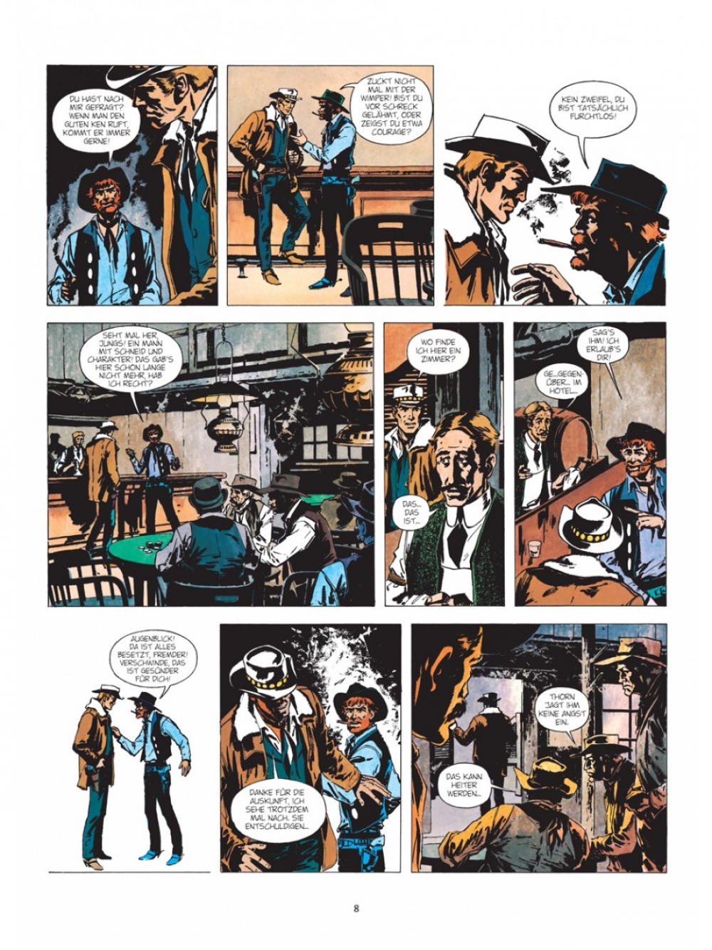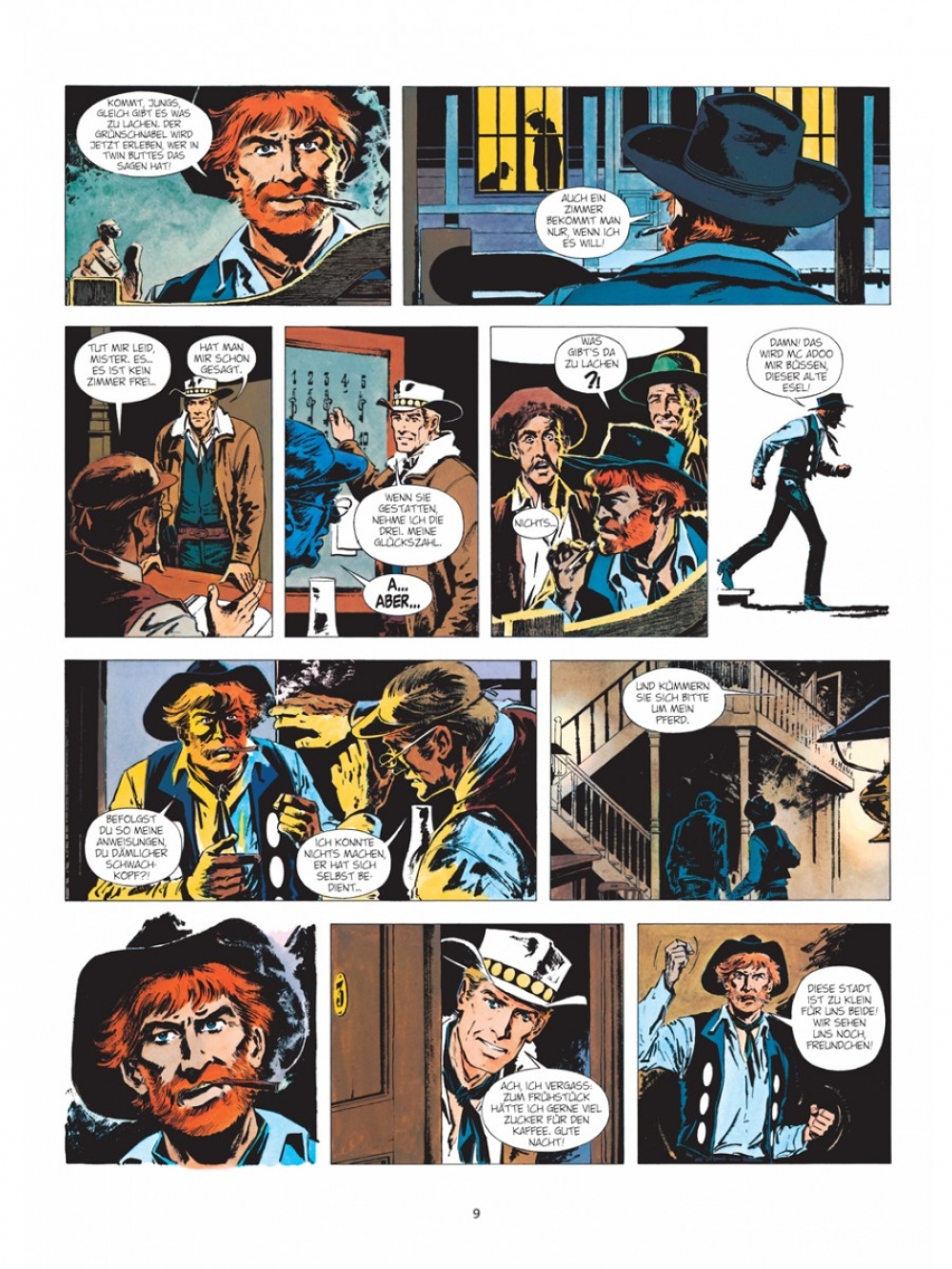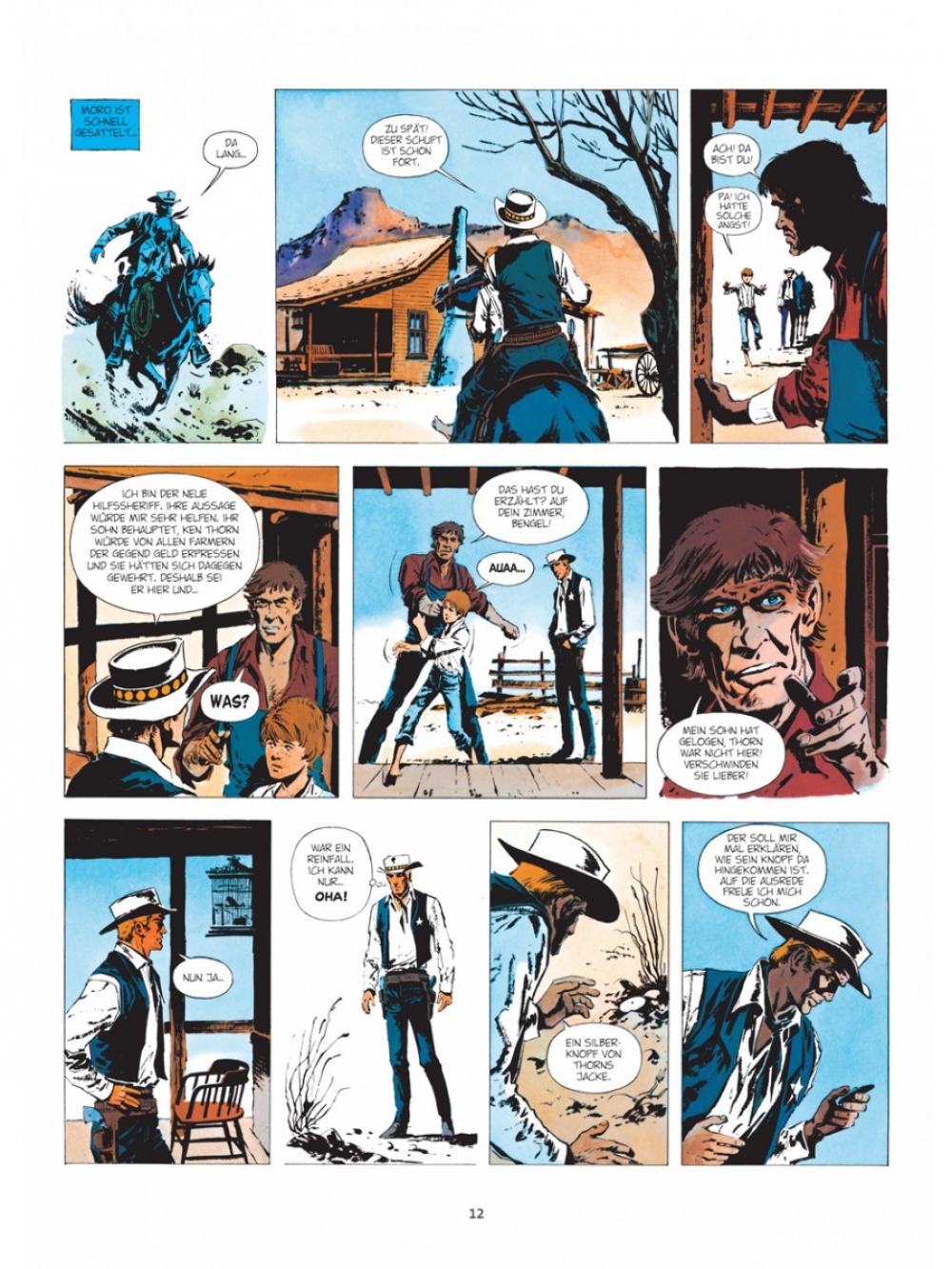 Ganz vorne mit dabei war Ray Ringo. Bereits 1965 betrat der Wells-Fargo-Agent des belgischen Newcomers William Vance erstmals die Bildfläche. Und das selbstsicher und stilbewusst, mit deutlichem Seitenblick auf Sergio Leone: ein vielversprechender Ansatz. Den Vance nach nur zwei Alben leider zunächst nicht weiterverfolgte, da man ihn einerseits bat, den Abenteuerklassiker »Bob Morane« zu übernehmen, und er zugleich mit Greg die Agentenserie »Bruno Brazil« begann. Der Wilde Westen ließ ihn trotzdem nicht los. 1978 stieg Ringo ein drittes Mal in den Sattel (hier nun erstmals auf Deutsch in Albumform erhältlich), und darin klang bereits der elegische Spätwestern an, den Vance noch Anfang der 90er – parallel zu seinem größten Erfolg, dem Thriller »XIII« – mit den ersten beiden Bänden der »Marshal Blueberry«-Trilogie vorlegte.