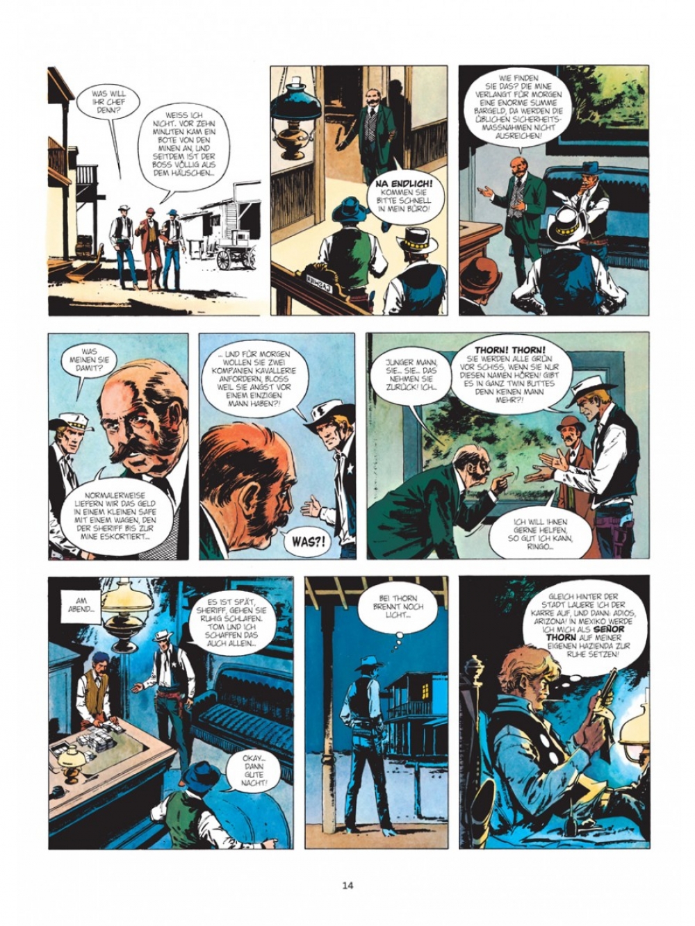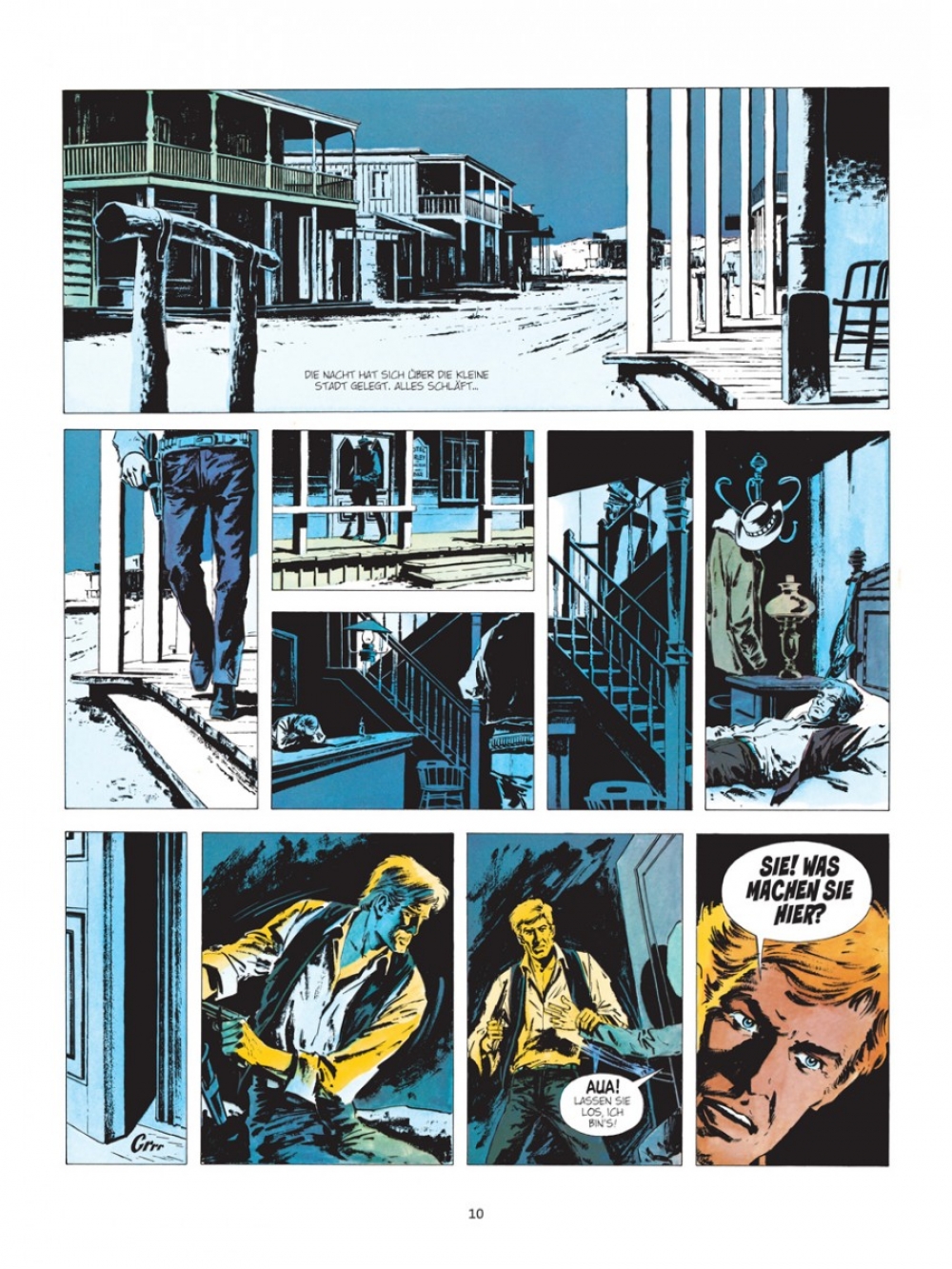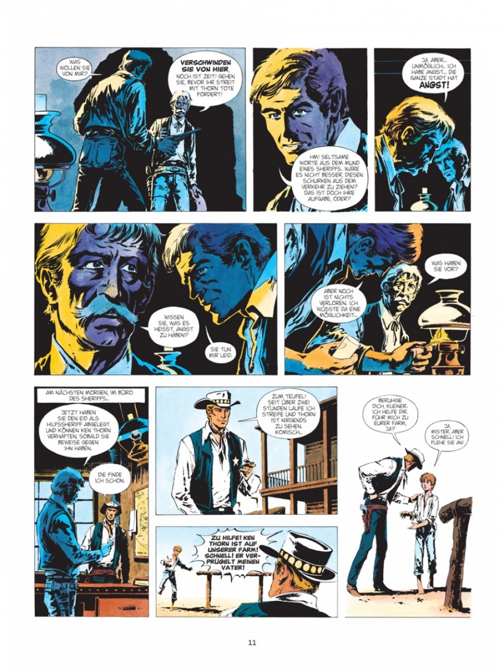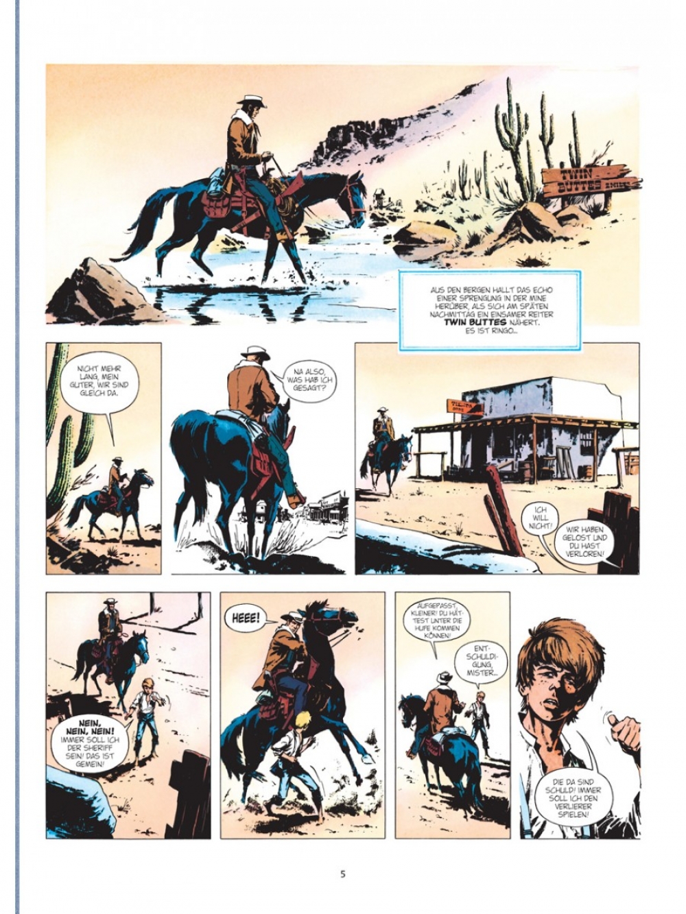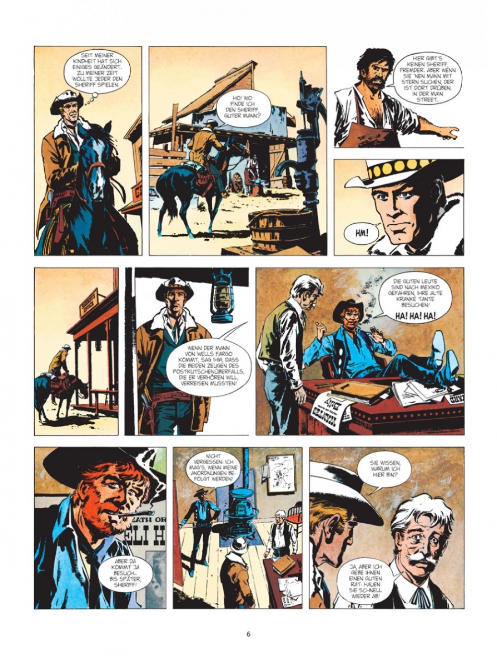 Ganz vorne mit dabei war Ray Ringo. Bereits 1965 betrat der Wells-Fargo-Agent des belgischen Newcomers William Vance erstmals die Bildfläche. Und das selbstsicher und stilbewusst, mit deutlichem Seitenblick auf Sergio Leone: ein vielversprechender Ansatz. Den Vance nach nur zwei Alben leider zunächst nicht weiterverfolgte, da man ihn einerseits bat, den Abenteuerklassiker »Bob Morane« zu übernehmen, und er zugleich mit Greg die Agentenserie »Bruno Brazil« begann. Der Wilde Westen ließ ihn trotzdem nicht los. 1978 stieg Ringo ein drittes Mal in den Sattel (hier nun erstmals auf Deutsch in Albumform erhältlich), und darin klang bereits der elegische Spätwestern an, den Vance noch Anfang der 90er – parallel zu seinem größten Erfolg, dem Thriller »XIII« – mit den ersten beiden Bänden der »Marshal Blueberry«-Trilogie vorlegte.