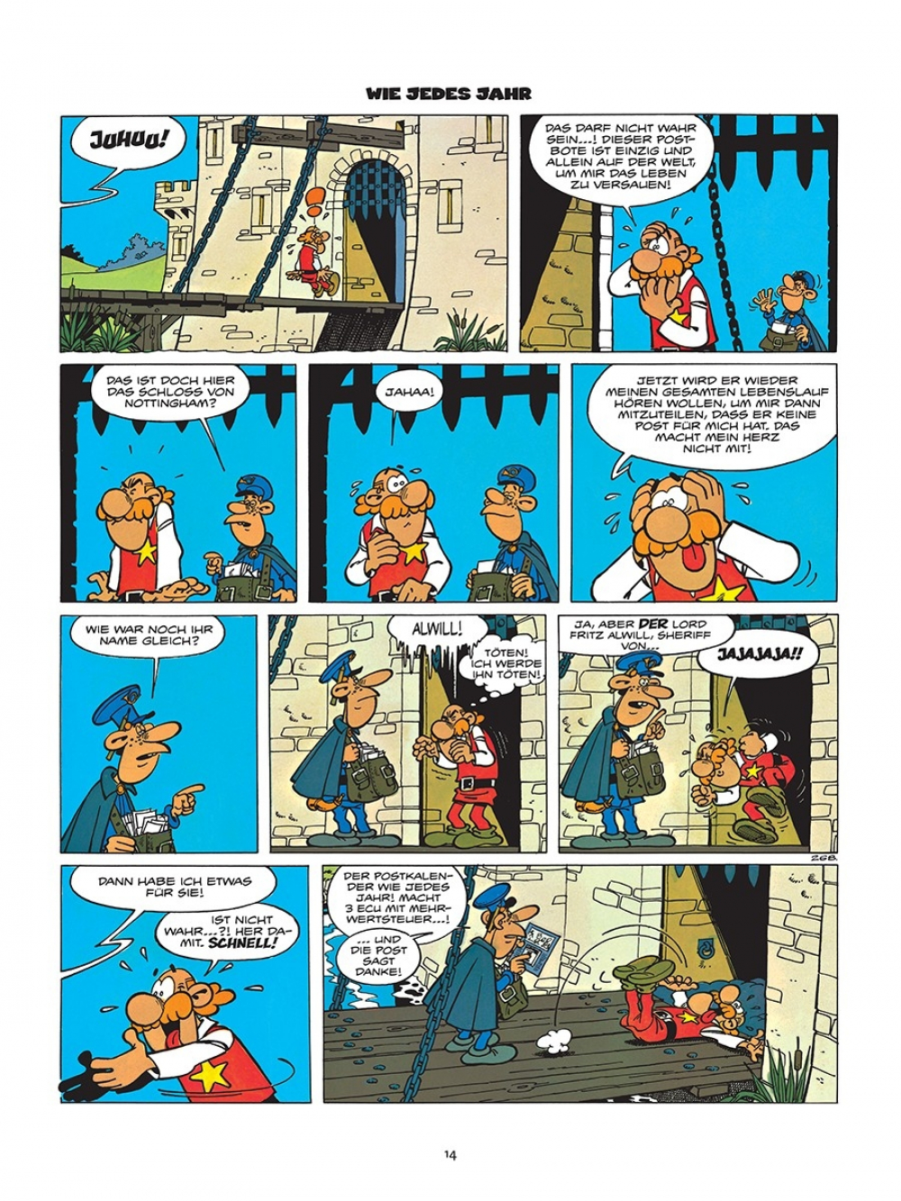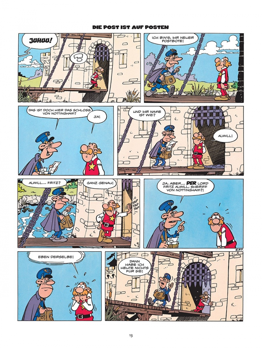 Dem belgischen Dreamteam Turk und Bob de Groot verdanken wir zwar einige Episoden des berühmtesten pensionierten Geheimagenten des MI 5, Percy Pickwick, ihr besonderes Augenmerk aber galt einer weiteren Funny-Figur, deren Abenteuer nicht im hektischen Trubel Londons, sondern im tiefen Dickicht des Sherwood Forest in Nottingham angesiedelt sind: Robin Ausdemwald! Seit seinem ersten Auftritt im Jahre 1969 im legendären Tintin-Magazin fertigten Turk und de Groot über 1000 Onepager und Dutzende Kurz- und albenlange Geschichten der Robin Hood Parodie an. Vieles davon erschien hierzulande im Yps, in den 80er und 90er Jahren folgten 9 Albenveröffentlichungen im Carlsen Verlag.