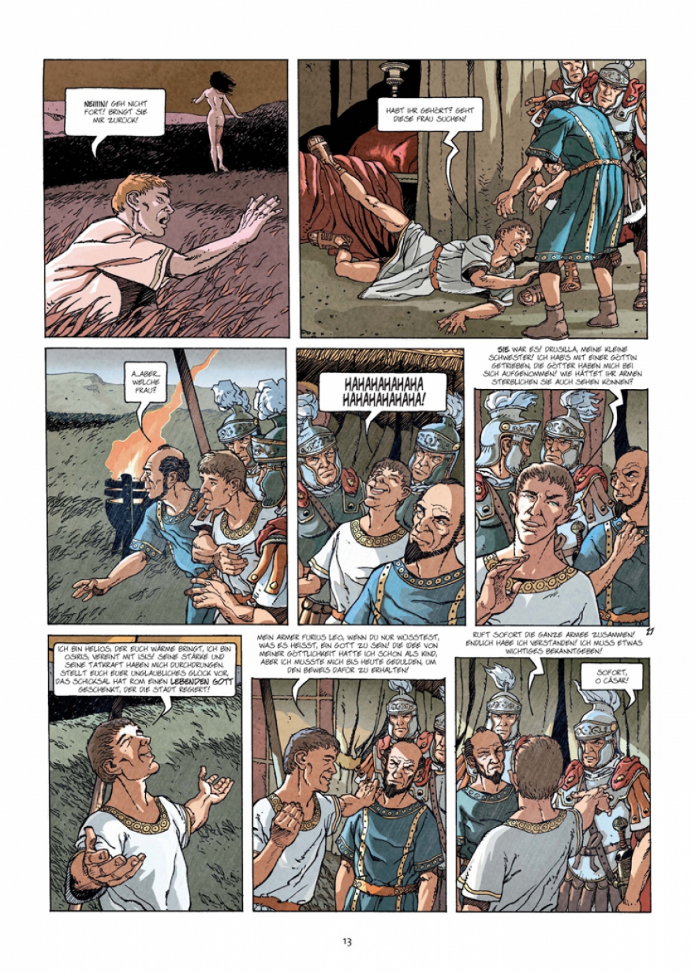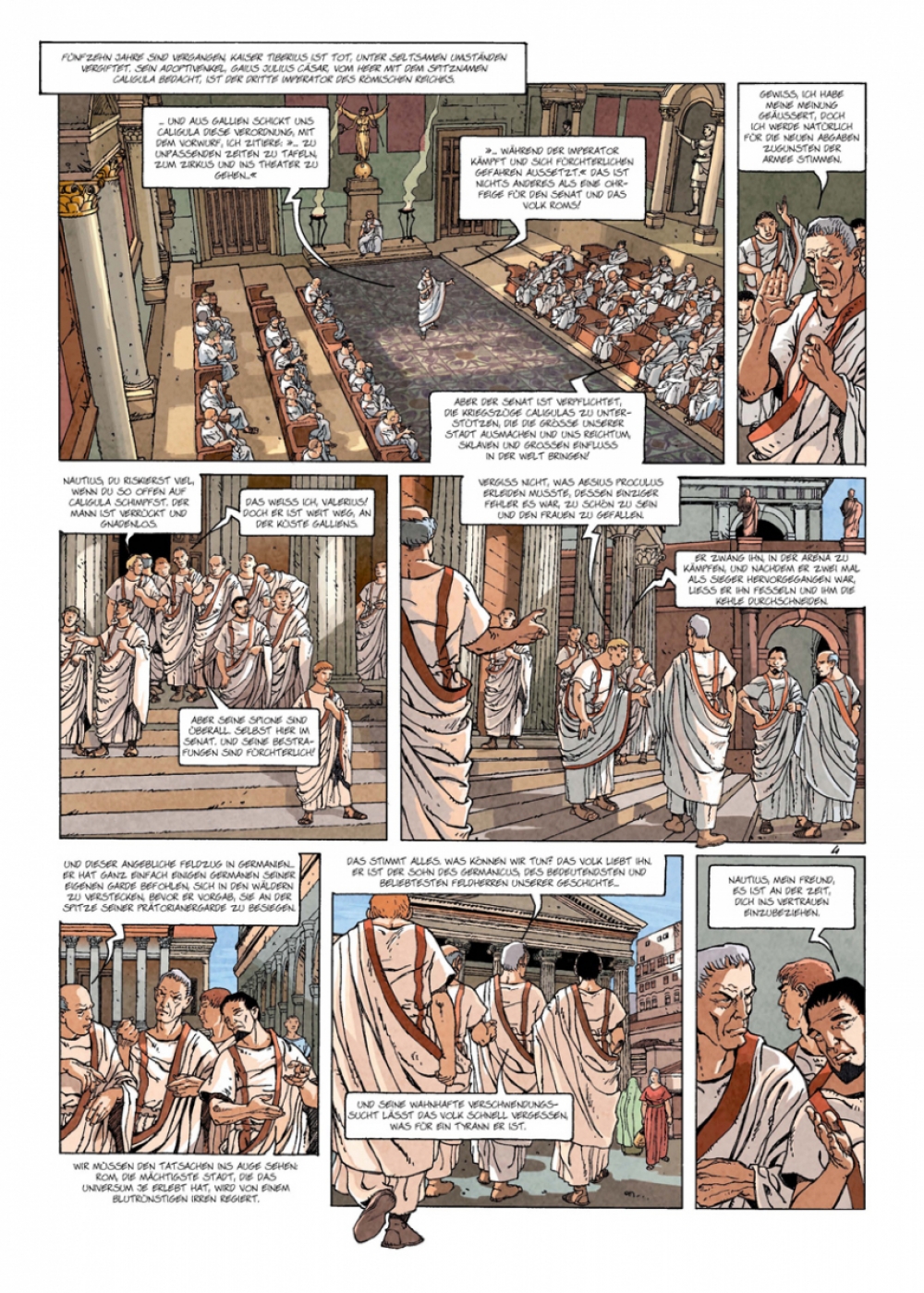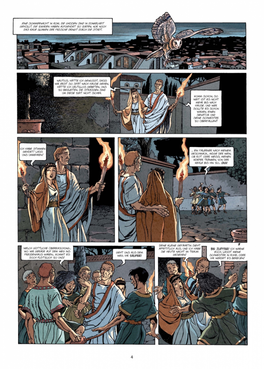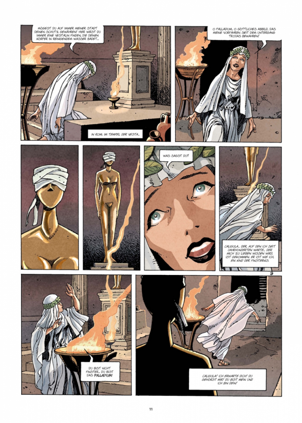 Rom, die »ewige Stadt« – doch auch die wurde natürlich irgendwann einmal gegründet. Die bekannteste Legende dazu ist sicher die der Zwillinge Romulus und Remus, aufgezogen von einer Wölfin. Aber es gibt noch eine weitere, kaum weniger spektakuläre Sage, nach der Rom eine Gründung trojanischer Flüchtlinge um Aeneas gewesen sein soll. Der brachte bei dieser Gelegenheit angeblich das Palladium mit, eine mysteriöse Skulptur und je nach Standpunkt Segen oder Fluch für die Stadt, die sie beherbergt. Für die Familien Leo und Aquila, Nachkommen trojanischer Kriegshelden, ist das keine Frage, denn sie sind die ausersehenen Hüter der Statue und auf Gedeih und Verderb, für immer und ewig mit ihr verbunden – vom Anbeginn Roms durch die Jahrhunderte und Jahrtausende bis in die Zukunft. So weit erstreckt sich nämlich der Zyklus »Roma«, noch von Gilles Chaillet (»Vasco«, »Vinci«) konzipiert, der aber leider 2011 verstarb, bevor er dieses Projekt umsetzen konnte. Darum wird nun in insgesamt 13 Bänden ein ganzes Autorenteam um Didier Convard & Co. mit wechselnden Zeichnern den Spuren des göttlichen Fluchs und der beiden Familien nachgehen und so ein faszinierendes Porträt der ewigen Stadt auf den sieben Hügeln entwerfen. Jeder einzelne Band beschäftigt sich mit einem herausragenden Ereignis, einer prägenden Person oder Phase der langen römischen Geschichte und kann für sich allein gelesen werden – ob es sich nun um die Antike mit Gestalten wie Cäsar oder Caligula handelt, das Mittelalter der Päpste, die Faschisten der Neuzeit oder sogar das, was womöglich eines Tages noch kommen mag. Ergänzt wird jede Erzählung zudem um einen ausführlichen historischen Anhang. Aber die großen Zusammenhänge erschließen sich natürlich erst, zieht man den Zyklus als Ganzes in Betracht.