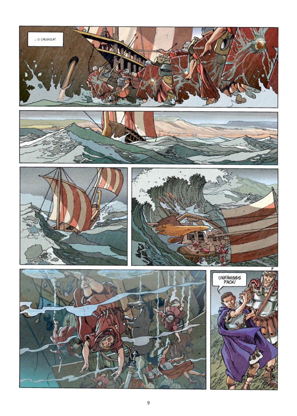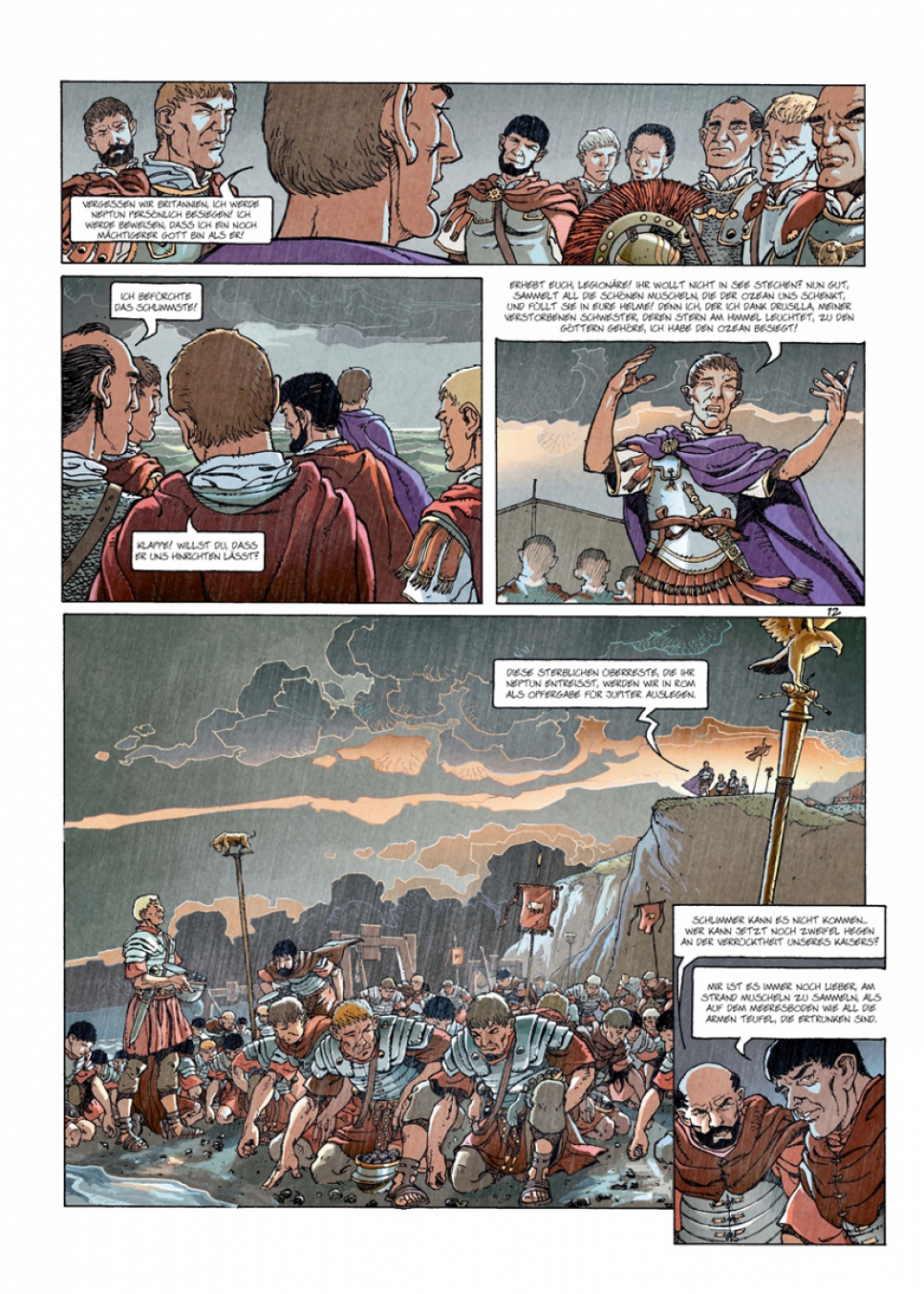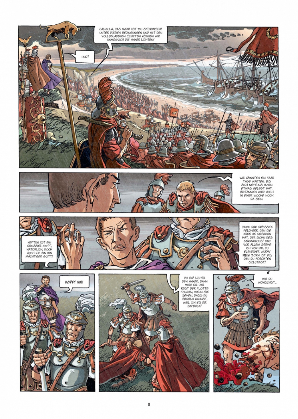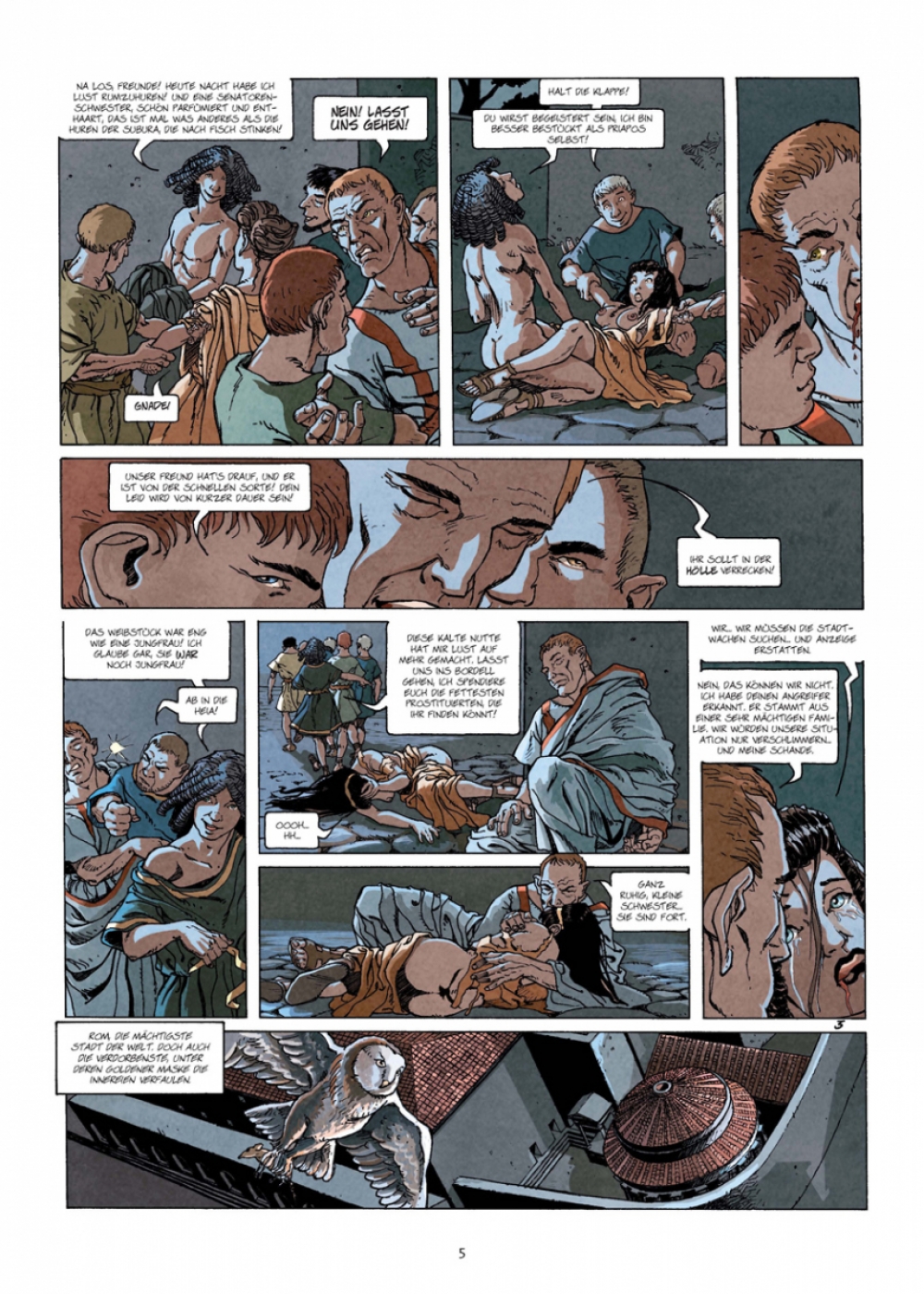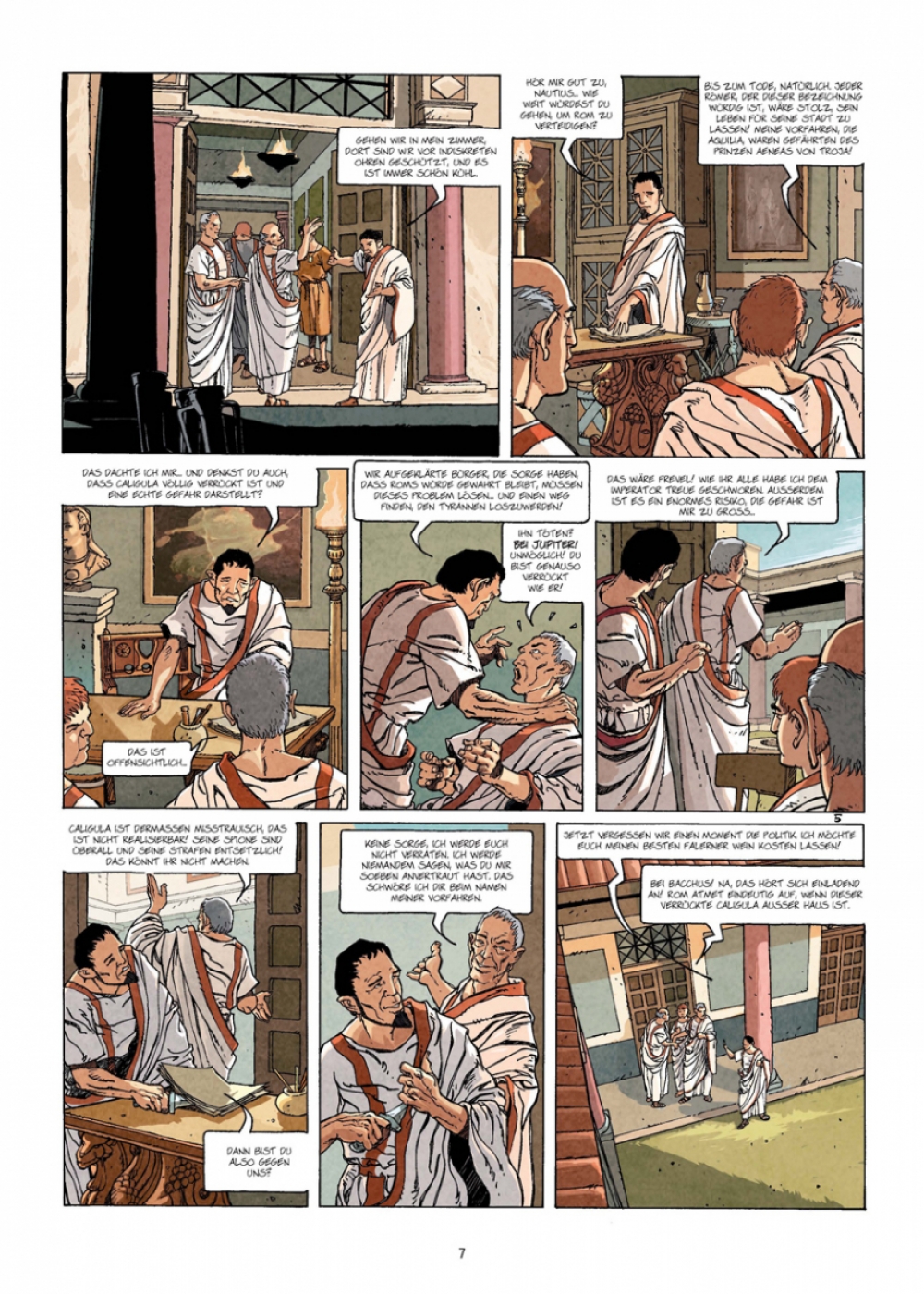 Rom, die »ewige Stadt« – doch auch die wurde natürlich irgendwann einmal gegründet. Die bekannteste Legende dazu ist sicher die der Zwillinge Romulus und Remus, aufgezogen von einer Wölfin. Aber es gibt noch eine weitere, kaum weniger spektakuläre Sage, nach der Rom eine Gründung trojanischer Flüchtlinge um Aeneas gewesen sein soll. Der brachte bei dieser Gelegenheit angeblich das Palladium mit, eine mysteriöse Skulptur und je nach Standpunkt Segen oder Fluch für die Stadt, die sie beherbergt. Für die Familien Leo und Aquila, Nachkommen trojanischer Kriegshelden, ist das keine Frage, denn sie sind die ausersehenen Hüter der Statue und auf Gedeih und Verderb, für immer und ewig mit ihr verbunden – vom Anbeginn Roms durch die Jahrhunderte und Jahrtausende bis in die Zukunft. So weit erstreckt sich nämlich der Zyklus »Roma«, noch von Gilles Chaillet (»Vasco«, »Vinci«) konzipiert, der aber leider 2011 verstarb, bevor er dieses Projekt umsetzen konnte. Darum wird nun in insgesamt 13 Bänden ein ganzes Autorenteam um Didier Convard & Co. mit wechselnden Zeichnern den Spuren des göttlichen Fluchs und der beiden Familien nachgehen und so ein faszinierendes Porträt der ewigen Stadt auf den sieben Hügeln entwerfen. Jeder einzelne Band beschäftigt sich mit einem herausragenden Ereignis, einer prägenden Person oder Phase der langen römischen Geschichte und kann für sich allein gelesen werden – ob es sich nun um die Antike mit Gestalten wie Cäsar oder Caligula handelt, das Mittelalter der Päpste, die Faschisten der Neuzeit oder sogar das, was womöglich eines Tages noch kommen mag. Ergänzt wird jede Erzählung zudem um einen ausführlichen historischen Anhang. Aber die großen Zusammenhänge erschließen sich natürlich erst, zieht man den Zyklus als Ganzes in Betracht.