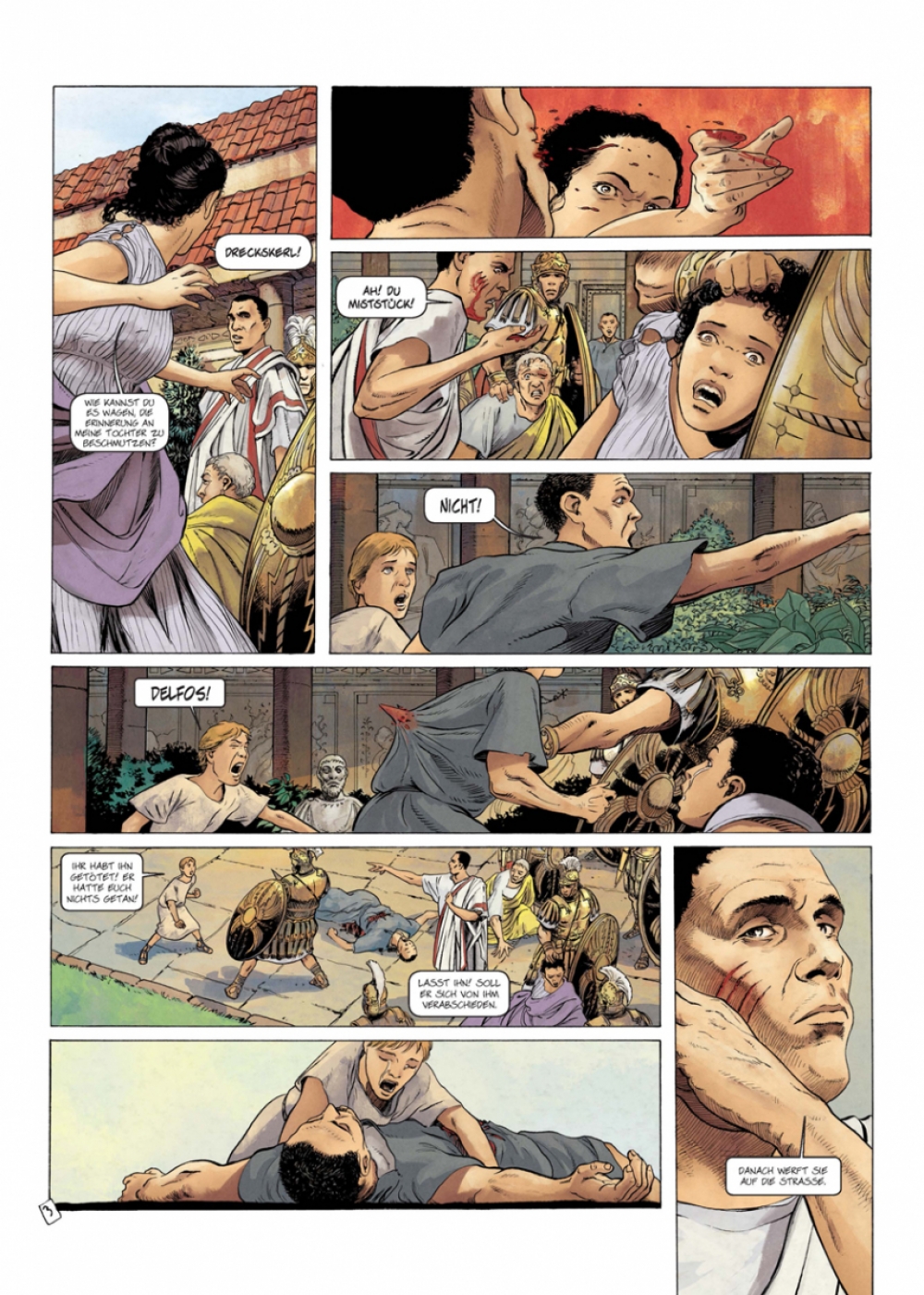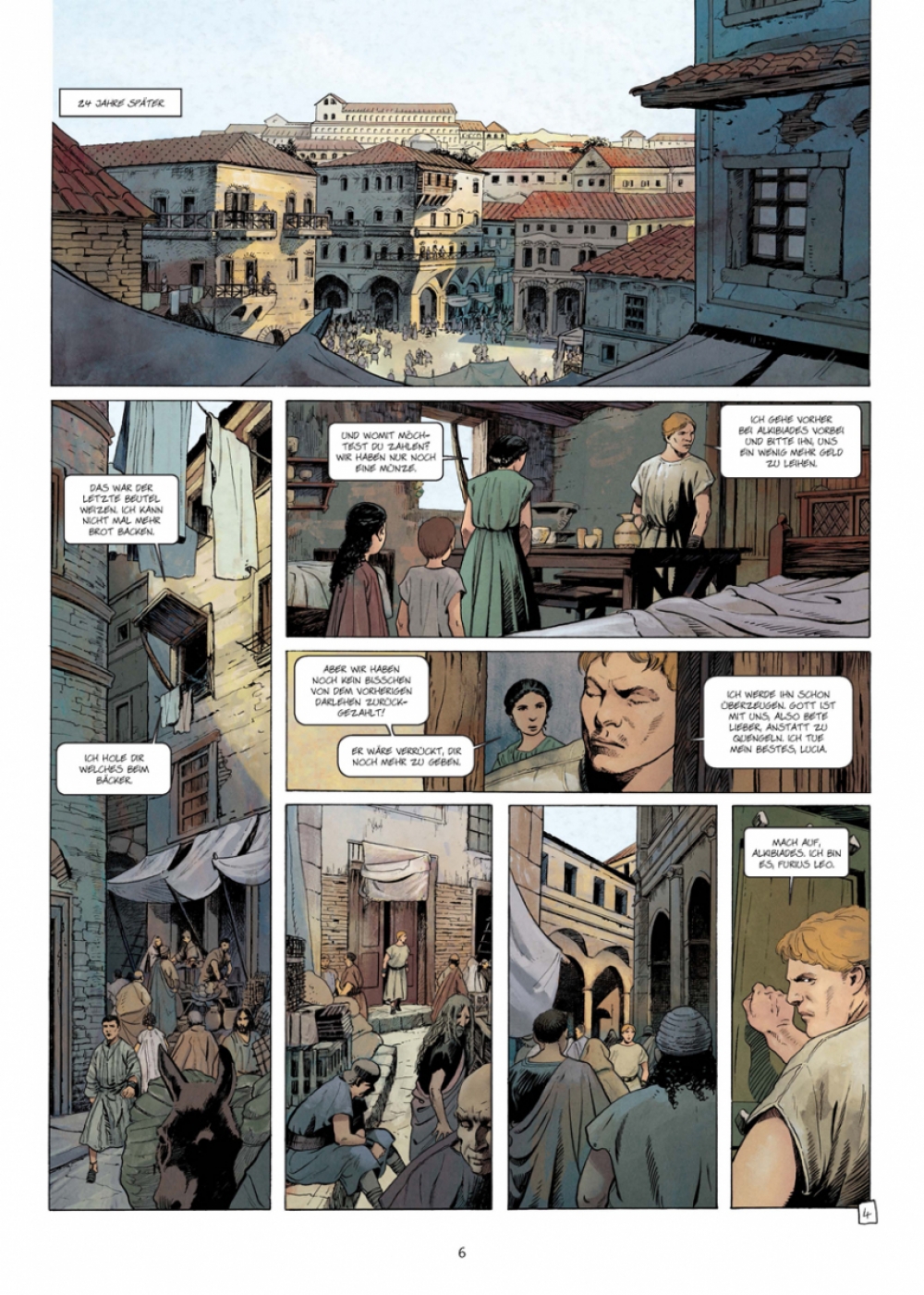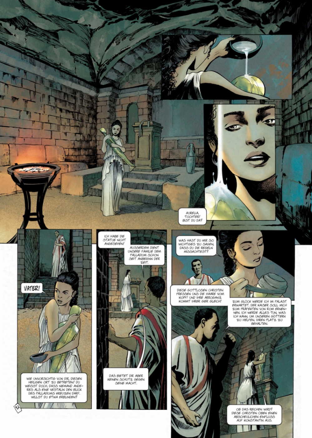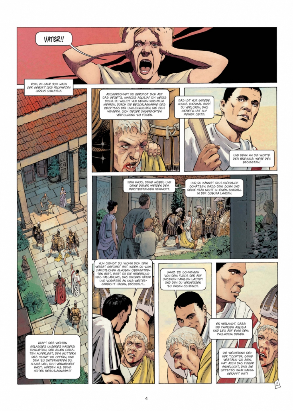 Rom, die »ewige Stadt« – doch auch die wurde natürlich irgendwann einmal gegründet. Die bekannteste Legende dazu ist sicher die der Zwillinge Romulus und Remus, aufgezogen von einer Wölfin. Aber es gibt noch eine weitere, kaum weniger spektakuläre Sage, nach der Rom eine Gründung trojanischer Flüchtlinge um Aeneas gewesen sein soll. Der brachte bei dieser Gelegenheit angeblich das Palladium mit, eine mysteriöse Skulptur und je nach Standpunkt Segen oder Fluch für die Stadt, die sie beherbergt. Für die Familien Leo und Aquila, Nachkommen trojanischer Kriegshelden, ist das keine Frage, denn sie sind die ausersehenen Hüter der Statue und auf Gedeih und Verderb, für immer und ewig mit ihr verbunden – vom Anbeginn Roms durch die Jahrhunderte und Jahrtausende bis in die Zukunft. So weit erstreckt sich nämlich der Zyklus »Roma«, noch von Gilles Chaillet (»Vasco«, »Vinci«) konzipiert, der aber leider 2011 verstarb, bevor er dieses Projekt umsetzen konnte. Darum wird nun in insgesamt 13 Bänden ein ganzes Autorenteam um Didier Convard & Co. mit wechselnden Zeichnern den Spuren des göttlichen Fluchs und der beiden Familien nachgehen und so ein faszinierendes Porträt der ewigen Stadt auf den sieben Hügeln entwerfen. Jeder einzelne Band beschäftigt sich mit einem herausragenden Ereignis, einer prägenden Person oder Phase der langen römischen Geschichte und kann für sich allein gelesen werden – ob es sich nun um die Antike mit Gestalten wie Cäsar oder Caligula handelt, das Mittelalter der Päpste, die Faschisten der Neuzeit oder sogar das, was womöglich eines Tages noch kommen mag. Ergänzt wird jede Erzählung zudem um einen ausführlichen historischen Anhang. Aber die großen Zusammenhänge erschließen sich natürlich erst, zieht man den Zyklus als Ganzes in Betracht.