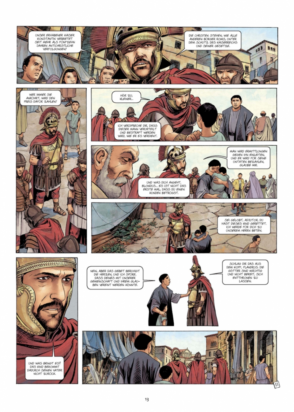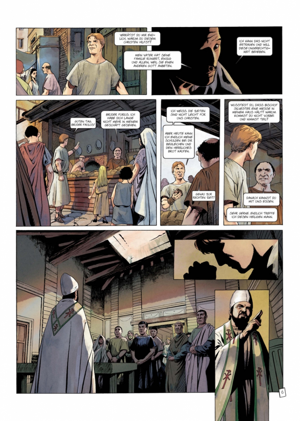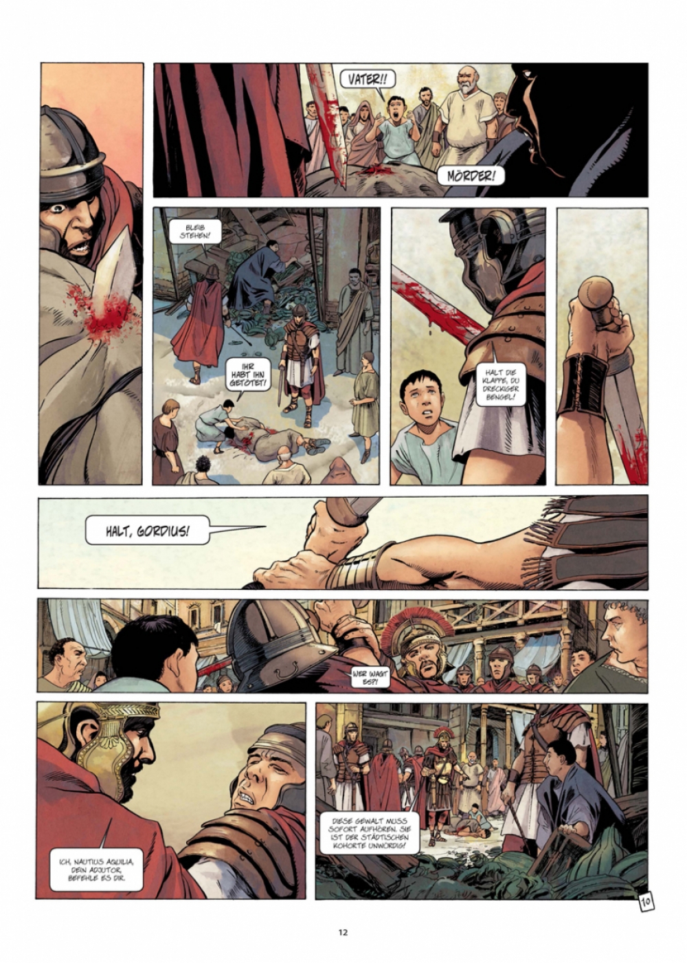 Rom, die »ewige Stadt« – doch auch die wurde natürlich irgendwann einmal gegründet. Die bekannteste Legende dazu ist sicher die der Zwillinge Romulus und Remus, aufgezogen von einer Wölfin. Aber es gibt noch eine weitere, kaum weniger spektakuläre Sage, nach der Rom eine Gründung trojanischer Flüchtlinge um Aeneas gewesen sein soll. Der brachte bei dieser Gelegenheit angeblich das Palladium mit, eine mysteriöse Skulptur und je nach Standpunkt Segen oder Fluch für die Stadt, die sie beherbergt. Für die Familien Leo und Aquila, Nachkommen trojanischer Kriegshelden, ist das keine Frage, denn sie sind die ausersehenen Hüter der Statue und auf Gedeih und Verderb, für immer und ewig mit ihr verbunden – vom Anbeginn Roms durch die Jahrhunderte und Jahrtausende bis in die Zukunft. So weit erstreckt sich nämlich der Zyklus »Roma«, noch von Gilles Chaillet (»Vasco«, »Vinci«) konzipiert, der aber leider 2011 verstarb, bevor er dieses Projekt umsetzen konnte. Darum wird nun in insgesamt 13 Bänden ein ganzes Autorenteam um Didier Convard & Co. mit wechselnden Zeichnern den Spuren des göttlichen Fluchs und der beiden Familien nachgehen und so ein faszinierendes Porträt der ewigen Stadt auf den sieben Hügeln entwerfen. Jeder einzelne Band beschäftigt sich mit einem herausragenden Ereignis, einer prägenden Person oder Phase der langen römischen Geschichte und kann für sich allein gelesen werden – ob es sich nun um die Antike mit Gestalten wie Cäsar oder Caligula handelt, das Mittelalter der Päpste, die Faschisten der Neuzeit oder sogar das, was womöglich eines Tages noch kommen mag. Ergänzt wird jede Erzählung zudem um einen ausführlichen historischen Anhang. Aber die großen Zusammenhänge erschließen sich natürlich erst, zieht man den Zyklus als Ganzes in Betracht.