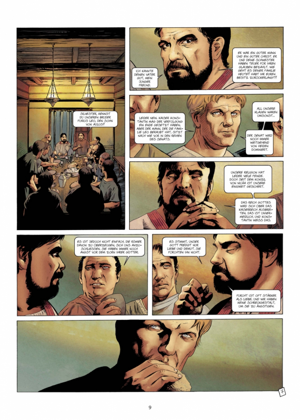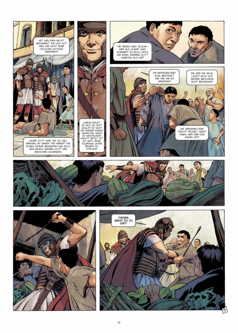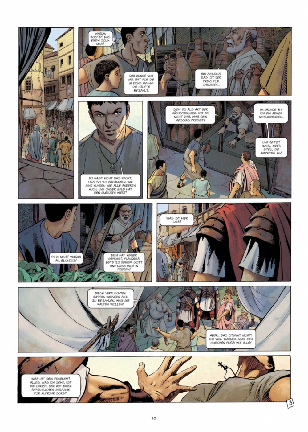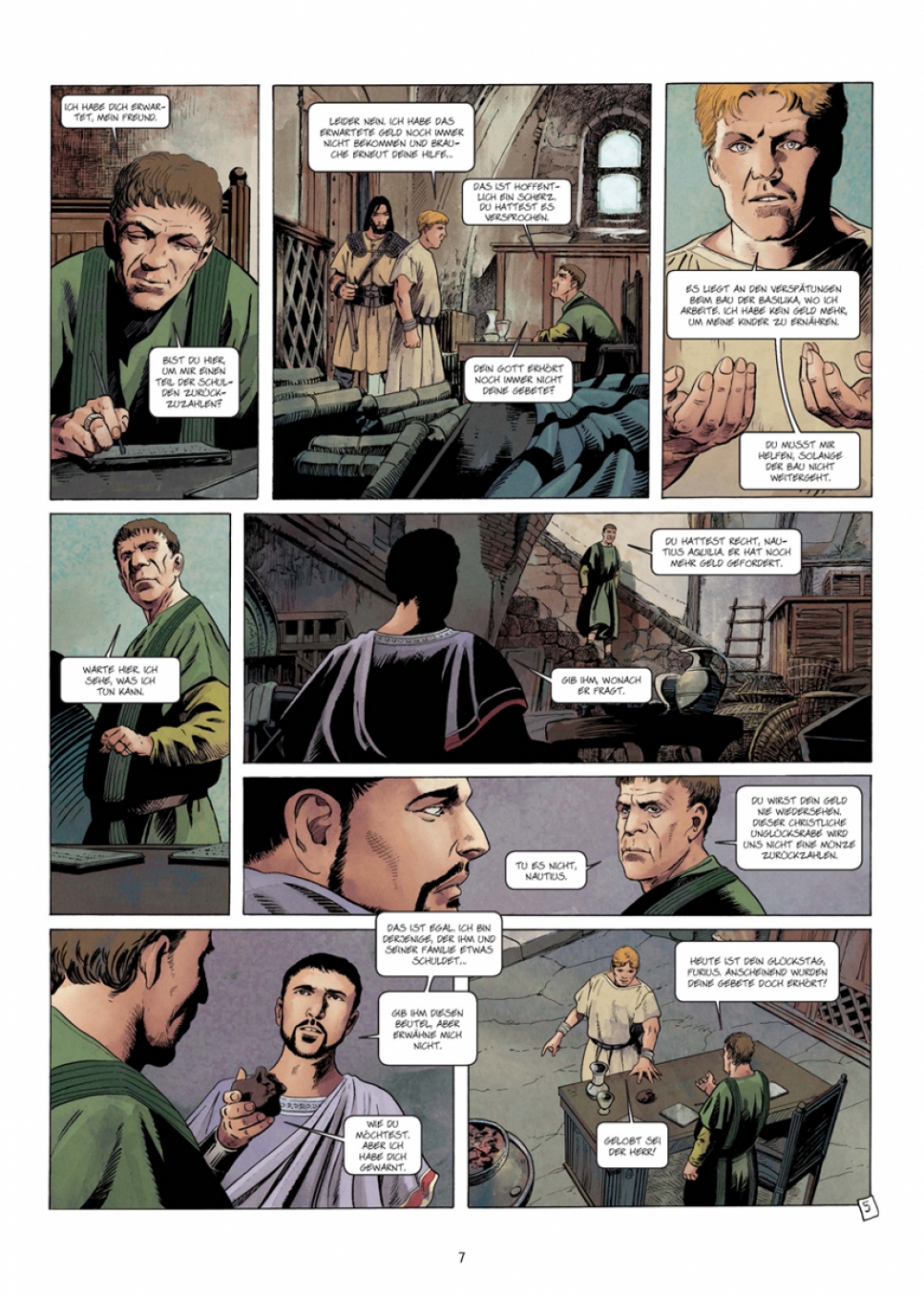 Rom, die »ewige Stadt« – doch auch die wurde natürlich irgendwann einmal gegründet. Die bekannteste Legende dazu ist sicher die der Zwillinge Romulus und Remus, aufgezogen von einer Wölfin. Aber es gibt noch eine weitere, kaum weniger spektakuläre Sage, nach der Rom eine Gründung trojanischer Flüchtlinge um Aeneas gewesen sein soll. Der brachte bei dieser Gelegenheit angeblich das Palladium mit, eine mysteriöse Skulptur und je nach Standpunkt Segen oder Fluch für die Stadt, die sie beherbergt. Für die Familien Leo und Aquila, Nachkommen trojanischer Kriegshelden, ist das keine Frage, denn sie sind die ausersehenen Hüter der Statue und auf Gedeih und Verderb, für immer und ewig mit ihr verbunden – vom Anbeginn Roms durch die Jahrhunderte und Jahrtausende bis in die Zukunft. So weit erstreckt sich nämlich der Zyklus »Roma«, noch von Gilles Chaillet (»Vasco«, »Vinci«) konzipiert, der aber leider 2011 verstarb, bevor er dieses Projekt umsetzen konnte. Darum wird nun in insgesamt 13 Bänden ein ganzes Autorenteam um Didier Convard & Co. mit wechselnden Zeichnern den Spuren des göttlichen Fluchs und der beiden Familien nachgehen und so ein faszinierendes Porträt der ewigen Stadt auf den sieben Hügeln entwerfen. Jeder einzelne Band beschäftigt sich mit einem herausragenden Ereignis, einer prägenden Person oder Phase der langen römischen Geschichte und kann für sich allein gelesen werden – ob es sich nun um die Antike mit Gestalten wie Cäsar oder Caligula handelt, das Mittelalter der Päpste, die Faschisten der Neuzeit oder sogar das, was womöglich eines Tages noch kommen mag. Ergänzt wird jede Erzählung zudem um einen ausführlichen historischen Anhang. Aber die großen Zusammenhänge erschließen sich natürlich erst, zieht man den Zyklus als Ganzes in Betracht.
