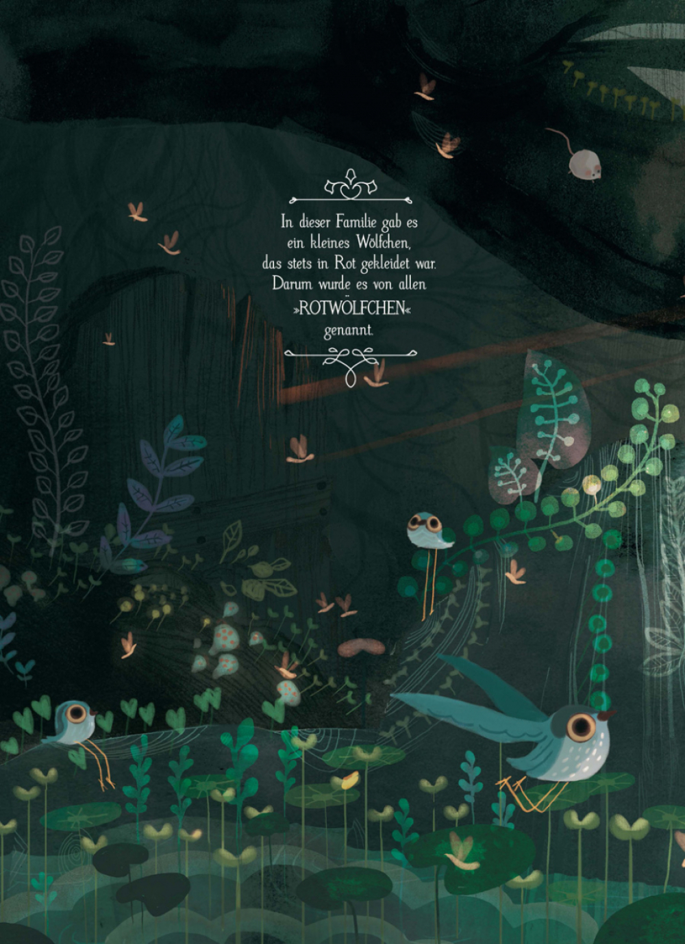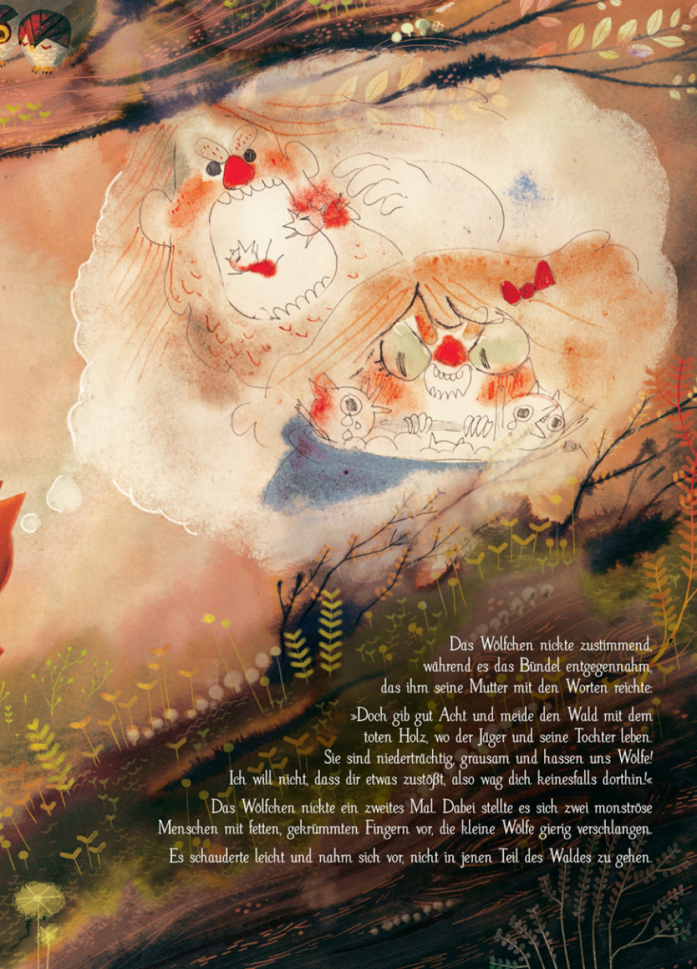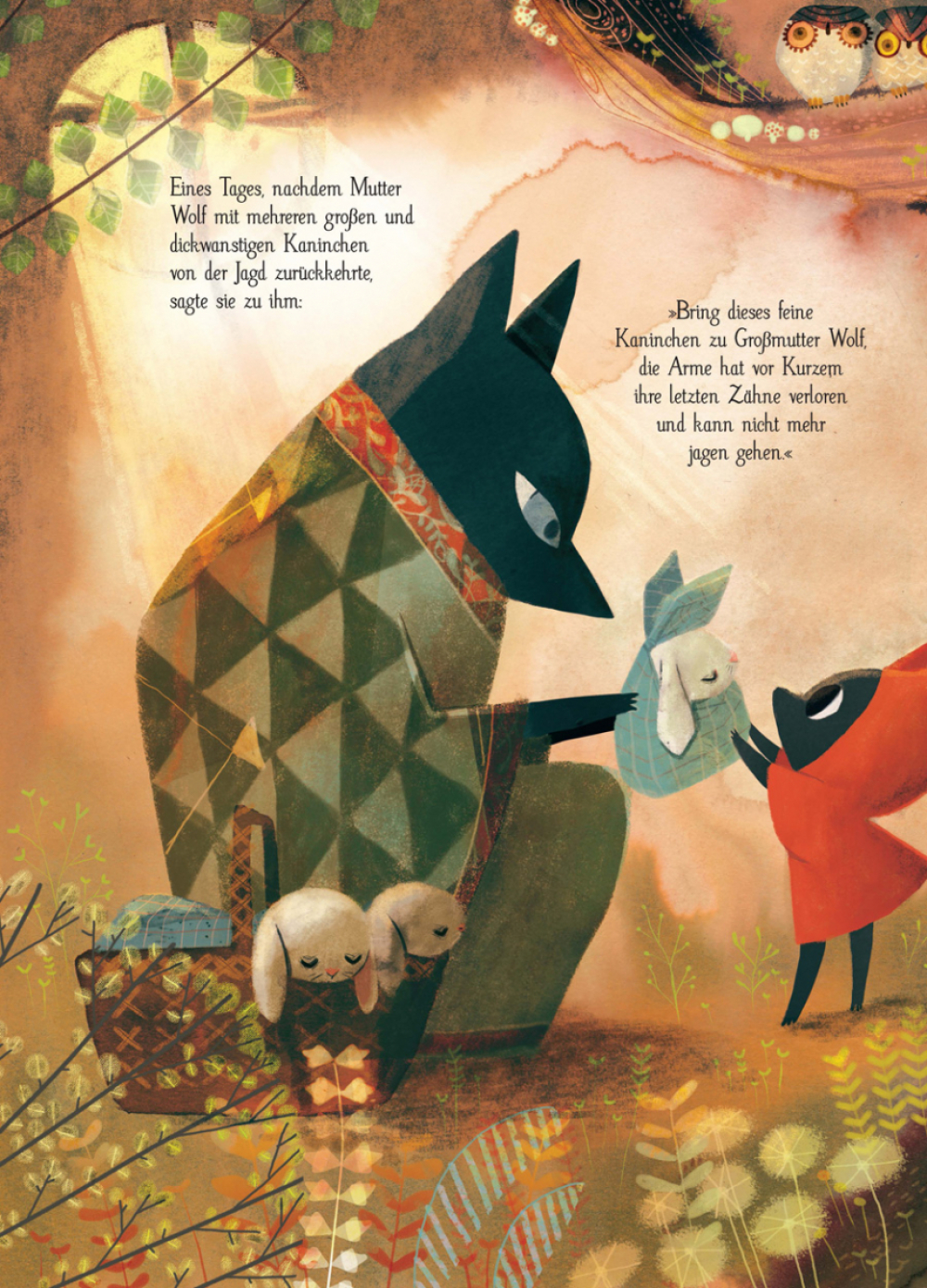 Es war einmal eine Wolfsmutter, die schickte ihr Junges in den Wald, um seiner Großmutter ein Kaninchen zu bringen, denn die war zum Jagen viel zu alt. Auf dem Weg sollte das Wolfsjunge, das von allen nur Rotwölfchen genannt wurde, weil es so einen schönen roten Mantel trug, sich vor den Menschen hüten: vor dem großen, bösen Jäger und seiner Tochter. Doch überkam Rotwölfchen ein furchtbarer Hunger, und so aß es das Kaninchen ganz allein auf. Verzweifelt folgte es einem kleinen Mädchen, das ihm Hilfe versprach und dabei eine erstaunliche Geschichte erzählte…