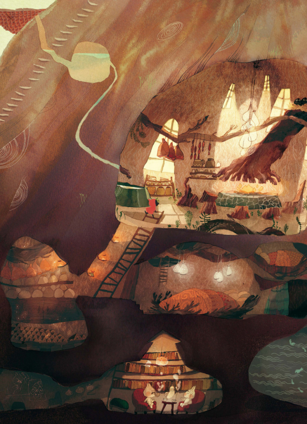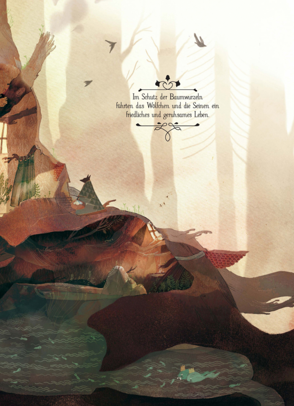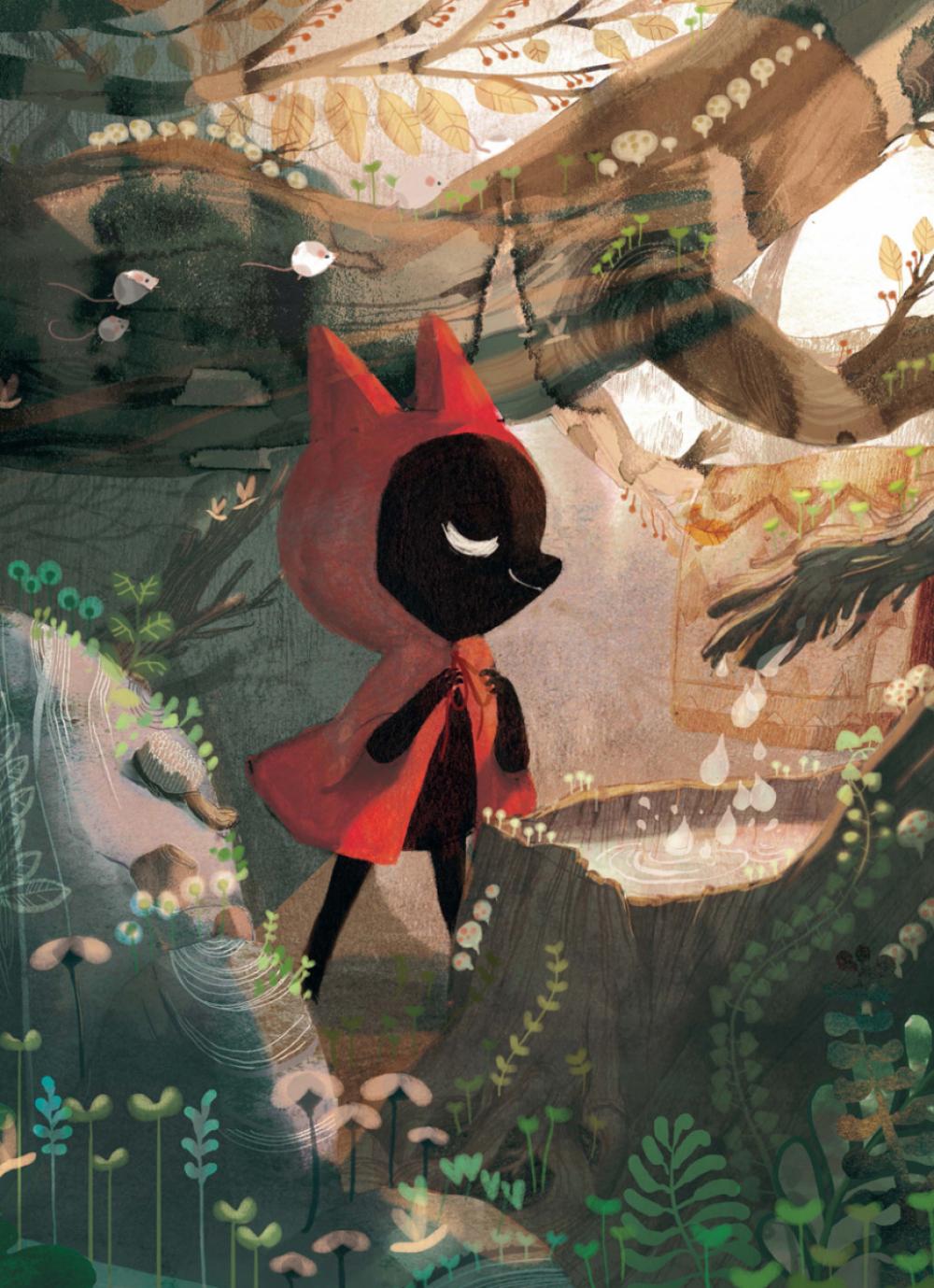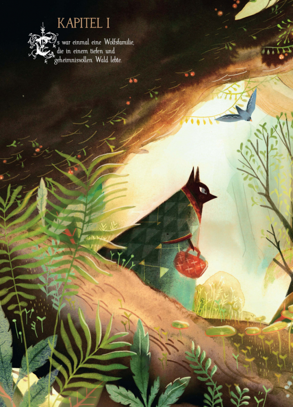 Es war einmal eine Wolfsmutter, die schickte ihr Junges in den Wald, um seiner Großmutter ein Kaninchen zu bringen, denn die war zum Jagen viel zu alt. Auf dem Weg sollte das Wolfsjunge, das von allen nur Rotwölfchen genannt wurde, weil es so einen schönen roten Mantel trug, sich vor den Menschen hüten: vor dem großen, bösen Jäger und seiner Tochter. Doch überkam Rotwölfchen ein furchtbarer Hunger, und so aß es das Kaninchen ganz allein auf. Verzweifelt folgte es einem kleinen Mädchen, das ihm Hilfe versprach und dabei eine erstaunliche Geschichte erzählte…