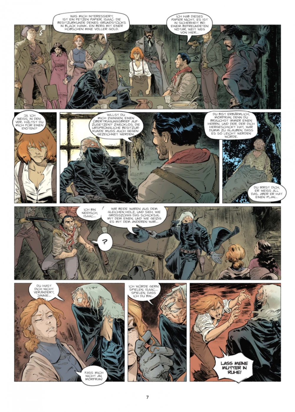 Sechs grundverschiedene Menschen haben sich zu einer bunt zusammengewürfelten – manche würden sagen: dysfunktionalen – Truppe zusammengerauft. Und jeder von ihnen hütet ein dunkles Geheimnis. Wie die meisten Bewohner des Wilden Westens werden diese Antihelden von einer simplen Motivation getrieben, nämlich zu überleben. Und, wenn möglich, reich zu werden. Ihr Ziel ist es, die Mine zu erreichen, die der einäugige Jungspund Kid geerbt hat: ein Ort mit einem schaurigen Ruf, eine alte Grabstätte für Arapaho-Krieger, ein Ort, der die Bergleute, die sich dorthin gewagt haben, in den Wahnsinn getrieben hat. Aber zunächst müssen die Sechs lebend dort ankommen...